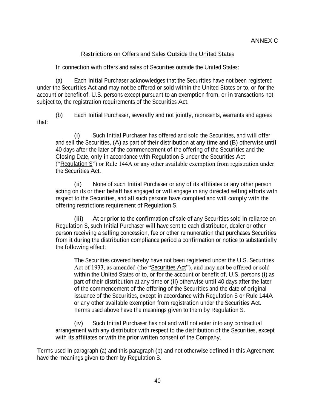 40 ANNEX C Restrictions on Offers and Sales Outside the United States In connection with offers and sales of Securities outside the United States: (a) Each Initial Purchaser acknowledges that the Securities have not been registered under the Securities Act and may not be offered or sold within the United States or to, or for the account or benefit of, U.S. persons except pursuant to an exemption from, or in transactions not subject to, the registration requirements of the Securities Act. (b) Each Initial Purchaser, severally and not jointly, represents, warrants and agrees that: (i) Such Initial Purchaser has offered and sold the Securities, and will offer and sell the Securities, (A) as part of their distribution at any time and (B) otherwise until 40 days after the later of the commencement of the offering of the Securities and the Closing Date, only in accordance with Regulation S under the Securities Act (“Regulation S”) or Rule 144A or any other available exemption from registration under the Securities Act. (ii) None of such Initial Purchaser or any of its affiliates or any other person acting on its or their behalf has engaged or will engage in any directed selling efforts with respect to the Securities, and all such persons have complied and will comply with the offering restrictions requirement of Regulation S. (iii) At or prior to the confirmation of sale of any Securities sold in reliance on Regulation S, such Initial Purchaser will have sent to each distributor, dealer or other person receiving a selling concession, fee or other remuneration that purchases Securities from it during the distribution compliance period a confirmation or notice to substantially the following effect: The Securities covered hereby have not been registered under the U.S. Securities Act of 1933, as amended (the “Securities Act”), and may not be offered or sold within the United States or to, or for the account or benefit of, U.S. persons (i) as part of their distribution at any time or (ii) otherwise until 40 days after the later of the commencement of the offering of the Securities and the date of original issuance of the Securities, except in accordance with Regulation S or Rule 144A or any other available exemption from registration under the Securities Act. Terms used above have the meanings given to them by Regulation S. (iv) Such Initial Purchaser has not and will not enter into any contractual arrangement with any distributor with respect to the distribution of the Securities, except with its affiliates or with the prior written consent of the Company. Terms used in paragraph (a) and this paragraph (b) and not otherwise defined in this Agreement have the meanings given to them by Regulation S.