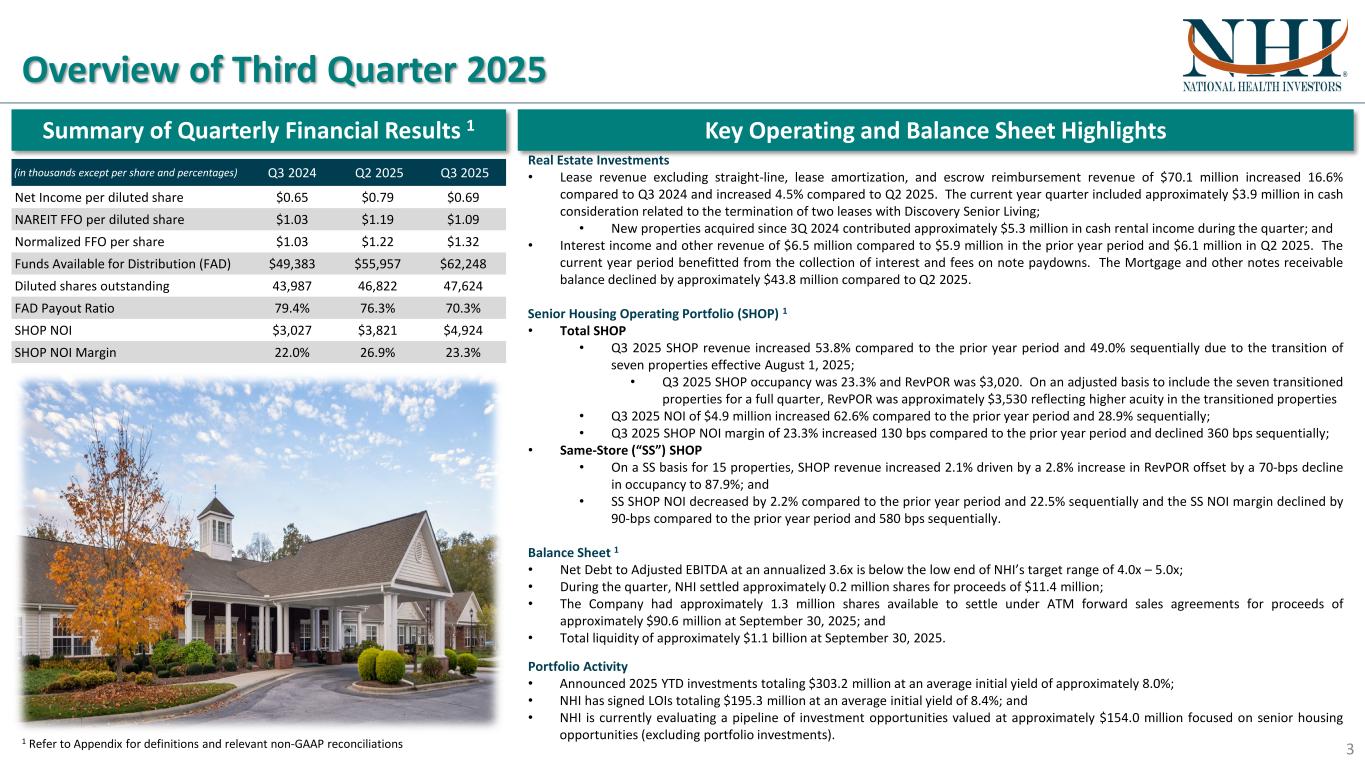 Disclaimers This presentation, as well as information included in oral statements made, or to be made, by our senior management contain forward- looking statements that are based on current expectations, estimates, beliefs and assumptions. Words such as “may,” “will,” “anticipates,” “expects,” “intends,” “plans,” “believes,” “seeks,” “estimates” and variations of these words and similar expressions are intended to identify forward-looking statements. These statements are not guarantees of future performance and are subject to risks, uncertainties and other factors, some of which are beyond our control and difficult to predict and could cause actual results to differ materially from those expressed or implied in the forward-looking statements. Although we believe that the assumptions on which these forward-looking statements are based are reasonable, any of those assumptions could prove to be inaccurate, and as a result, the forward-looking statements based on those assumptions also could be inaccurate. While we may elect to update these forward-looking statements at some point in the future, we disclaim any obligation to do so, except as may be required by law, even if our estimates or assumptions change. In light of these and other uncertainties, the inclusion of a forward-looking statement in this presentation should not be regarded as a representation by us that our plans and objectives will be achieved. You should not place undue reliance on these forward-looking statements. Factors which could cause our actual results to be materially different from those in or implied by the forward looking statements we make, many of which are beyond our control, include, among other things, the operating success of our managers, tenants and borrowers for collection of our lease and interest income; the success of property development and construction activities; risks associated with pandemics, epidemics or outbreak; the risk that the cash flows of our tenants, managers and borrowers may be adversely affected by increased liability claims and liability insurance costs; risks related to environmental laws and the costs associated with liabilities related to hazardous substances; the risk of damage from catastrophic weather and other natural or man-made disasters and the physical effects of climate change; our ability to reinvest cash in real estate investments in a timely manner and on acceptable terms; the risk that the illiquidity of real estate investments could impede our ability to respond to adverse changes in the performance of our properties; operational risks with respect to our senior housing operating portfolio structured communities; risks related to our ability to maintain the privacy and security of Company information; our ability to continue to qualify for taxation as a real estate investment trust; and other risks which are described under the heading “Risk Factors” in Item 1A in our Form 10-K for the year ended December 31, 2024 and under the heading “Risk Factors” in Item 1A in our Form 10-Q for the quarter ended September 30, 2025. In this presentation we refer to non-GAAP financial measures. These non-GAAP measures are not prepared in accordance with generally accepted accounting principles. Reconciliations to certain non-GAAP measures can be found at the end of this presentation, in the Company’s quarterly supplementals which can be found on our website at www.nhireit.com, and in our quarterly Form 10-Q filings and annual Form 10-K filing. Throughout this presentation, certain abbreviations and acronyms are used to simplify the format. A list of definitions is provided at the end of this presentation to clarify the meaning of any reference that may be ambiguous. 2