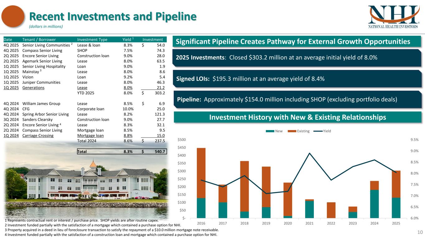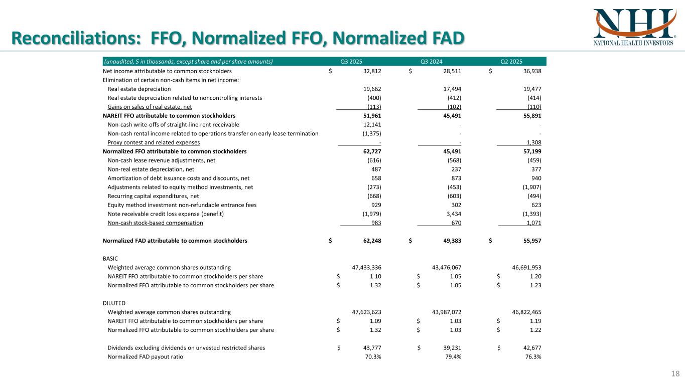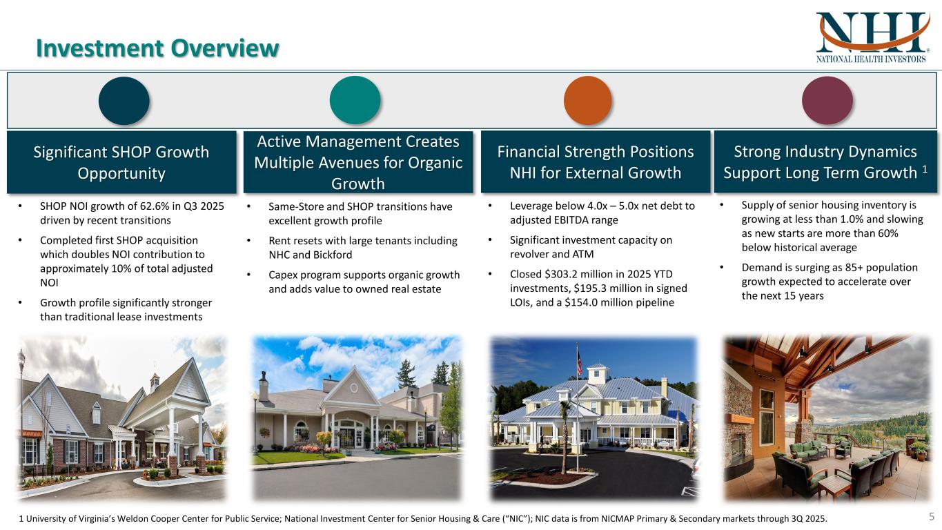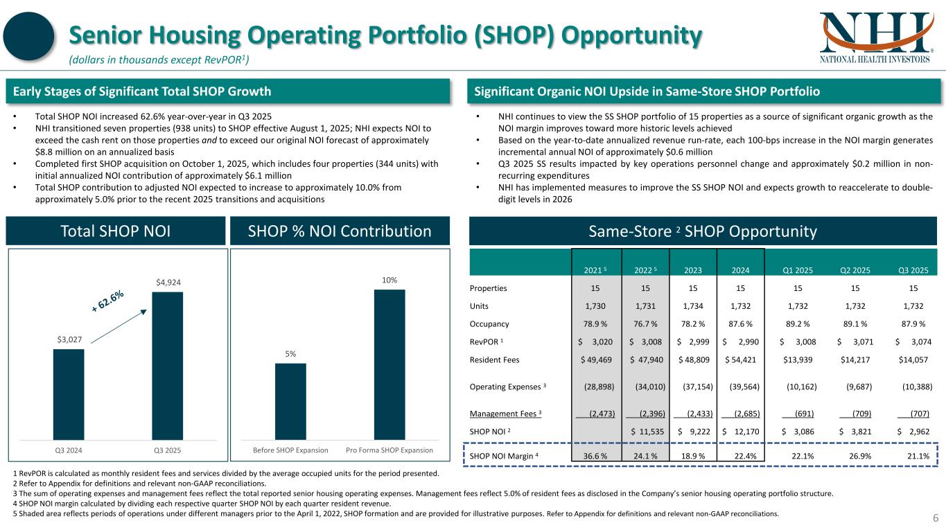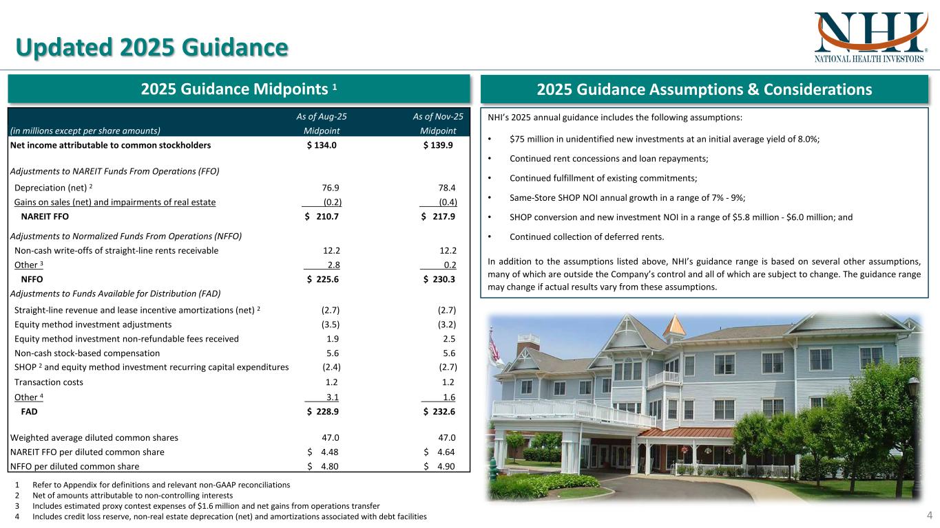 Overview of Third Quarter 2025 3 Real Estate Investments • Lease revenue excluding straight-line, lease amortization, and escrow reimbursement revenue of $70.1 million increased 16.6% compared to Q3 2024 and increased 4.5% compared to Q2 2025. The current year quarter included approximately $3.9 million in cash consideration related to the termination of two leases with Discovery Senior Living; • New properties acquired since 3Q 2024 contributed approximately $5.3 million in cash rental income during the quarter; and • Interest income and other revenue of $6.5 million compared to $5.9 million in the prior year period and $6.1 million in Q2 2025. The current year period benefitted from the collection of interest and fees on note paydowns. The Mortgage and other notes receivable balance declined by approximately $43.8 million compared to Q2 2025. Senior Housing Operating Portfolio (SHOP) 1 • Total SHOP • Q3 2025 SHOP revenue increased 53.8% compared to the prior year period and 49.0% sequentially due to the transition of seven properties effective August 1, 2025; • Q3 2025 SHOP occupancy was 23.3% and RevPOR was $3,020. On an adjusted basis to include the seven transitioned properties for a full quarter, RevPOR was approximately $3,530 reflecting higher acuity in the transitioned properties • Q3 2025 NOI of $4.9 million increased 62.6% compared to the prior year period and 28.9% sequentially; • Q3 2025 SHOP NOI margin of 23.3% increased 130 bps compared to the prior year period and declined 360 bps sequentially; • Same-Store (“SS”) SHOP • On a SS basis for 15 properties, SHOP revenue increased 2.1% driven by a 2.8% increase in RevPOR offset by a 70-bps decline in occupancy to 87.9%; and • SS SHOP NOI decreased by 2.2% compared to the prior year period and 22.5% sequentially and the SS NOI margin declined by 90-bps compared to the prior year period and 580 bps sequentially. Balance Sheet 1 • Net Debt to Adjusted EBITDA at an annualized 3.6x is below the low end of NHI’s target range of 4.0x – 5.0x; • During the quarter, NHI settled approximately 0.2 million shares for proceeds of $11.4 million; • The Company had approximately 1.3 million shares available to settle under ATM forward sales agreements for proceeds of approximately $90.6 million at September 30, 2025; and • Total liquidity of approximately $1.1 billion at September 30, 2025. Portfolio Activity • Announced 2025 YTD investments totaling $303.2 million at an average initial yield of approximately 8.0%; • NHI has signed LOIs totaling $195.3 million at an average initial yield of 8.4%; and • NHI is currently evaluating a pipeline of investment opportunities valued at approximately $154.0 million focused on senior housing opportunities (excluding portfolio investments). Summary of Quarterly Financial Results 1 Key Operating and Balance Sheet Highlights (in thousands except per share and percentages) Q3 2024 Q2 2025 Q3 2025 Net Income per diluted share $0.65 $0.79 $0.69 NAREIT FFO per diluted share $1.03 $1.19 $1.09 Normalized FFO per share $1.03 $1.22 $1.32 Funds Available for Distribution (FAD) $49,383 $55,957 $62,248 Diluted shares outstanding 43,987 46,822 47,624 FAD Payout Ratio 79.4% 76.3% 70.3% SHOP NOI $3,027 $3,821 $4,924 SHOP NOI Margin 22.0% 26.9% 23.3% 1 Refer to Appendix for definitions and relevant non-GAAP reconciliations