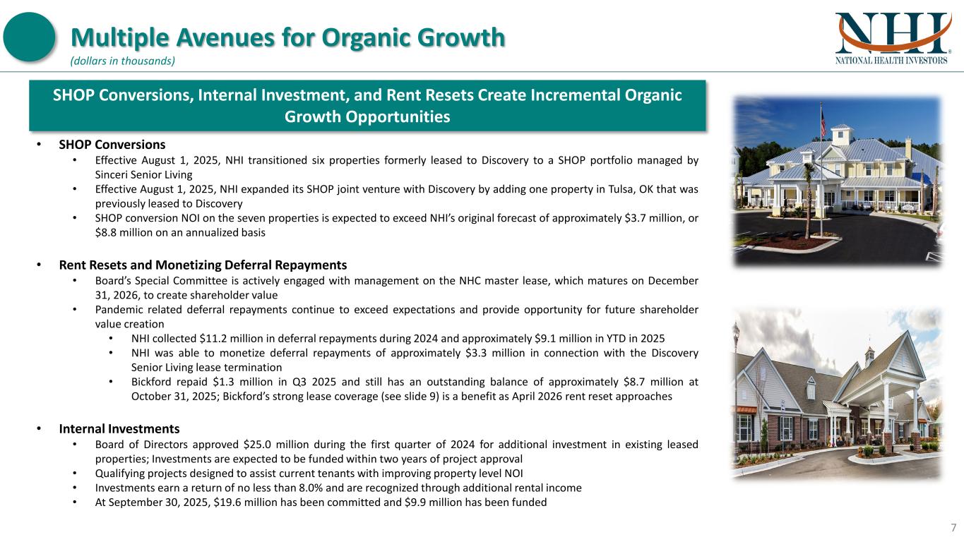 Senior Housing Operating Portfolio (SHOP) Opportunity 6 (dollars in thousands except RevPOR1) • NHI continues to view the SS SHOP portfolio of 15 properties as a source of significant organic growth as the NOI margin improves toward more historic levels achieved • Based on the year-to-date annualized revenue run-rate, each 100-bps increase in the NOI margin generates incremental annual NOI of approximately $0.6 million • Q3 2025 SS results impacted by key operations personnel change and approximately $0.2 million in non- recurring expenditures • NHI has implemented measures to improve the SS SHOP NOI and expects growth to reaccelerate to double- digit levels in 2026 Significant Organic NOI Upside in Same-Store SHOP Portfolio 2021 5 2022 5 2023 2024 Q1 2025 Q2 2025 Q3 2025 Properties 15 15 15 15 15 15 15 Units 1,730 1,731 1,734 1,732 1,732 1,732 1,732 Occupancy 78.9 % 76.7 % 78.2 % 87.6 % 89.2 % 89.1 % 87.9 % RevPOR 1 $ 3,020 $ 3,008 $ 2,999 $ 2,990 $ 3,008 $ 3,071 $ 3,074 Resident Fees $ 49,469 $ 47,940 $ 48,809 $ 54,421 $13,939 $14,217 $14,057 Operating Expenses 3 (28,898) (34,010) (37,154) (39,564) (10,162) (9,687) (10,388) Management Fees 3 (2,473) (2,396) (2,433) ___(2,685) ___(691) ___(709) ___(707) SHOP NOI 2 $ 11,535 $ 9,222 $ 12,170 $ 3,086 $ 3,821 $ 2,962 SHOP NOI Margin 4 36.6 % 24.1 % 18.9 % 22.4% 22.1% 26.9% 21.1% 1 RevPOR is calculated as monthly resident fees and services divided by the average occupied units for the period presented. 2 Refer to Appendix for definitions and relevant non-GAAP reconciliations. 3 The sum of operating expenses and management fees reflect the total reported senior housing operating expenses. Management fees reflect 5.0% of resident fees as disclosed in the Company’s senior housing operating portfolio structure. 4 SHOP NOI margin calculated by dividing each respective quarter SHOP NOI by each quarter resident revenue. 5 Shaded area reflects periods of operations under different managers prior to the April 1, 2022, SHOP formation and are provided for illustrative purposes. Refer to Appendix for definitions and relevant non-GAAP reconciliations. Early Stages of Significant Total SHOP Growth • Total SHOP NOI increased 62.6% year-over-year in Q3 2025 • NHI transitioned seven properties (938 units) to SHOP effective August 1, 2025; NHI expects NOI to exceed the cash rent on those properties and to exceed our original NOI forecast of approximately $8.8 million on an annualized basis • Completed first SHOP acquisition on October 1, 2025, which includes four properties (344 units) with initial annualized NOI contribution of approximately $6.1 million • Total SHOP contribution to adjusted NOI expected to increase to approximately 10.0% from approximately 5.0% prior to the recent 2025 transitions and acquisitions $3,027 $4,924 Q3 2024 Q3 2025 5% 10% Before SHOP Expansion Pro Forma SHOP Expansion Total SHOP NOI SHOP % NOI Contribution Same-Store 2 SHOP Opportunity