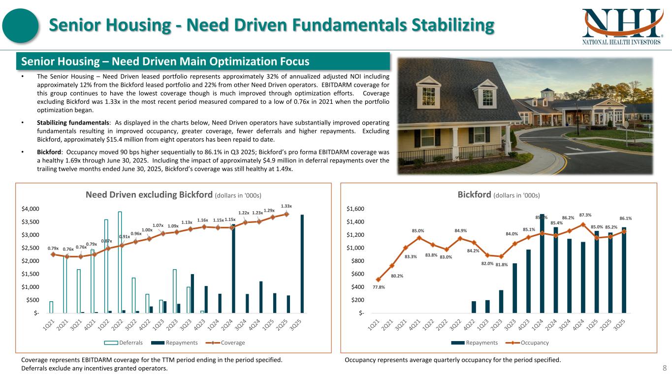 Multiple Avenues for Organic Growth 7 • SHOP Conversions • Effective August 1, 2025, NHI transitioned six properties formerly leased to Discovery to a SHOP portfolio managed by Sinceri Senior Living • Effective August 1, 2025, NHI expanded its SHOP joint venture with Discovery by adding one property in Tulsa, OK that was previously leased to Discovery • SHOP conversion NOI on the seven properties is expected to exceed NHI’s original forecast of approximately $3.7 million, or $8.8 million on an annualized basis • Rent Resets and Monetizing Deferral Repayments • Board’s Special Committee is actively engaged with management on the NHC master lease, which matures on December 31, 2026, to create shareholder value • Pandemic related deferral repayments continue to exceed expectations and provide opportunity for future shareholder value creation • NHI collected $11.2 million in deferral repayments during 2024 and approximately $9.1 million in YTD in 2025 • NHI was able to monetize deferral repayments of approximately $3.3 million in connection with the Discovery Senior Living lease termination • Bickford repaid $1.3 million in Q3 2025 and still has an outstanding balance of approximately $8.7 million at October 31, 2025; Bickford’s strong lease coverage (see slide 9) is a benefit as April 2026 rent reset approaches • Internal Investments • Board of Directors approved $25.0 million during the first quarter of 2024 for additional investment in existing leased properties; Investments are expected to be funded within two years of project approval • Qualifying projects designed to assist current tenants with improving property level NOI • Investments earn a return of no less than 8.0% and are recognized through additional rental income • At September 30, 2025, $19.6 million has been committed and $9.9 million has been funded SHOP Conversions, Internal Investment, and Rent Resets Create Incremental Organic Growth Opportunities (dollars in thousands)
