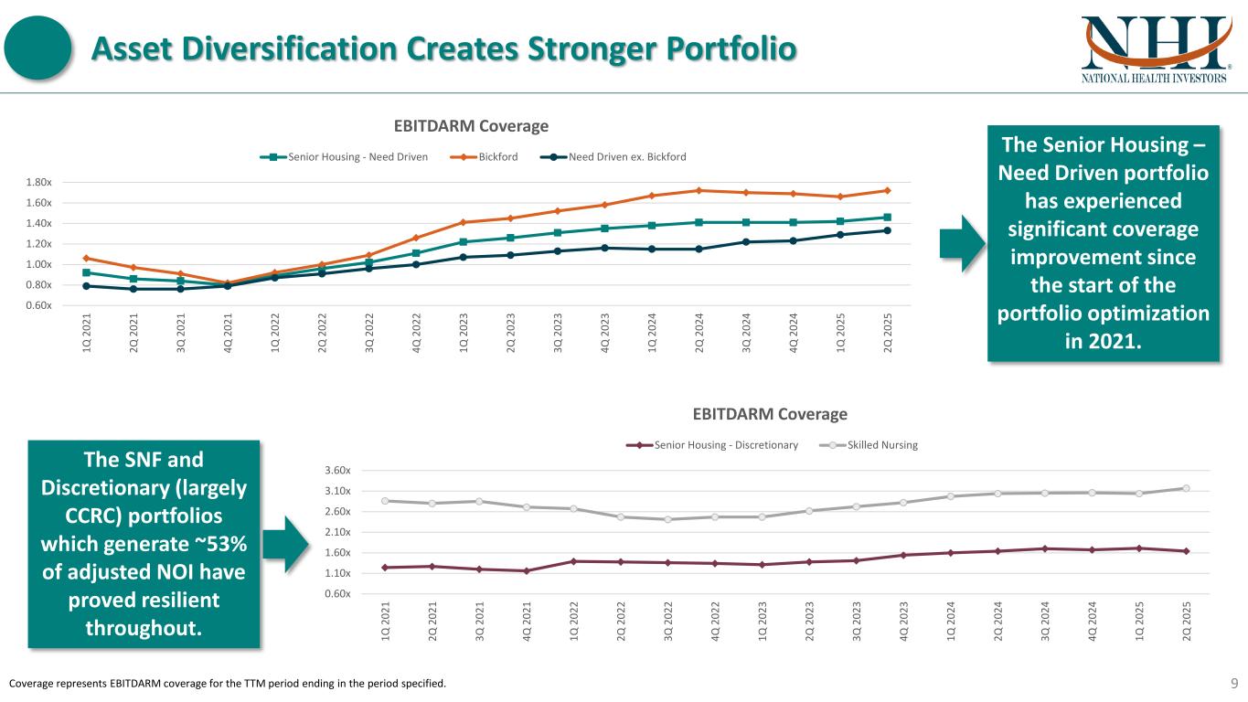 Senior Housing - Need Driven Fundamentals Stabilizing 8 • The Senior Housing – Need Driven leased portfolio represents approximately 32% of annualized adjusted NOI including approximately 12% from the Bickford leased portfolio and 22% from other Need Driven operators. EBITDARM coverage for this group continues to have the lowest coverage though is much improved through optimization efforts. Coverage excluding Bickford was 1.33x in the most recent period measured compared to a low of 0.76x in 2021 when the portfolio optimization began. • Stabilizing fundamentals: As displayed in the charts below, Need Driven operators have substantially improved operating fundamentals resulting in improved occupancy, greater coverage, fewer deferrals and higher repayments. Excluding Bickford, approximately $15.4 million from eight operators has been repaid to date. • Bickford: Occupancy moved 90 bps higher sequentially to 86.1% in Q3 2025; Bickford’s pro forma EBITDARM coverage was a healthy 1.69x through June 30, 2025. Including the impact of approximately $4.9 million in deferral repayments over the trailing twelve months ended June 30, 2025, Bickford’s coverage was still healthy at 1.49x. Senior Housing – Need Driven Main Optimization Focus Coverage represents EBITDARM coverage for the TTM period ending in the period specified. Deferrals exclude any incentives granted operators. Occupancy represents average quarterly occupancy for the period specified. 0.79x 0.76x 0.76x0.79x 0.87x 0.91x 0.96x 1.00x 1.07x 1.09x 1.13x 1.16x 1.15x 1.15x 1.22x 1.23x 1.29x 1.33x 0.00x 0.20x 0.40x 0.60x 0.80x 1.00x 1.20x 1.40x $- $500 $1,000 $1,500 $2,000 $2,500 $3,000 $3,500 $4,000 Need Driven excluding Bickford (dollars in '000s) Deferrals Repayments Coverage 77.8% 80.2% 83.3% 85.0% 83.8% 83.0% 84.9% 84.2% 82.0% 81.8% 84.0% 85.1% 85.8% 85.4% 86.2% 87.3% 85.0% 85.2% 86.1% 72.0% 74.0% 76.0% 78.0% 80.0% 82.0% 84.0% 86.0% 88.0% 90.0% $- $200 $400 $600 $800 $1,000 $1,200 $1,400 $1,600 Bickford (dollars in '000s) Repayments Occupancy