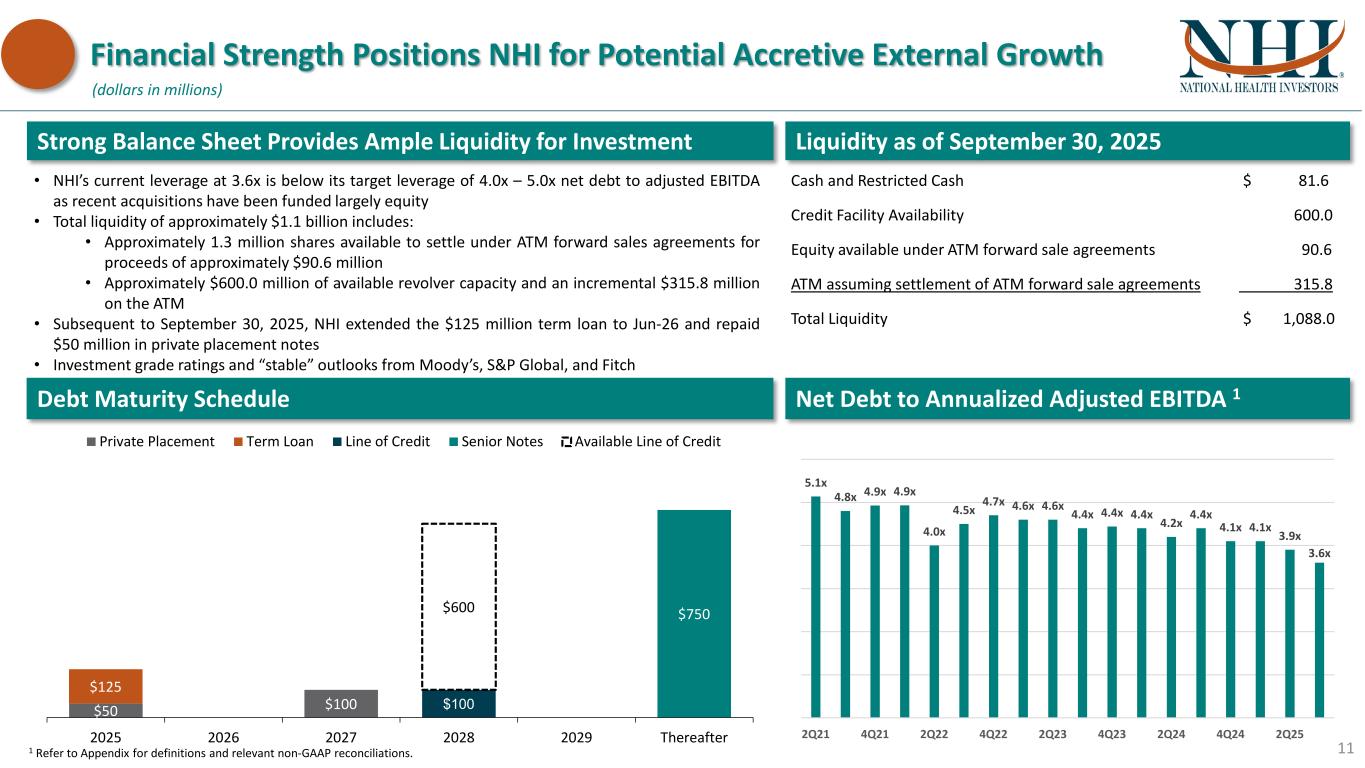 2025 Investments: Closed $303.2 million at an average initial yield of 8.0% Recent Investments and Pipeline Significant Pipeline Creates Pathway for External Growth Opportunities 10 (dollars in millions) 1 Represents contractual rent or interest / purchase price. SHOP yields are after routine capex. 2 Investment funded partially with the satisfaction of a mortgage which contained a purchase option for NHI. 3 Property acquired in a deed in lieu of foreclosure transaction to satisfy the repayment of a $10.0 million mortgage note receivable. 4 Investment funded partially with the satisfaction of a construction loan and mortgage which contained a purchase option for NHI. Investment History with New & Existing Relationships Pipeline: Approximately $154.0 million including SHOP (excluding portfolio deals) Signed LOIs: $195.3 million at an average yield of 8.4% Date Tenant / Borrower Investment Type Yield 1 Investment 4Q 2025 Senior Living Communities 2 Lease & loan 8.3% $ 54.0 4Q 2025 Compass Senior Living SHOP 7.5% 74.3 2Q 2025 Encore Senior Living Construction loan 9.0% 28.0 2Q 2025 Agemark Senior Living Lease 8.0% 63.5 1Q 2025 Senior Living Hospitality Loan 9.0% 1.9 1Q 2025 Mainstay 3 Lease 8.0% 8.6 1Q 2025 Vizion Loan 9.2% 5.4 1Q 2025 Juniper Communities Lease 8.0% 46.3 1Q 2025 Generations Lease 8.0% 21.2 YTD 2025 8.0% $ 303.2 4Q 2024 William James Group Lease 8.5% $ 6.9 4Q 2024 CFG Corporate loan 10.0% 25.0 4Q 2024 Spring Arbor Senior Living Lease 8.2% 121.3 3Q 2024 Sanders Clearsky Construction loan 9.0% 27.7 2Q 2024 Encore Senior Living 4 Lease 8.3% 32.1 2Q 2024 Compass Senior Living Mortgage loan 8.5% 9.5 1Q 2024 Carriage Crossing Mortgage loan 8.8% 15.0 Total 2024 8.6% $ 237.5 Total 8.3% $ 540.7 6.0% 6.5% 7.0% 7.5% 8.0% 8.5% 9.0% 9.5% $- $50 $100 $150 $200 $250 $300 $350 $400 $450 $500 2016 2017 2018 2019 2020 2021 2022 2023 2024 2025 New Existing Yield