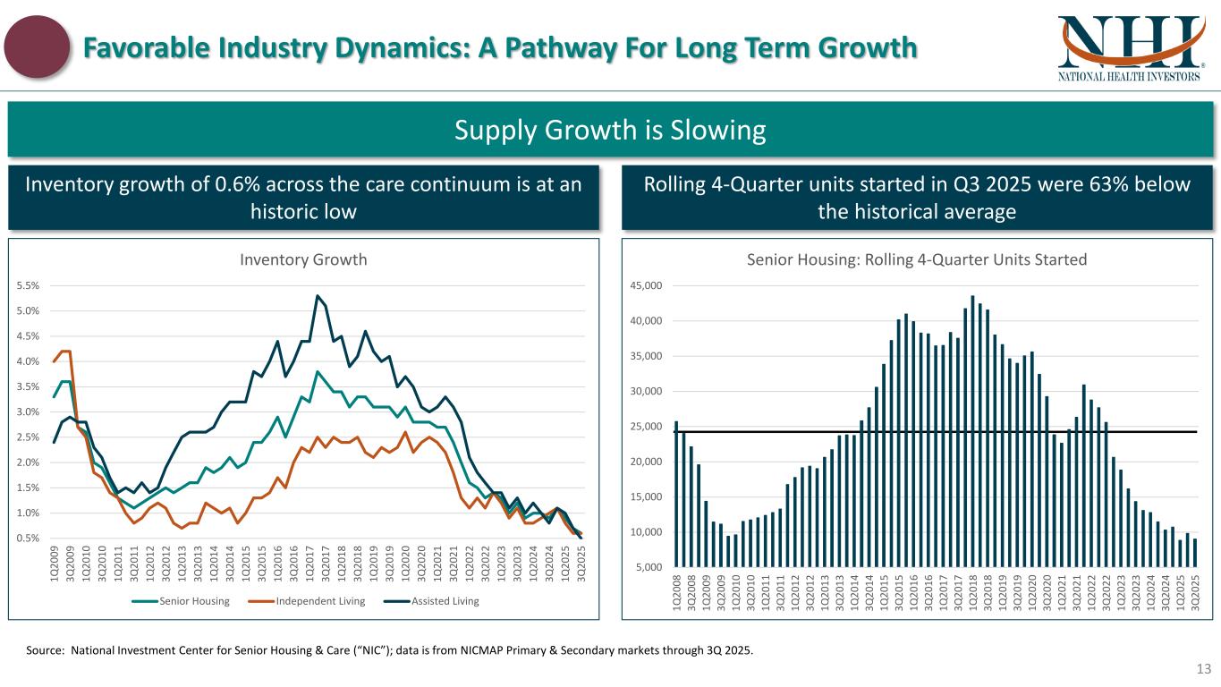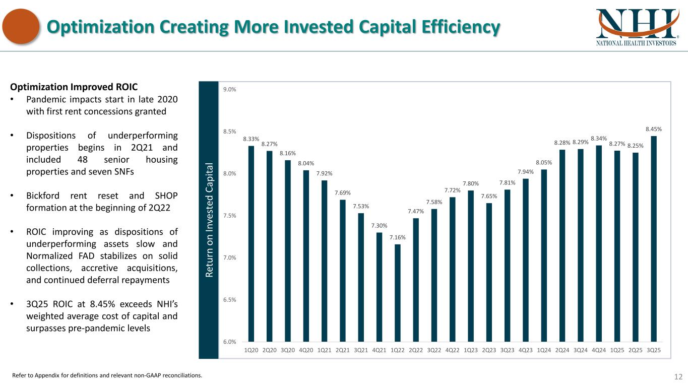 Financial Strength Positions NHI for Potential Accretive External Growth Strong Balance Sheet Provides Ample Liquidity for Investment • NHI’s current leverage at 3.6x is below its target leverage of 4.0x – 5.0x net debt to adjusted EBITDA as recent acquisitions have been funded largely equity • Total liquidity of approximately $1.1 billion includes: • Approximately 1.3 million shares available to settle under ATM forward sales agreements for proceeds of approximately $90.6 million • Approximately $600.0 million of available revolver capacity and an incremental $315.8 million on the ATM • Subsequent to September 30, 2025, NHI extended the $125 million term loan to Jun-26 and repaid $50 million in private placement notes • Investment grade ratings and “stable” outlooks from Moody’s, S&P Global, and Fitch 11 Net Debt to Annualized Adjusted EBITDA 1 (dollars in millions) Liquidity as of September 30, 2025 1 Refer to Appendix for definitions and relevant non-GAAP reconciliations. Debt Maturity Schedule Cash and Restricted Cash $ 81.6 Credit Facility Availability 600.0 Equity available under ATM forward sale agreements 90.6 ATM assuming settlement of ATM forward sale agreements 315.8 Total Liquidity $ 1,088.0 $50 $100 $125 $100 $750$600 2025 2026 2027 2028 2029 Thereafter Private Placement Term Loan Line of Credit Senior Notes Available Line of Credit 5.1x 4.8x 4.9x 4.9x 4.0x 4.5x 4.7x 4.6x 4.6x 4.4x 4.4x 4.4x 4.2x 4.4x 4.1x 4.1x 3.9x 3.6x 2Q21 4Q21 2Q22 4Q22 2Q23 4Q23 2Q24 4Q24 2Q25