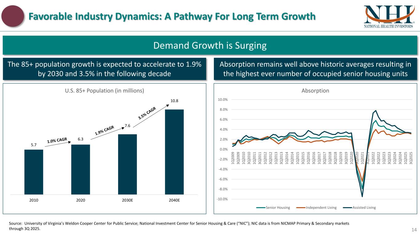 Favorable Industry Dynamics: A Pathway For Long Term Growth 13 Supply Growth is Slowing Inventory growth of 0.6% across the care continuum is at an historic low Rolling 4-Quarter units started in Q3 2025 were 63% below the historical average Source: National Investment Center for Senior Housing & Care (“NIC”); data is from NICMAP Primary & Secondary markets through 3Q 2025. 0.5% 1.0% 1.5% 2.0% 2.5% 3.0% 3.5% 4.0% 4.5% 5.0% 5.5% 1Q 20 09 3Q 20 09 1Q 20 10 3Q 20 10 1Q 20 11 3Q 20 11 1Q 20 12 3Q 20 12 1Q 20 13 3Q 20 13 1Q 20 14 3Q 20 14 1Q 20 15 3Q 20 15 1Q 20 16 3Q 20 16 1Q 20 17 3Q 20 17 1Q 20 18 3Q 20 18 1Q 20 19 3Q 20 19 1Q 20 20 3Q 20 20 1Q 20 21 3Q 20 21 1Q 20 22 3Q 20 22 1Q 20 23 3Q 20 23 1Q 20 24 3Q 20 24 1Q 20 25 3Q 20 25 Inventory Growth Senior Housing Independent Living Assisted Living 5,000 10,000 15,000 20,000 25,000 30,000 35,000 40,000 45,000 1Q 20 08 3Q 20 08 1Q 20 09 3Q 20 09 1Q 20 10 3Q 20 10 1Q 20 11 3Q 20 11 1Q 20 12 3Q 20 12 1Q 20 13 3Q 20 13 1Q 20 14 3Q 20 14 1Q 20 15 3Q 20 15 1Q 20 16 3Q 20 16 1Q 20 17 3Q 20 17 1Q 20 18 3Q 20 18 1Q 20 19 3Q 20 19 1Q 20 20 3Q 20 20 1Q 20 21 3Q 20 21 1Q 20 22 3Q 20 22 1Q 20 23 3Q 20 23 1Q 20 24 3Q 20 24 1Q 20 25 3Q 20 25 Senior Housing: Rolling 4-Quarter Units Started