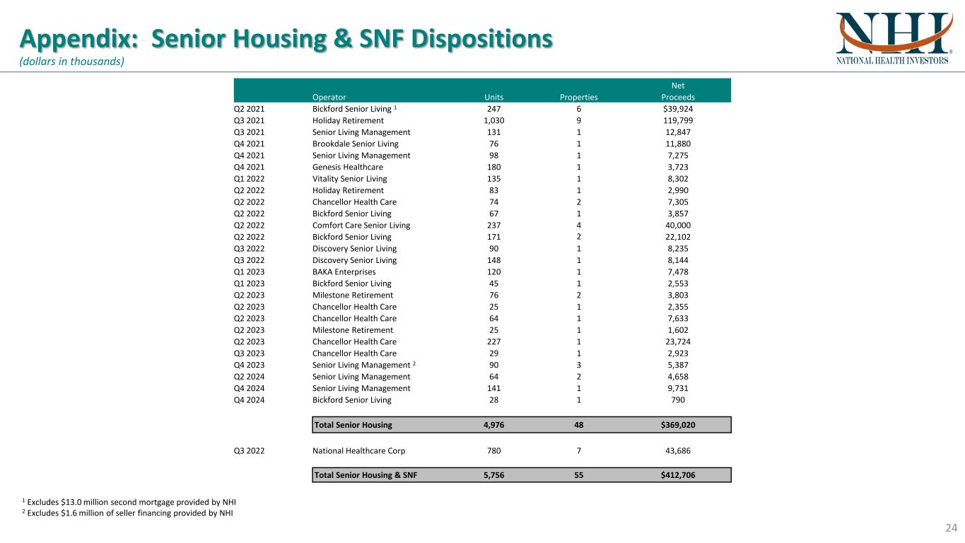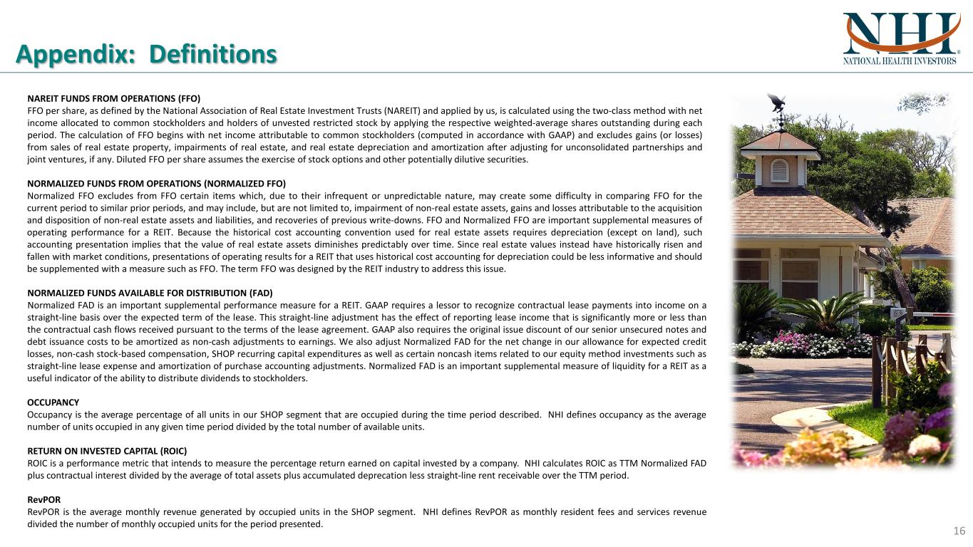 Appendix: Definitions 15 ADJUSTED EBITDA & EBITDARM NHI considers Adjusted EBITDA to be an important supplemental measure because it provides information which is used to evaluate the Company’s performance and serves as an indication of the ability to service debt. NHI defines Adjusted EBITDA as consolidated earnings before interest, taxes, depreciation and amortization, including amounts in discontinued operations, excluding real estate asset impairments and gains on dispositions and certain items which, due to their infrequent or unpredictable nature, may create some difficulty in comparing Adjusted EBITDA for the current period to similar prior periods, and may include, but are not limited to, impairment of non-real estate assets, gains and losses attributable to the acquisition and disposition of assets and liabilities, and recoveries of previous write- downs. Adjusted EBITDA also includes NHI’s proportionate share of unconsolidated equity method investments presented on a similar basis. Since others may not use the Company’s definition of Adjusted EBITDA, caution should be exercised when comparing NHI’s Adjusted EBITDA to that of other companies. EBITDARM is earnings before interest, taxes, depreciation, amortization, rent and management fees. ADJUSTED NET OPERATING INCOME Adjusted net operating income (“Adjusted NOI”) is a non-U.S. GAAP supplemental financial measure used to evaluate the operating performance of real estate. We define Adjusted NOI as total revenues, less straight-line revenue, less corporate interest income, less tenant reimbursements and property operating expenses, and adjusted for non-cash revenue items including, but not limited to, amortization of commitment fees, deferred financing costs and original issue discounts and lease incentive amortization. We believe Adjusted NOI provides investors relevant and useful information as it measures the operating performance of our properties at the property level on an unleveraged basis. We use adjusted NOI to make decisions about resource allocations and to assess the property level performance of our properties. FAD PAYOUT RATIO The Funds Available for Distribution (FAD) payout ratio is a metric used in the REIT (Real Estate Investment Trust) industry to gauge the percentage of FAD that a company distributes to shareholders as dividends. The FAD payout ratio is calculated by dividing the company’s accrued dividends payable to common stockholders by its FAD for the period indicated. NET OPERATING INCOME Net operating income (“NOI”) is a non-U.S. GAAP supplemental financial measure used to evaluate the operating performance of real estate. NHI defines NOI as total revenues, less tenant reimbursements and property operating expenses. The Company believes NOI provides investors relevant and useful information as it measures the operating performance of properties at the property level on an unleveraged basis. NHI uses NOI to make decisions about resource allocations and to assess the property level performance of our properties. NAREIT FUNDS FROM OPERATIONS (FFO) FFO per share, as defined by the National Association of Real Estate Investment Trusts (NAREIT) and applied by us, is calculated using the two-class method with net income allocated to common stockholders and holders of unvested restricted stock by applying the respective weighted-average shares outstanding during each period. The calculation of FFO begins with net income attributable to common stockholders (computed in accordance with GAAP) and excludes gains (or losses) from sales of real estate property, impairments of real estate, and real estate depreciation and amortization after adjusting for unconsolidated partnerships and joint ventures, if any. Diluted FFO per share assumes the exercise of stock options and other potentially dilutive securities.