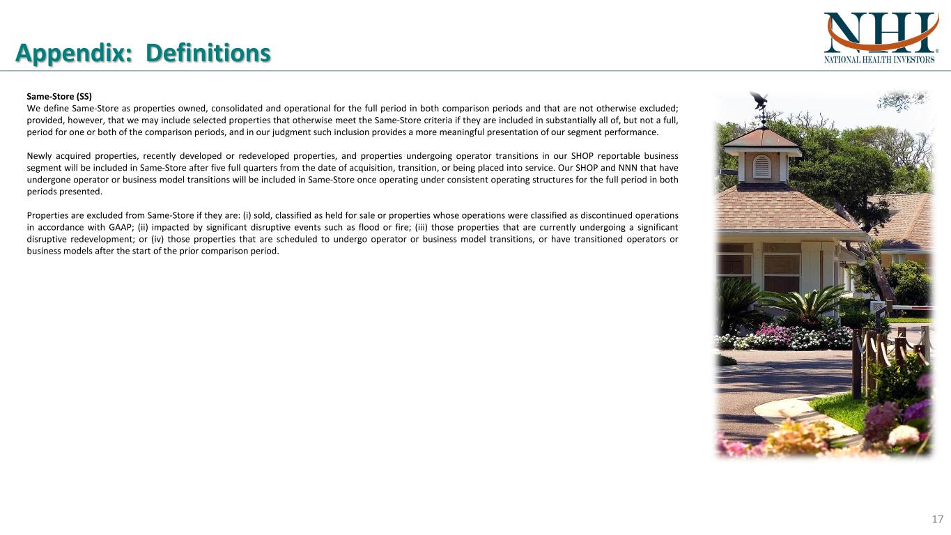 Appendix: Definitions 16 NAREIT FUNDS FROM OPERATIONS (FFO) FFO per share, as defined by the National Association of Real Estate Investment Trusts (NAREIT) and applied by us, is calculated using the two-class method with net income allocated to common stockholders and holders of unvested restricted stock by applying the respective weighted-average shares outstanding during each period. The calculation of FFO begins with net income attributable to common stockholders (computed in accordance with GAAP) and excludes gains (or losses) from sales of real estate property, impairments of real estate, and real estate depreciation and amortization after adjusting for unconsolidated partnerships and joint ventures, if any. Diluted FFO per share assumes the exercise of stock options and other potentially dilutive securities. NORMALIZED FUNDS FROM OPERATIONS (NORMALIZED FFO) Normalized FFO excludes from FFO certain items which, due to their infrequent or unpredictable nature, may create some difficulty in comparing FFO for the current period to similar prior periods, and may include, but are not limited to, impairment of non-real estate assets, gains and losses attributable to the acquisition and disposition of non-real estate assets and liabilities, and recoveries of previous write-downs. FFO and Normalized FFO are important supplemental measures of operating performance for a REIT. Because the historical cost accounting convention used for real estate assets requires depreciation (except on land), such accounting presentation implies that the value of real estate assets diminishes predictably over time. Since real estate values instead have historically risen and fallen with market conditions, presentations of operating results for a REIT that uses historical cost accounting for depreciation could be less informative and should be supplemented with a measure such as FFO. The term FFO was designed by the REIT industry to address this issue. NORMALIZED FUNDS AVAILABLE FOR DISTRIBUTION (FAD) Normalized FAD is an important supplemental performance measure for a REIT. GAAP requires a lessor to recognize contractual lease payments into income on a straight-line basis over the expected term of the lease. This straight-line adjustment has the effect of reporting lease income that is significantly more or less than the contractual cash flows received pursuant to the terms of the lease agreement. GAAP also requires the original issue discount of our senior unsecured notes and debt issuance costs to be amortized as non-cash adjustments to earnings. We also adjust Normalized FAD for the net change in our allowance for expected credit losses, non-cash stock-based compensation, SHOP recurring capital expenditures as well as certain noncash items related to our equity method investments such as straight-line lease expense and amortization of purchase accounting adjustments. Normalized FAD is an important supplemental measure of liquidity for a REIT as a useful indicator of the ability to distribute dividends to stockholders. OCCUPANCY Occupancy is the average percentage of all units in our SHOP segment that are occupied during the time period described. NHI defines occupancy as the average number of units occupied in any given time period divided by the total number of available units. RETURN ON INVESTED CAPITAL (ROIC) ROIC is a performance metric that intends to measure the percentage return earned on capital invested by a company. NHI calculates ROIC as TTM Normalized FAD plus contractual interest divided by the average of total assets plus accumulated deprecation less straight-line rent receivable over the TTM period. RevPOR RevPOR is the average monthly revenue generated by occupied units in the SHOP segment. NHI defines RevPOR as monthly resident fees and services revenue divided the number of monthly occupied units for the period presented.