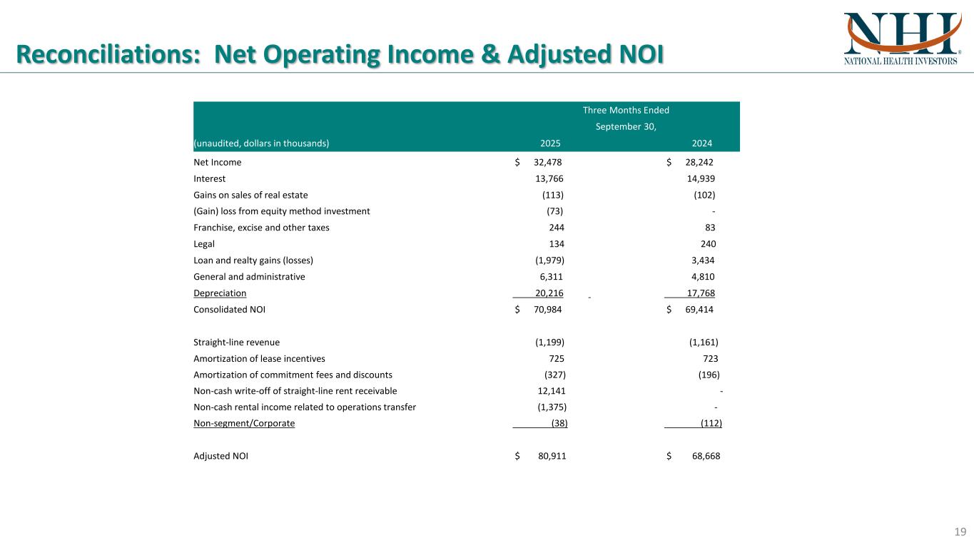 Reconciliations: FFO, Normalized FFO, Normalized FAD 18 (unaudited, $ in thousands, except share and per share amounts) Q3 2025 Q3 2024 Q2 2025 Net income attributable to common stockholders $ 32,812 $ 28,511 $ 36,938 Elimination of certain non-cash items in net income: Real estate depreciation 19,662 17,494 19,477 Real estate depreciation related to noncontrolling interests (400) (412) (414) Gains on sales of real estate, net (113) (102) (110) NAREIT FFO attributable to common stockholders 51,961 45,491 55,891 Non-cash write-offs of straight-line rent receivable 12,141 - - Non-cash rental income related to operations transfer on early lease termination (1,375) - - Proxy contest and related expenses - - 1,308 Normalized FFO attributable to common stockholders 62,727 45,491 57,199 Non-cash lease revenue adjustments, net (616) (568) (459) Non-real estate depreciation, net 487 237 377 Amortization of debt issuance costs and discounts, net 658 873 940 Adjustments related to equity method investments, net (273) (453) (1,907) Recurring capital expenditures, net (668) (603) (494) Equity method investment non-refundable entrance fees 929 302 623 Note receivable credit loss expense (benefit) (1,979) 3,434 (1,393) Non-cash stock-based compensation 983 670 1,071 Normalized FAD attributable to common stockholders $ 62,248 $ 49,383 $ 55,957 BASIC Weighted average common shares outstanding 47,433,336 43,476,067 46,691,953 NAREIT FFO attributable to common stockholders per share $ 1.10 $ 1.05 $ 1.20 Normalized FFO attributable to common stockholders per share $ 1.32 $ 1.05 $ 1.23 DILUTED Weighted average common shares outstanding 47,623,623 43,987,072 46,822,465 NAREIT FFO attributable to common stockholders per share $ 1.09 $ 1.03 $ 1.19 Normalized FFO attributable to common stockholders per share $ 1.32 $ 1.03 $ 1.22 Dividends excluding dividends on unvested restricted shares $ 43,777 $ 39,231 $ 42,677 Normalized FAD payout ratio 70.3% 79.4% 76.3%