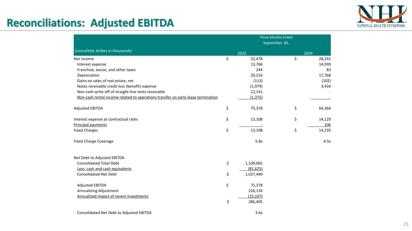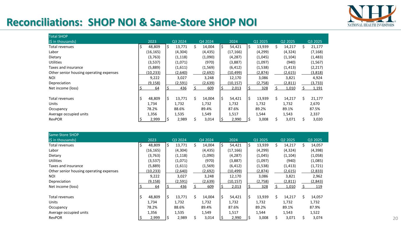Reconciliations: SHOP NOI & Same-Store SHOP NOI 20 Total SHOP 2023 Q3 2024 Q4 2024 2024 Q1 2025 Q2 2025 Q3 2025($ in thousands) Total revenues $ 48,809 $ 13,771 $ 14,004 $ 54,421 $ 13,939 $ 14,217 $ 21,177 Labor (16,165) (4,304) (4,435) (17,166) (4,299) (4,324) (7,168) Dietary (3,763) (1,118) (1,090) (4,287) (1,045) (1,104) (1,483) Utilities (3,537) (1,071) (970) (3,887) (1,097) (940) (1,567) Taxes and insurance (5,889) (1,611) (1,569) (6,412) (1,538) (1,413) (2,217) Other senior housing operating expenses (10,233) (2,640) (2,692) (10,499) (2,874) (2,615) (3,818) NOI 9,222 3,027 3,248 12,170 3,086 3,821 4,924 Depreciation (9,158) (2,591) (2,639) (10,157) (2,758) (2,811) (3,733) Net income (loss) $ 64 $ 436 $ 609 $ 2,013 $ 328 $ 1,010 $ 1,191 Total revenues $ 48,809 $ 13,771 $ 14,004 $ 54,421 $ 13,939 $ 14,217 $ 21,177 Units 1,734 1,732 1,732 1,732 1,732 1,732 2,670 Occupancy 78.2% 88.6% 89.4% 87.6% 89.2% 89.1% 87.5% Average occupied units 1,356 1,535 1,549 1,517 1,544 1,543 2,337 RevPOR $ 2,999 $ 2,989 $ 3,014 $ 2,990 $ 3,008 $ 3,071 $ 3,020 Same-Store SHOP 2023 Q3 2024 Q4 2024 2024 Q1 2025 Q2 2025 Q3 2025($ in thousands) Total revenues $ 48,809 $ 13,771 $ 14,004 $ 54,421 $ 13,939 $ 14,217 $ 14,057 Labor (16,165) (4,304) (4,435) (17,166) (4,299) (4,324) (4,398) Dietary (3,763) (1,118) (1,090) (4,287) (1,045) (1,104) (1,058) Utilities (3,537) (1,071) (970) (3,887) (1,097) (940) (1,085) Taxes and insurance (5,889) (1,611) (1,569) (6,412) (1,538) (1,413) (1,721) Other senior housing operating expenses (10,233) (2,640) (2,692) (10,499) (2,874) (2,615) (2,833) NOI 9,222 3,027 3,248 12,170 3,086 3,821 2,962 Depreciation (9,158) (2,591) (2,639) (10,157) (2,758) (2,811) (2,843) Net income (loss) $ 64 $ 436 $ 609 $ 2,013 $ 328 $ 1,010 $ 119 Total revenues $ 48,809 $ 13,771 $ 14,004 $ 54,421 $ 13,939 $ 14,217 $ 14,057 Units 1,734 1,732 1,732 1,732 1,732 1,732 1,732 Occupancy 78.2% 88.6% 89.4% 87.6% 89.2% 89.1% 87.9% Average occupied units 1,356 1,535 1,549 1,517 1,544 1,543 1,522 RevPOR $ 2,999 $ 2,989 $ 3,014 $ 2,990 $ 3,008 $ 3,071 $ 3,074