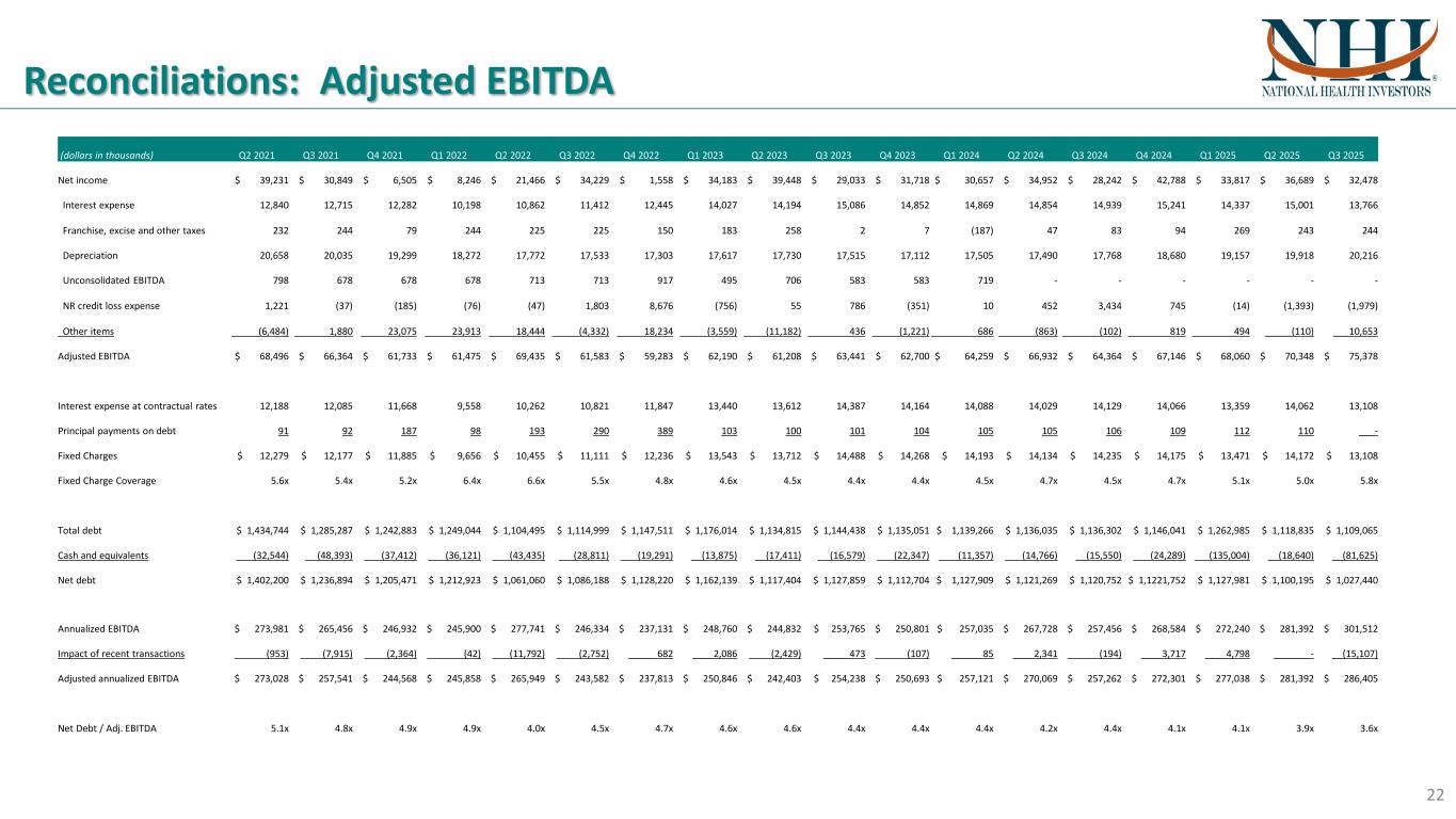 Reconciliations: Adjusted EBITDA 21 Three Months Ended September 30, (unaudited, dollars in thousands) 2025 2024 Net income $ 32,478 $ 28,242 Interest expense 13,766 14,939 Franchise, excise, and other taxes 244 83 Depreciation 20,216 17,768 Gains on sales of real estate, net (113) (102) Notes receivable credit loss (benefit) expense (1,979) 3,434 Non-cash write-off of straight-line rents receivable 12,141 - Non-cash rental income related to operations transfer on early lease termination (1,375) _ - Adjusted EBITDA $ 75,378 $ 64,364 Interest expense at contractual rates $ 13,108 $ 14,129 Principal payments - 106 Fixed Charges $ 13,108 $ 14,235 Fixed Charge Coverage 5.8x 4.5x Net Debt to Adjusted EBITDA Consolidated Total Debt $ 1,109,065 Less: cash and cash equivalents (81,625) Consolidated Net Debt $ 1,027,440 Adjusted EBITDA $ 75,378 Annualizing Adjustment 226,134 Annualized impact of recent investments (15,107) $ 286,405 Consolidated Net Debt to Adjusted EBITDA 3.6x