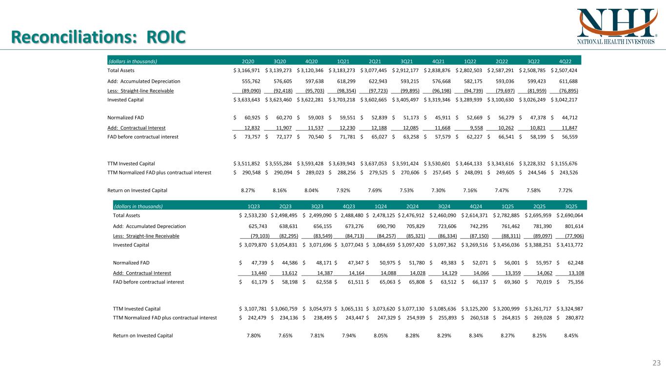 Reconciliations: ROIC 23 (dollars in thousands) 2Q20 3Q20 4Q20 1Q21 2Q21 3Q21 4Q21 1Q22 2Q22 3Q22 4Q22 Total Assets $ 3,166,971 $ 3,139,273 $ 3,120,346 $ 3,183,273 $ 3,077,445 $ 2,912,177 $ 2,838,876 $ 2,802,503 $ 2,587,291 $ 2,508,785 $ 2,507,424 Add: Accumulated Depreciation 555,762 576,605 597,638 618,299 622,943 593,215 576,668 582,175 593,036 599,423 611,688 Less: Straight-line Receivable (89,090) (92,418) (95,703) (98,354) (97,723) (99,895) (96,198) (94,739) (79,697) (81,959) (76,895) Invested Capital $ 3,633,643 $ 3,623,460 $ 3,622,281 $ 3,703,218 $ 3,602,665 $ 3,405,497 $ 3,319,346 $ 3,289,939 $ 3,100,630 $ 3,026,249 $ 3,042,217 Normalized FAD $ 60,925 $ 60,270 $ 59,003 $ 59,551 $ 52,839 $ 51,173 $ 45,911 $ 52,669 $ 56,279 $ 47,378 $ 44,712 Add: Contractual Interest 12,832 11,907 11,537 12,230 12,188 12,085 11,668 9,558 10,262 10,821 11,847 FAD before contractual interest $ 73,757 $ 72,177 $ 70,540 $ 71,781 $ 65,027 $ 63,258 $ 57,579 $ 62,227 $ 66,541 $ 58,199 $ 56,559 TTM Invested Capital $ 3,511,852 $ 3,555,284 $ 3,593,428 $ 3,639,943 $ 3,637,053 $ 3,591,424 $ 3,530,601 $ 3,464,133 $ 3,343,616 $ 3,228,332 $ 3,155,676 TTM Normalized FAD plus contractual interest $ 290,548 $ 290,094 $ 289,023 $ 288,256 $ 279,525 $ 270,606 $ 257,645 $ 248,091 $ 249,605 $ 244,546 $ 243,526 Return on Invested Capital 8.27% 8.16% 8.04% 7.92% 7.69% 7.53% 7.30% 7.16% 7.47% 7.58% 7.72% (dollars in thousands) 1Q23 2Q23 3Q23 4Q23 1Q24 2Q24 3Q24 4Q24 1Q25 2Q25 3Q25 Total Assets $ 2,533,230 $ 2,498,495 $ 2,499,090 $ 2,488,480 $ 2,478,125 $ 2,476,912 $ 2,460,090 $ 2,614,371 $ 2,782,885 $ 2,695,959 $ 2,690,064 Add: Accumulated Depreciation 625,743 638,631 656,155 673,276 690,790 705,829 723,606 742,295 761,462 781,390 801,614 Less: Straight-line Receivable (79,103) (82,295) (83,549) (84,713) (84,257) (85,321) (86,334) (87,150) (88,311) (89,097) (77,906) Invested Capital $ 3,079,870 $ 3,054,831 $ 3,071,696 $ 3,077,043 $ 3,084,659 $ 3,097,420 $ 3,097,362 $ 3,269,516 $ 3,456,036 $ 3,388,251 $ 3,413,772 Normalized FAD $ 47,739 $ 44,586 $ 48,171 $ 47,347 $ 50,975 $ 51,780 $ 49,383 $ 52,071 $ 56,001 $ 55,957 $ 62,248 Add: Contractual Interest 13,440 13,612 14,387 14,164 14,088 14,028 14,129 14,066 13,359 14,062 13,108 FAD before contractual interest $ 61,179 $ 58,198 $ 62,558 $ 61,511 $ 65,063 $ 65,808 $ 63,512 $ 66,137 $ 69,360 $ 70,019 $ 75,356 TTM Invested Capital $ 3,107,781 $ 3,060,759 $ 3,054,973 $ 3,065,131 $ 3,073,620 $ 3,077,130 $ 3,085,636 $ 3,125,200 $ 3,200,999 $ 3,261,717 $ 3,324,987 TTM Normalized FAD plus contractual interest $ 242,479 $ 234,136 $ 238,495 $ 243,447 $ 247,329 $ 254,939 $ 255,893 $ 260,518 $ 264,815 $ 269,028 $ 280,872 Return on Invested Capital 7.80% 7.65% 7.81% 7.94% 8.05% 8.28% 8.29% 8.34% 8.27% 8.25% 8.45%