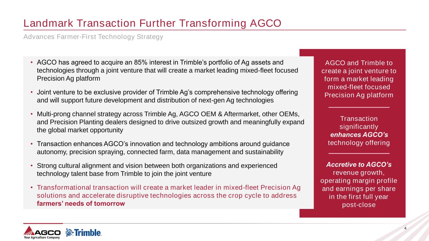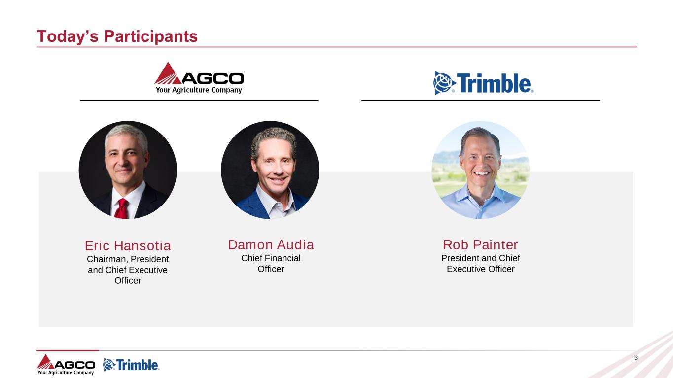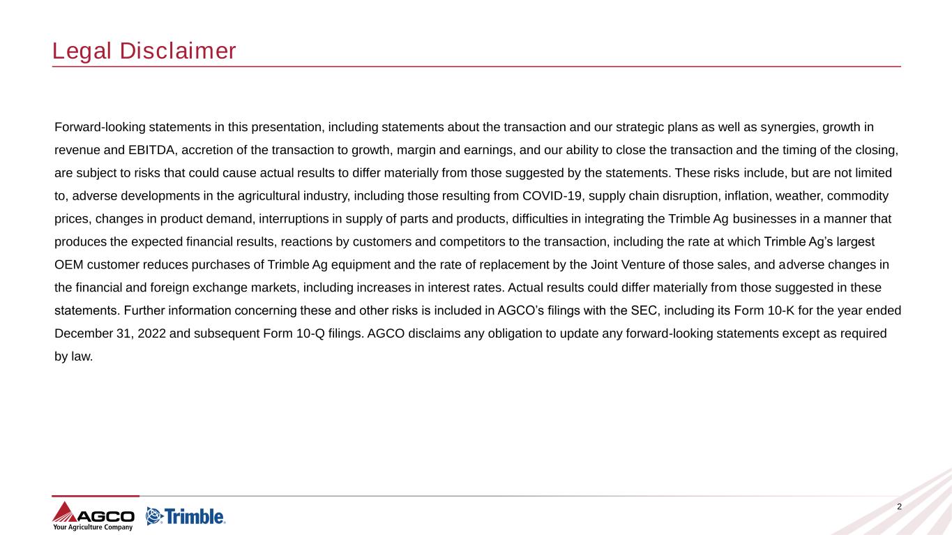 Forward-looking statements in this presentation, including statements about the transaction and our strategic plans as well as synergies, growth in revenue and EBITDA, accretion of the transaction to growth, margin and earnings, and our ability to close the transaction and the timing of the closing, are subject to risks that could cause actual results to differ materially from those suggested by the statements. These risks include, but are not limited to, adverse developments in the agricultural industry, including those resulting from COVID-19, supply chain disruption, inflation, weather, commodity prices, changes in product demand, interruptions in supply of parts and products, difficulties in integrating the Trimble Ag businesses in a manner that produces the expected financial results, reactions by customers and competitors to the transaction, including the rate at which Trimble Ag’s largest OEM customer reduces purchases of Trimble Ag equipment and the rate of replacement by the Joint Venture of those sales, and adverse changes in the financial and foreign exchange markets, including increases in interest rates. Actual results could differ materially from those suggested in these statements. Further information concerning these and other risks is included in AGCO’s filings with the SEC, including its Form 10-K for the year ended December 31, 2022 and subsequent Form 10-Q filings. AGCO disclaims any obligation to update any forward-looking statements except as required by law. 2 Legal Disclaimer