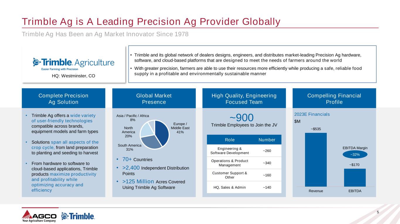 4 Advances Farmer-First Technology Strategy Landmark Transaction Further Transforming AGCO • AGCO has agreed to acquire an 85% interest in Trimble’s portfolio of Ag assets and technologies through a joint venture that will create a market leading mixed-fleet focused Precision Ag platform • Joint venture to be exclusive provider of Trimble Ag’s comprehensive technology offering and will support future development and distribution of next-gen Ag technologies • Multi-prong channel strategy across Trimble Ag, AGCO OEM & Aftermarket, other OEMs, and Precision Planting dealers designed to drive outsized growth and meaningfully expand the global market opportunity • Transaction enhances AGCO’s innovation and technology ambitions around guidance autonomy, precision spraying, connected farm, data management and sustainability • Strong cultural alignment and vision between both organizations and experienced technology talent base from Trimble to join the joint venture • Transformational transaction will create a market leader in mixed-fleet Precision Ag solutions and accelerate disruptive technologies across the crop cycle to address farmers’ needs of tomorrow AGCO and Trimble to create a joint venture to form a market leading mixed-fleet focused Precision Ag platform Transaction significantly enhances AGCO’s technology offering Accretive to AGCO’s revenue growth, operating margin profile and earnings per share in the first full year post-close
