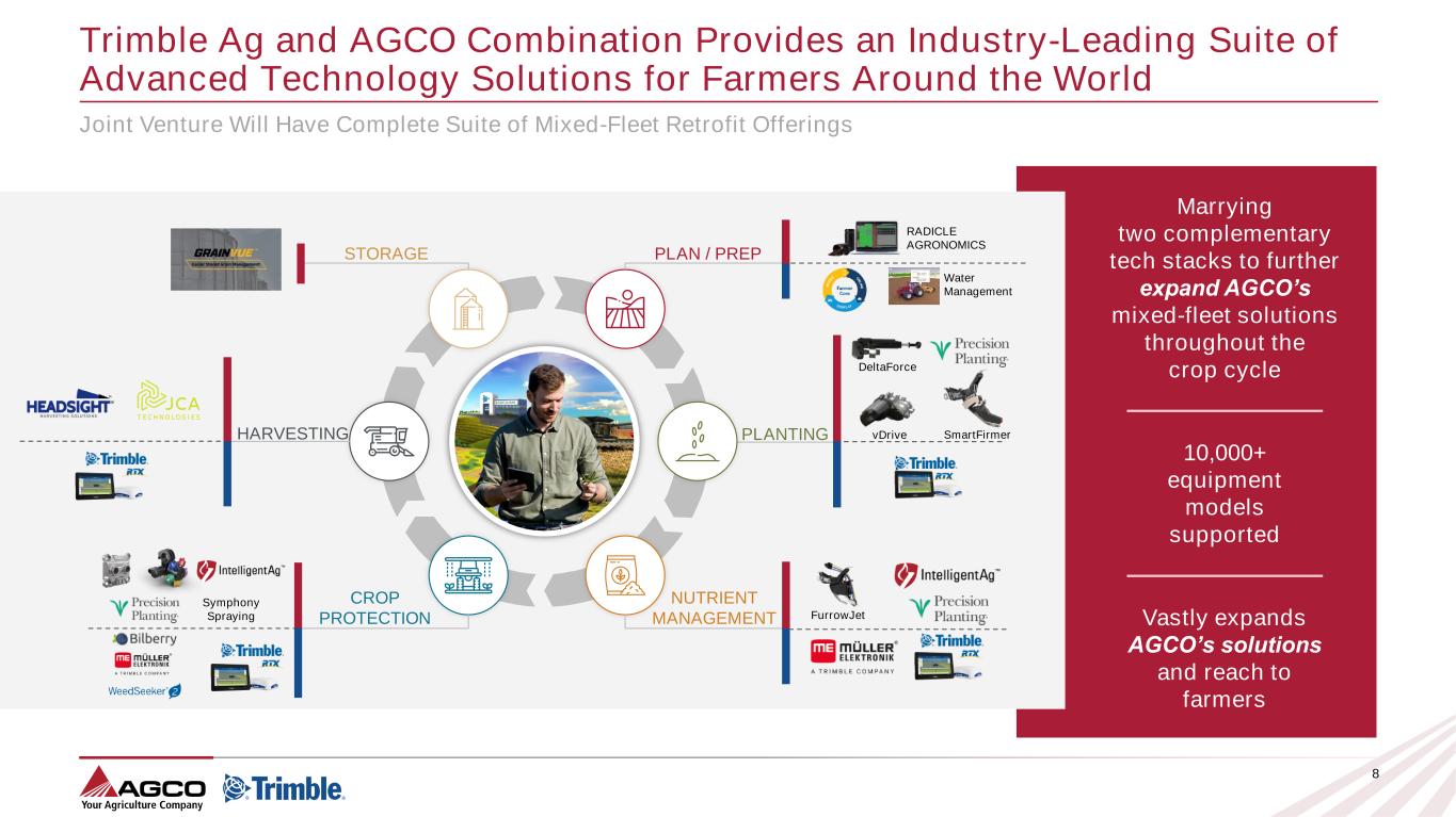 7 Transaction Significantly Strengthens AGCO’s Tech Transformation Foundational Architecture Retrofit & Embedded Guidance Systems Integration & Advanced Features Connected & Advanced Sensing Rapidly Expanding Connectivity Data Management & Logistics Connected Farm Enablement Automation & Artificial Intelligence Expanding AI/AM to Enhance Full Fleet Across Crop Cycle Autonomy Retrofit Systems Integration Advanced Hardware and Positioning Services Access to Trimble’s GNSS Technology Enhanced Connectivity with Trimble Ag’s Farmer Core Software Automation Technologies Such as Autopilot Automated Steering System Strengthened Machinery Compatibility and Connectivity Joint Venture Amplifies AGCO’s Significant Organic and Inorganic AgTech Investments A G C O C u rr e n t T e c h n o lo g ie s