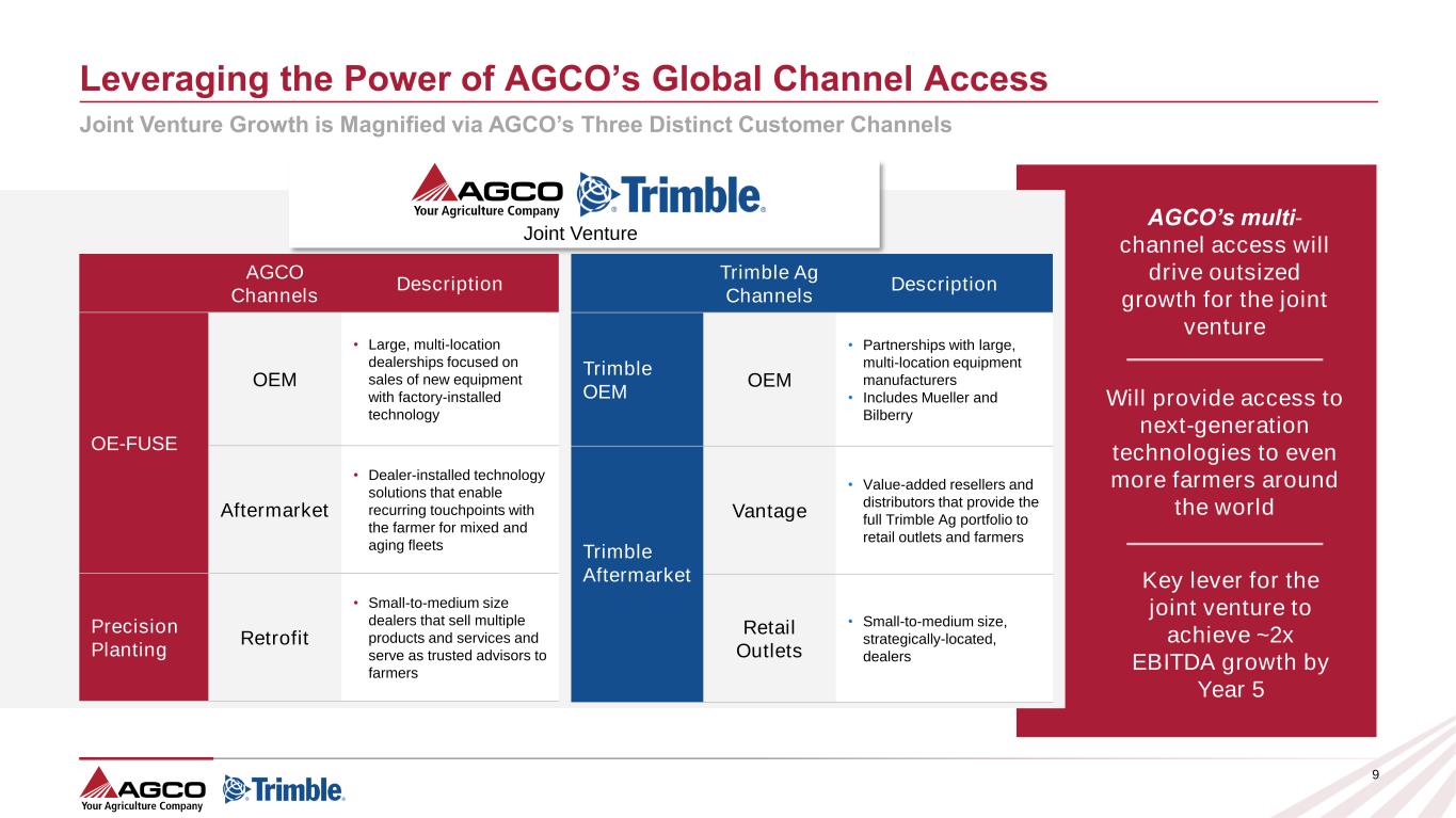 8 Trimble Ag and AGCO Combination Provides an Industry-Leading Suite of Advanced Technology Solutions for Farmers Around the World Marrying two complementary tech stacks to further expand AGCO’s mixed-fleet solutions throughout the crop cycle 10,000+ equipment models supported Vastly expands AGCO’s solutions and reach to farmers STORAGE PLANTING CROP PROTECTION HARVESTING NUTRIENT MANAGEMENT RADICLE AGRONOMICS PLAN / PREP Symphony Spraying SmartFirmervDrive DeltaForce FurrowJet Joint Venture Will Have Complete Suite of Mixed-Fleet Retrofit Offerings Water Management