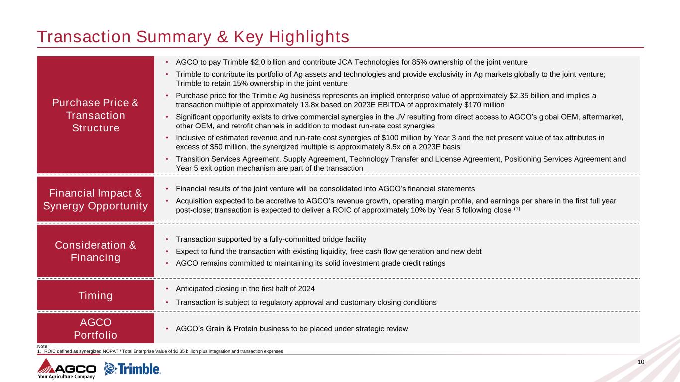 9 Joint Venture Growth is Magnified via AGCO’s Three Distinct Customer Channels Leveraging the Power of AGCO’s Global Channel Access AGCO Channels Description OE-FUSE OEM • Large, multi-location dealerships focused on sales of new equipment with factory-installed technology Aftermarket • Dealer-installed technology solutions that enable recurring touchpoints with the farmer for mixed and aging fleets Precision Planting Retrofit • Small-to-medium size dealers that sell multiple products and services and serve as trusted advisors to farmers AGCO’s multi- channel access will drive outsized growth for the joint venture Will provide access to next-generation technologies to even more farmers around the world Key lever for the joint venture to achieve ~2x EBITDA growth by Year 5 Joint Venture Trimble Ag Channels Description Trimble OEM OEM • Partnerships with large, multi-location equipment manufacturers • Includes Mueller and Bilberry Trimble Aftermarket Vantage • Value-added resellers and distributors that provide the full Trimble Ag portfolio to retail outlets and farmers Retail Outlets • Small-to-medium size, strategically-located, dealers