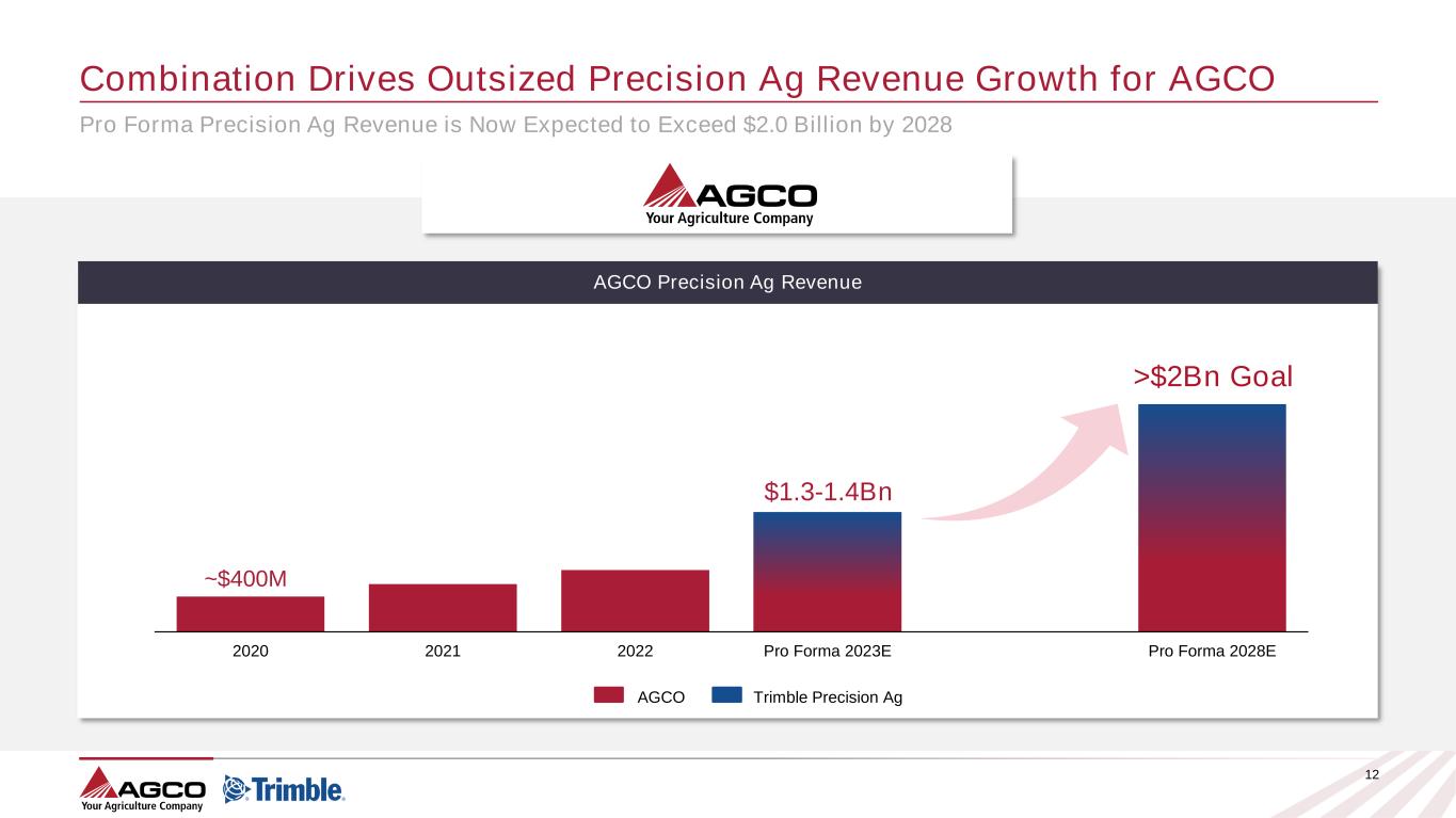 11 Overview of the Joint Venture Structure Assets Contributed AGCO Contribution Joint Venture 85% AGCO Ownership 15% Trimble Ownership Supply Agreement • Governs GNSS and guidance hardware and technology that Trimble will supply to the JV for sale to AGCO dealers and other OEMs • Minimum term of seven years Technology Transfer and License Agreement • Long term agreement that governs the licensing of Trimble trademarks and technology for use by the JV after the termination of the Supply Agreement Long Term Agreements Displays Steering Motors Application Control Software Trimble Ag Cash Payment to Trimble Positioning Services Agreement • JV to serve as exclusive channel partner in the agriculture market for Positioning Services, which remains wholly owned by Trimble • JV will earn commissions on certain sales of positioning services Joint Venture Exit Mechanism • Put / call structure in place which will be actionable no earlier than Year 5 of the JV