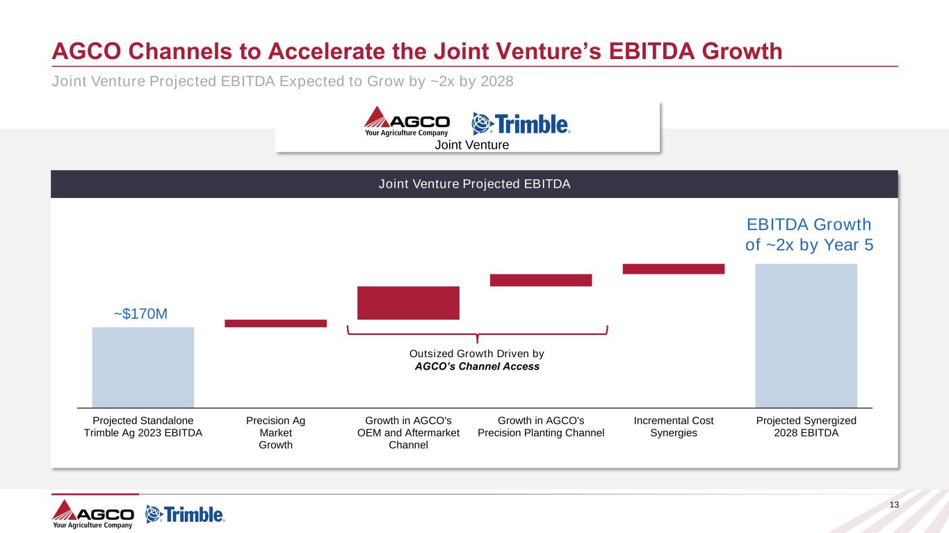 2020 2021 2022 Pro Forma 2023E Pro Forma 2028E 12 Pro Forma Precision Ag Revenue is Now Expected to Exceed $2.0 Billion by 2028 Combination Drives Outsized Precision Ag Revenue Growth for AGCO ~$400M $1.3-1.4Bn >$2Bn Goal AGCO Trimble Precision Ag AGCO Precision Ag Revenue