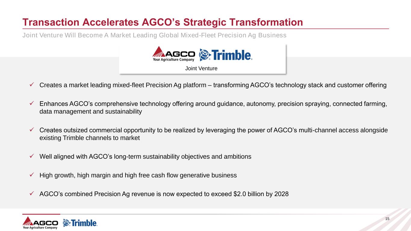 14 AGCO is Committed to Accelerating Progress By Integrating Sustainability into the Design, Manufacturing and Distribution of Smart Agricultural Solutions Across the Entire Value Chain Joint Venture’s Technologies Are at the Heart of Sustainability of the Farm AGCO’s Sustainability Objectives • JV technology will support the farmer in generating higher yields to meet the global food challenge, while better utilizing inputs like fuel, seed, fertilizer, water and others • JV technology will assist businesses in achieving their net zero goals by connecting them with farmers to champion and fund sustainable agriculture Joint Venture Effect Facilitating the Path to Global Food Security CO2 Reduction