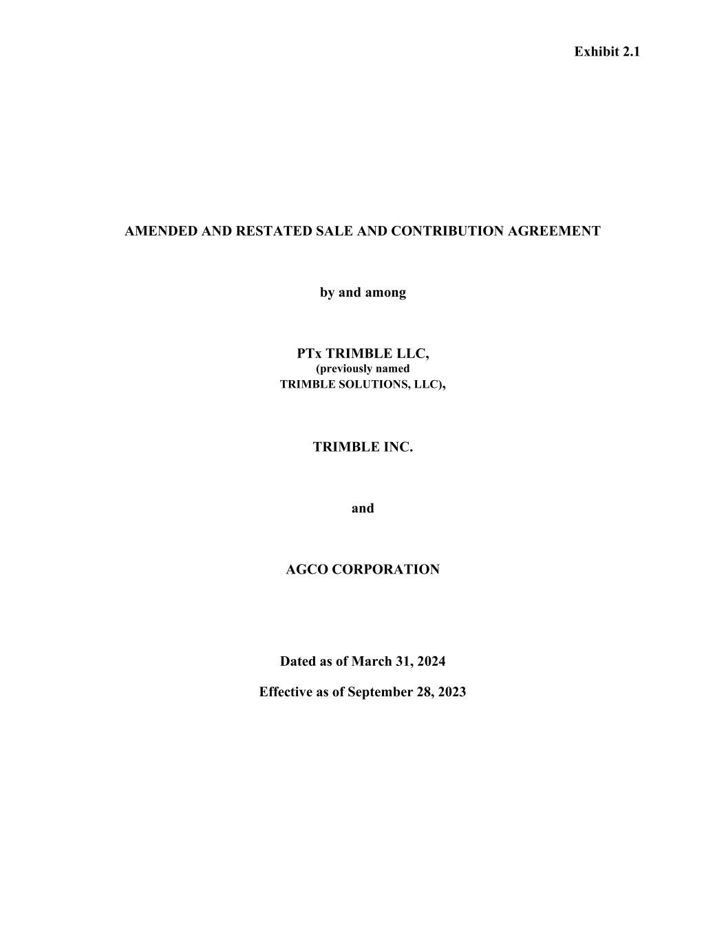 Exhibit 2.1 AMENDED AND RESTATED SALE AND CONTRIBUTION AGREEMENT by and among PTx TRIMBLE LLC, (previously named TRIMBLE SOLUTIONS, LLC), TRIMBLE INC. and AGCO CORPORATION Dated as of March 31, 2024 Effective as of September 28, 2023