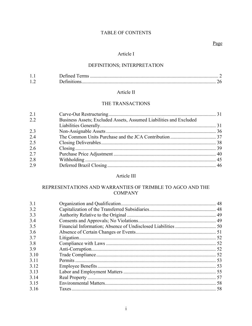 i TABLE OF CONTENTS Page Article I DEFINITIONS; INTERPRETATION 1.1 Defined Terms ........................................................................................................ 2 1.2 Definitions............................................................................................................. 26 Article II THE TRANSACTIONS 2.1 Carve-Out Restructuring ....................................................................................... 31 2.2 Business Assets; Excluded Assets, Assumed Liabilities and Excluded Liabilities Generally.............................................................................................. 31 2.3 Non-Assignable Assets ......................................................................................... 36 2.4 The Common Units Purchase and the JCA Contribution ..................................... 37 2.5 Closing Deliverables ............................................................................................. 38 2.6 Closing .................................................................................................................. 39 2.7 Purchase Price Adjustment ................................................................................... 40 2.8 Withholding .......................................................................................................... 45 2.9 Deferred Brazil Closing ........................................................................................ 46 Article III REPRESENTATIONS AND WARRANTIES OF TRIMBLE TO AGCO AND THE COMPANY 3.1 Organization and Qualification ............................................................................. 48 3.2 Capitalization of the Transferred Subsidiaries ...................................................... 48 3.3 Authority Relative to the Original ........................................................................ 49 3.4 Consents and Approvals; No Violations ............................................................... 49 3.5 Financial Information; Absence of Undisclosed Liabilities ................................. 50 3.6 Absence of Certain Changes or Events ................................................................. 51 3.7 Litigation ............................................................................................................... 52 3.8 Compliance with Laws ......................................................................................... 52 3.9 Anti-Corruption..................................................................................................... 52 3.10 Trade Compliance ................................................................................................. 52 3.11 Permits .................................................................................................................. 53 3.12 Employee Benefits ................................................................................................ 53 3.13 Labor and Employment Matters ........................................................................... 55 3.14 Real Property ........................................................................................................ 57 3.15 Environmental Matters.......................................................................................... 58 3.16 Taxes ..................................................................................................................... 58
