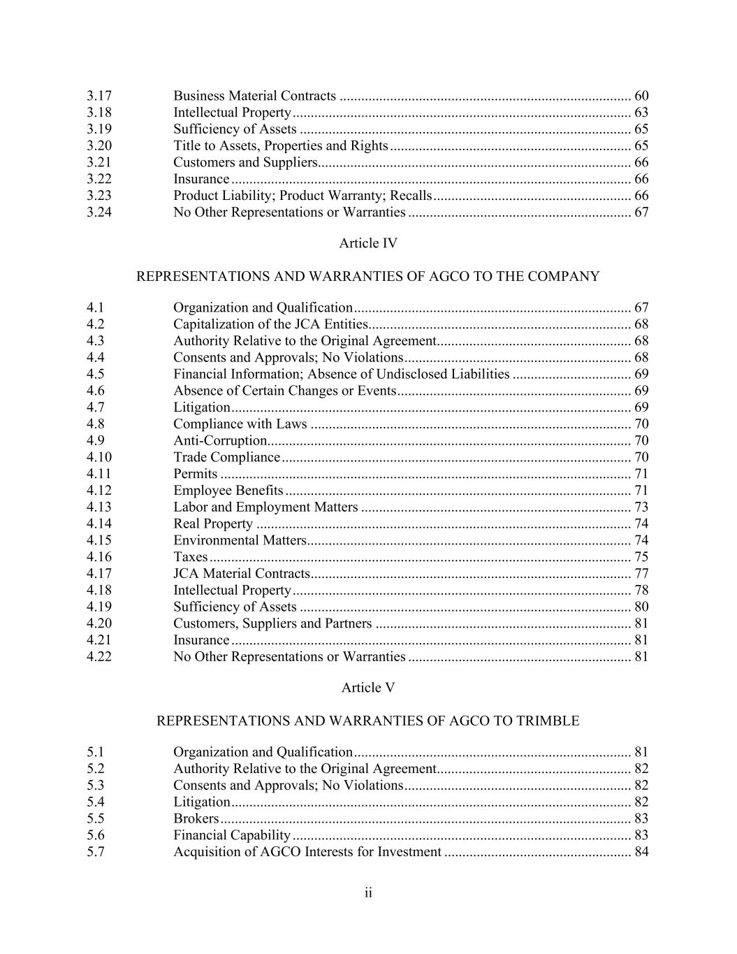 ii 3.17 Business Material Contracts ................................................................................. 60 3.18 Intellectual Property .............................................................................................. 63 3.19 Sufficiency of Assets ............................................................................................ 65 3.20 Title to Assets, Properties and Rights ................................................................... 65 3.21 Customers and Suppliers....................................................................................... 66 3.22 Insurance ............................................................................................................... 66 3.23 Product Liability; Product Warranty; Recalls ....................................................... 66 3.24 No Other Representations or Warranties .............................................................. 67 Article IV REPRESENTATIONS AND WARRANTIES OF AGCO TO THE COMPANY 4.1 Organization and Qualification ............................................................................. 67 4.2 Capitalization of the JCA Entities......................................................................... 68 4.3 Authority Relative to the Original Agreement...................................................... 68 4.4 Consents and Approvals; No Violations ............................................................... 68 4.5 Financial Information; Absence of Undisclosed Liabilities ................................. 69 4.6 Absence of Certain Changes or Events ................................................................. 69 4.7 Litigation ............................................................................................................... 69 4.8 Compliance with Laws ......................................................................................... 70 4.9 Anti-Corruption..................................................................................................... 70 4.10 Trade Compliance ................................................................................................. 70 4.11 Permits .................................................................................................................. 71 4.12 Employee Benefits ................................................................................................ 71 4.13 Labor and Employment Matters ........................................................................... 73 4.14 Real Property ........................................................................................................ 74 4.15 Environmental Matters.......................................................................................... 74 4.16 Taxes ..................................................................................................................... 75 4.17 JCA Material Contracts......................................................................................... 77 4.18 Intellectual Property .............................................................................................. 78 4.19 Sufficiency of Assets ............................................................................................ 80 4.20 Customers, Suppliers and Partners ....................................................................... 81 4.21 Insurance ............................................................................................................... 81 4.22 No Other Representations or Warranties .............................................................. 81 Article V REPRESENTATIONS AND WARRANTIES OF AGCO TO TRIMBLE 5.1 Organization and Qualification ............................................................................. 81 5.2 Authority Relative to the Original Agreement...................................................... 82 5.3 Consents and Approvals; No Violations ............................................................... 82 5.4 Litigation ............................................................................................................... 82 5.5 Brokers .................................................................................................................. 83 5.6 Financial Capability .............................................................................................. 83 5.7 Acquisition of AGCO Interests for Investment .................................................... 84