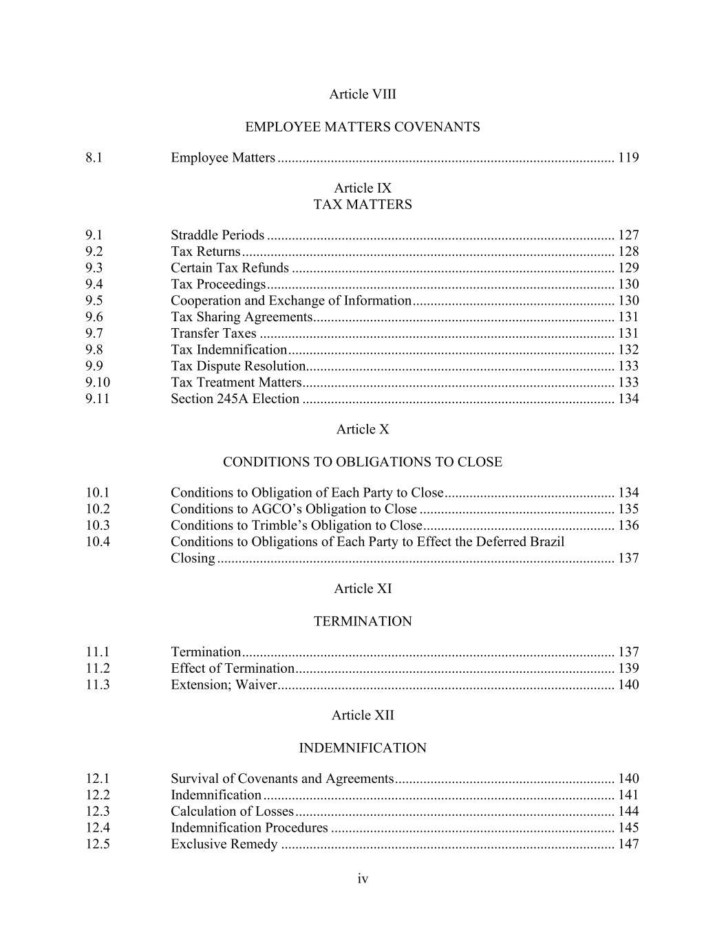 iv Article VIII EMPLOYEE MATTERS COVENANTS 8.1 Employee Matters ............................................................................................... 119 Article IX TAX MATTERS 9.1 Straddle Periods .................................................................................................. 127 9.2 Tax Returns ......................................................................................................... 128 9.3 Certain Tax Refunds ........................................................................................... 129 9.4 Tax Proceedings .................................................................................................. 130 9.5 Cooperation and Exchange of Information ......................................................... 130 9.6 Tax Sharing Agreements..................................................................................... 131 9.7 Transfer Taxes .................................................................................................... 131 9.8 Tax Indemnification ............................................................................................ 132 9.9 Tax Dispute Resolution....................................................................................... 133 9.10 Tax Treatment Matters ........................................................................................ 133 9.11 Section 245A Election ........................................................................................ 134 Article X CONDITIONS TO OBLIGATIONS TO CLOSE 10.1 Conditions to Obligation of Each Party to Close ................................................ 134 10.2 Conditions to AGCO’s Obligation to Close ....................................................... 135 10.3 Conditions to Trimble’s Obligation to Close ...................................................... 136 10.4 Conditions to Obligations of Each Party to Effect the Deferred Brazil Closing ................................................................................................................ 137 Article XI TERMINATION 11.1 Termination ......................................................................................................... 137 11.2 Effect of Termination .......................................................................................... 139 11.3 Extension; Waiver ............................................................................................... 140 Article XII INDEMNIFICATION 12.1 Survival of Covenants and Agreements .............................................................. 140 12.2 Indemnification ................................................................................................... 141 12.3 Calculation of Losses .......................................................................................... 144 12.4 Indemnification Procedures ................................................................................ 145 12.5 Exclusive Remedy .............................................................................................. 147