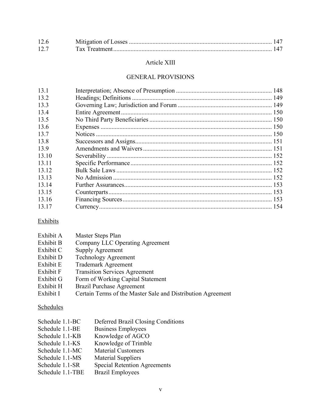 v 12.6 Mitigation of Losses ........................................................................................... 147 12.7 Tax Treatment ..................................................................................................... 147 Article XIII GENERAL PROVISIONS 13.1 Interpretation; Absence of Presumption ............................................................. 148 13.2 Headings; Definitions ......................................................................................... 149 13.3 Governing Law; Jurisdiction and Forum ............................................................ 149 13.4 Entire Agreement ................................................................................................ 150 13.5 No Third Party Beneficiaries .............................................................................. 150 13.6 Expenses ............................................................................................................. 150 13.7 Notices ................................................................................................................ 150 13.8 Successors and Assigns....................................................................................... 151 13.9 Amendments and Waivers .................................................................................. 151 13.10 Severability ......................................................................................................... 152 13.11 Specific Performance .......................................................................................... 152 13.12 Bulk Sale Laws ................................................................................................... 152 13.13 No Admission ..................................................................................................... 152 13.14 Further Assurances.............................................................................................. 153 13.15 Counterparts ........................................................................................................ 153 13.16 Financing Sources ............................................................................................... 153 13.17 Currency .............................................................................................................. 154 Exhibits Exhibit A Master Steps Plan Exhibit B Company LLC Operating Agreement Exhibit C Supply Agreement Exhibit D Technology Agreement Exhibit E Trademark Agreement Exhibit F Transition Services Agreement Exhibit G Form of Working Capital Statement Exhibit H Brazil Purchase Agreement Exhibit I Certain Terms of the Master Sale and Distribution Agreement Schedules Schedule 1.1-BC Deferred Brazil Closing Conditions Schedule 1.1-BE Business Employees Schedule 1.1-KB Knowledge of AGCO Schedule 1.1-KS Knowledge of Trimble Schedule 1.1-MC Material Customers Schedule 1.1-MS Material Suppliers Schedule 1.1-SR Special Retention Agreements Schedule 1.1-TBE Brazil Employees