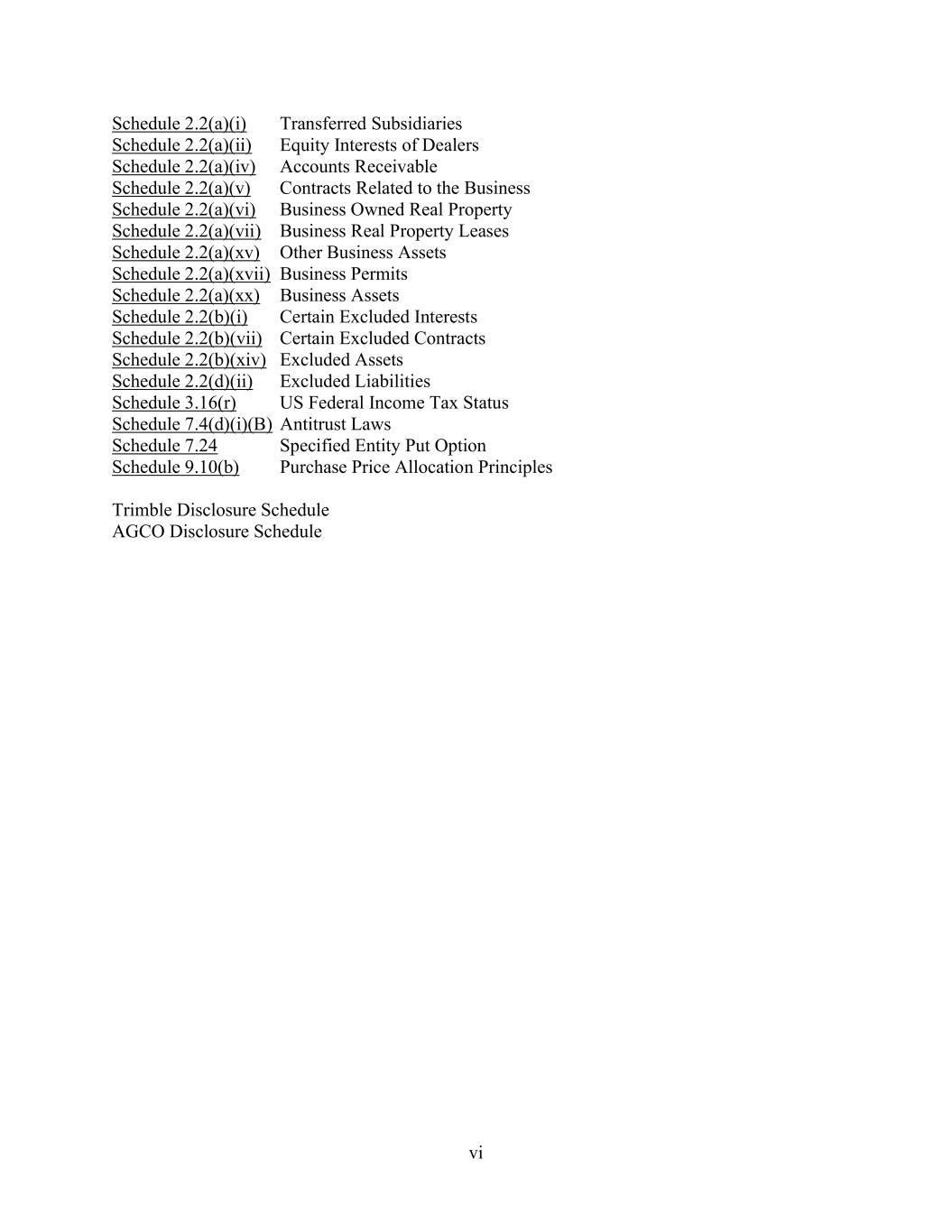 vi Schedule 2.2(a)(i) Transferred Subsidiaries Schedule 2.2(a)(ii) Equity Interests of Dealers Schedule 2.2(a)(iv) Accounts Receivable Schedule 2.2(a)(v) Contracts Related to the Business Schedule 2.2(a)(vi) Business Owned Real Property Schedule 2.2(a)(vii) Business Real Property Leases Schedule 2.2(a)(xv) Other Business Assets Schedule 2.2(a)(xvii) Business Permits Schedule 2.2(a)(xx) Business Assets Schedule 2.2(b)(i) Certain Excluded Interests Schedule 2.2(b)(vii) Certain Excluded Contracts Schedule 2.2(b)(xiv) Excluded Assets Schedule 2.2(d)(ii) Excluded Liabilities Schedule 3.16(r) US Federal Income Tax Status Schedule 7.4(d)(i)(B) Antitrust Laws Schedule 7.24 Specified Entity Put Option Schedule 9.10(b) Purchase Price Allocation Principles Trimble Disclosure Schedule AGCO Disclosure Schedule