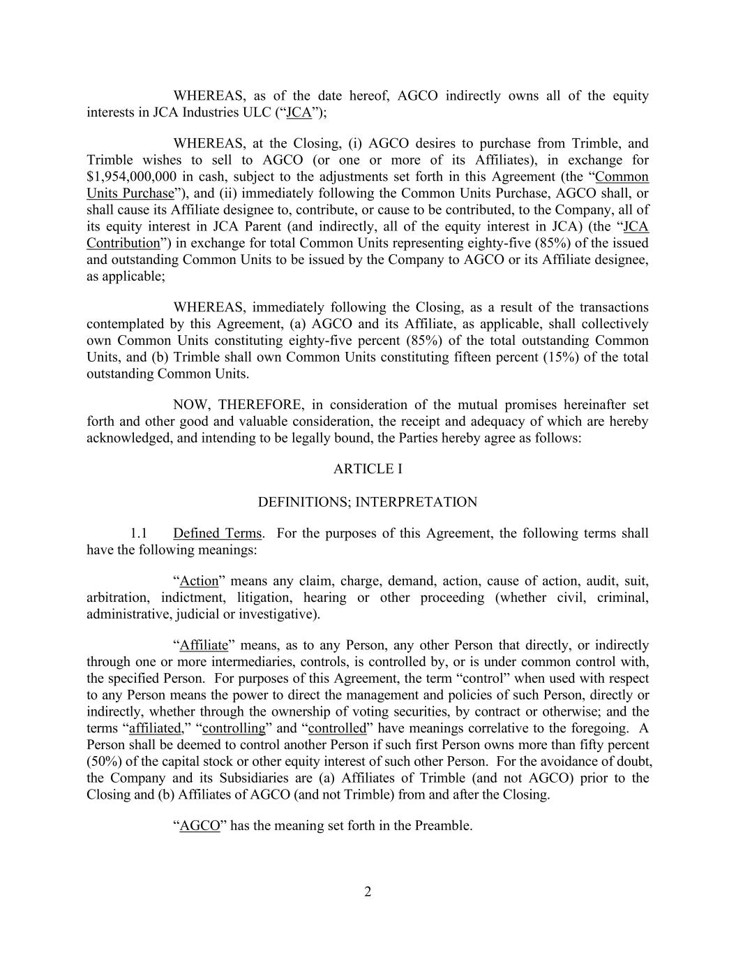 2 WHEREAS, as of the date hereof, AGCO indirectly owns all of the equity interests in JCA Industries ULC (“JCA”); WHEREAS, at the Closing, (i) AGCO desires to purchase from Trimble, and Trimble wishes to sell to AGCO (or one or more of its Affiliates), in exchange for $1,954,000,000 in cash, subject to the adjustments set forth in this Agreement (the “Common Units Purchase”), and (ii) immediately following the Common Units Purchase, AGCO shall, or shall cause its Affiliate designee to, contribute, or cause to be contributed, to the Company, all of its equity interest in JCA Parent (and indirectly, all of the equity interest in JCA) (the “JCA Contribution”) in exchange for total Common Units representing eighty-five (85%) of the issued and outstanding Common Units to be issued by the Company to AGCO or its Affiliate designee, as applicable; WHEREAS, immediately following the Closing, as a result of the transactions contemplated by this Agreement, (a) AGCO and its Affiliate, as applicable, shall collectively own Common Units constituting eighty-five percent (85%) of the total outstanding Common Units, and (b) Trimble shall own Common Units constituting fifteen percent (15%) of the total outstanding Common Units. NOW, THEREFORE, in consideration of the mutual promises hereinafter set forth and other good and valuable consideration, the receipt and adequacy of which are hereby acknowledged, and intending to be legally bound, the Parties hereby agree as follows: ARTICLE I DEFINITIONS; INTERPRETATION 1.1 Defined Terms. For the purposes of this Agreement, the following terms shall have the following meanings: “Action” means any claim, charge, demand, action, cause of action, audit, suit, arbitration, indictment, litigation, hearing or other proceeding (whether civil, criminal, administrative, judicial or investigative). “Affiliate” means, as to any Person, any other Person that directly, or indirectly through one or more intermediaries, controls, is controlled by, or is under common control with, the specified Person. For purposes of this Agreement, the term “control” when used with respect to any Person means the power to direct the management and policies of such Person, directly or indirectly, whether through the ownership of voting securities, by contract or otherwise; and the terms “affiliated,” “controlling” and “controlled” have meanings correlative to the foregoing. A Person shall be deemed to control another Person if such first Person owns more than fifty percent (50%) of the capital stock or other equity interest of such other Person. For the avoidance of doubt, the Company and its Subsidiaries are (a) Affiliates of Trimble (and not AGCO) prior to the Closing and (b) Affiliates of AGCO (and not Trimble) from and after the Closing. “AGCO” has the meaning set forth in the Preamble.