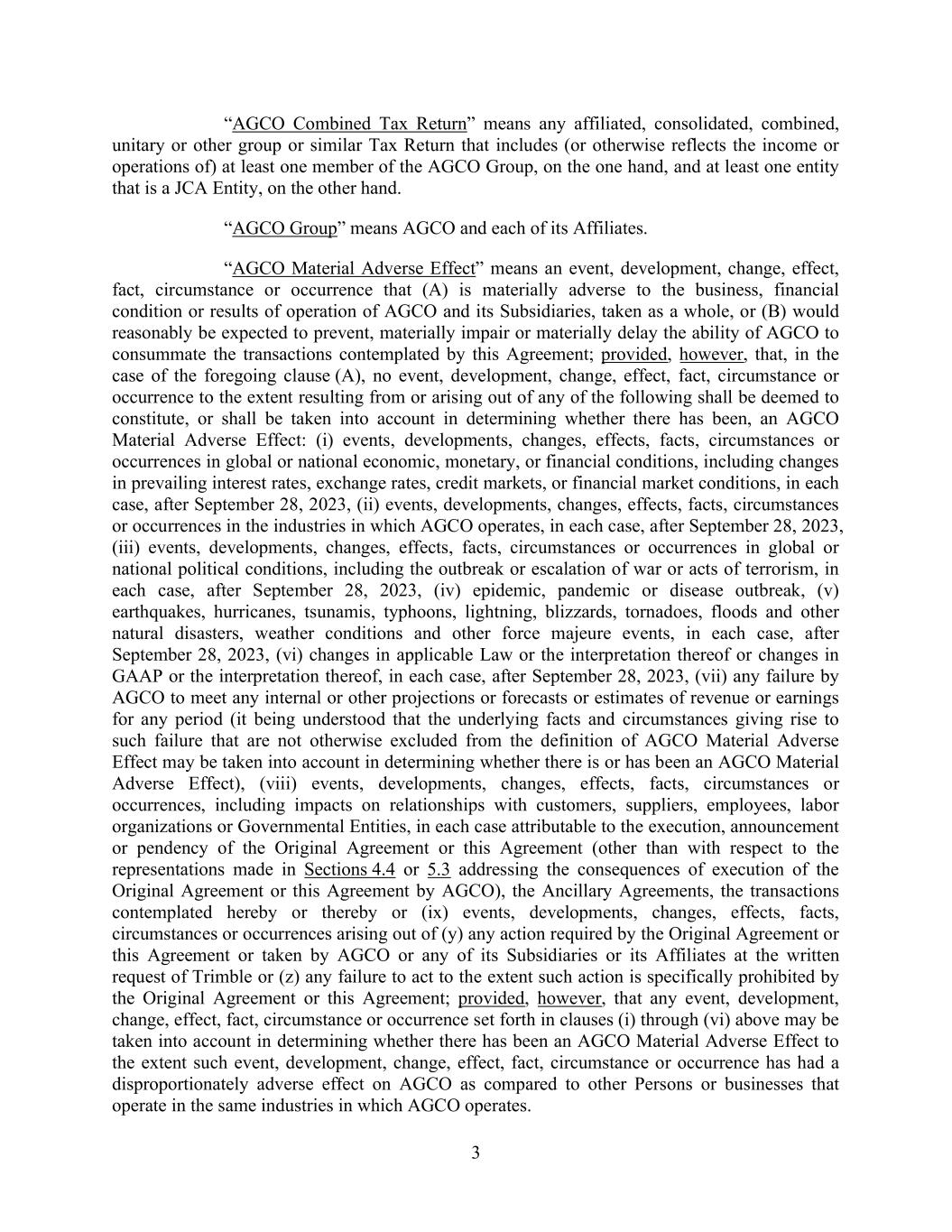 3 “AGCO Combined Tax Return” means any affiliated, consolidated, combined, unitary or other group or similar Tax Return that includes (or otherwise reflects the income or operations of) at least one member of the AGCO Group, on the one hand, and at least one entity that is a JCA Entity, on the other hand. “AGCO Group” means AGCO and each of its Affiliates. “AGCO Material Adverse Effect” means an event, development, change, effect, fact, circumstance or occurrence that (A) is materially adverse to the business, financial condition or results of operation of AGCO and its Subsidiaries, taken as a whole, or (B) would reasonably be expected to prevent, materially impair or materially delay the ability of AGCO to consummate the transactions contemplated by this Agreement; provided, however, that, in the case of the foregoing clause (A), no event, development, change, effect, fact, circumstance or occurrence to the extent resulting from or arising out of any of the following shall be deemed to constitute, or shall be taken into account in determining whether there has been, an AGCO Material Adverse Effect: (i) events, developments, changes, effects, facts, circumstances or occurrences in global or national economic, monetary, or financial conditions, including changes in prevailing interest rates, exchange rates, credit markets, or financial market conditions, in each case, after September 28, 2023, (ii) events, developments, changes, effects, facts, circumstances or occurrences in the industries in which AGCO operates, in each case, after September 28, 2023, (iii) events, developments, changes, effects, facts, circumstances or occurrences in global or national political conditions, including the outbreak or escalation of war or acts of terrorism, in each case, after September 28, 2023, (iv) epidemic, pandemic or disease outbreak, (v) earthquakes, hurricanes, tsunamis, typhoons, lightning, blizzards, tornadoes, floods and other natural disasters, weather conditions and other force majeure events, in each case, after September 28, 2023, (vi) changes in applicable Law or the interpretation thereof or changes in GAAP or the interpretation thereof, in each case, after September 28, 2023, (vii) any failure by AGCO to meet any internal or other projections or forecasts or estimates of revenue or earnings for any period (it being understood that the underlying facts and circumstances giving rise to such failure that are not otherwise excluded from the definition of AGCO Material Adverse Effect may be taken into account in determining whether there is or has been an AGCO Material Adverse Effect), (viii) events, developments, changes, effects, facts, circumstances or occurrences, including impacts on relationships with customers, suppliers, employees, labor organizations or Governmental Entities, in each case attributable to the execution, announcement or pendency of the Original Agreement or this Agreement (other than with respect to the representations made in Sections 4.4 or 5.3 addressing the consequences of execution of the Original Agreement or this Agreement by AGCO), the Ancillary Agreements, the transactions contemplated hereby or thereby or (ix) events, developments, changes, effects, facts, circumstances or occurrences arising out of (y) any action required by the Original Agreement or this Agreement or taken by AGCO or any of its Subsidiaries or its Affiliates at the written request of Trimble or (z) any failure to act to the extent such action is specifically prohibited by the Original Agreement or this Agreement; provided, however, that any event, development, change, effect, fact, circumstance or occurrence set forth in clauses (i) through (vi) above may be taken into account in determining whether there has been an AGCO Material Adverse Effect to the extent such event, development, change, effect, fact, circumstance or occurrence has had a disproportionately adverse effect on AGCO as compared to other Persons or businesses that operate in the same industries in which AGCO operates.
