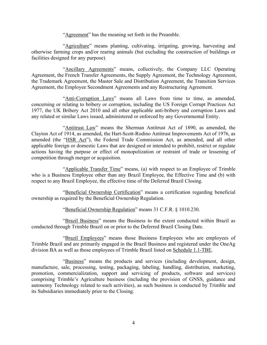 4 “Agreement” has the meaning set forth in the Preamble. “Agriculture” means planting, cultivating, irrigating, growing, harvesting and otherwise farming crops and/or rearing animals (but excluding the construction of buildings or facilities designed for any purpose). “Ancillary Agreements” means, collectively, the Company LLC Operating Agreement, the French Transfer Agreements, the Supply Agreement, the Technology Agreement, the Trademark Agreement, the Master Sale and Distribution Agreement, the Transition Services Agreement, the Employee Secondment Agreements and any Restructuring Agreement. “Anti-Corruption Laws” means all Laws from time to time, as amended, concerning or relating to bribery or corruption, including the US Foreign Corrupt Practices Act 1977, the UK Bribery Act 2010 and all other applicable anti-bribery and corruption Laws and any related or similar Laws issued, administered or enforced by any Governmental Entity. “Antitrust Law” means the Sherman Antitrust Act of 1890, as amended, the Clayton Act of 1914, as amended, the Hart-Scott-Rodino Antitrust Improvements Act of 1976, as amended (the “HSR Act”), the Federal Trade Commission Act, as amended, and all other applicable foreign or domestic Laws that are designed or intended to prohibit, restrict or regulate actions having the purpose or effect of monopolization or restraint of trade or lessening of competition through merger or acquisition. “Applicable Transfer Time” means, (a) with respect to an Employee of Trimble who is a Business Employee other than any Brazil Employee, the Effective Time and (b) with respect to any Brazil Employee, the effective time of the Deferred Brazil Closing. “Beneficial Ownership Certification” means a certification regarding beneficial ownership as required by the Beneficial Ownership Regulation. “Beneficial Ownership Regulation” means 31 C.F.R. § 1010.230. “Brazil Business” means the Business to the extent conducted within Brazil as conducted through Trimble Brazil on or prior to the Deferred Brazil Closing Date. “Brazil Employees” means those Business Employees who are employees of Trimble Brazil and are primarily engaged in the Brazil Business and registered under the OneAg division BA as well as those employees of Trimble Brazil listed on Schedule 1.1-TBE. “Business” means the products and services (including development, design, manufacture, sale, processing, testing, packaging, labeling, handling, distribution, marketing, promotion, commercialization, support and servicing of products, software and services) comprising Trimble’s Agriculture business (including the provision of GNSS, guidance and autonomy Technology related to such activities), as such business is conducted by Trimble and its Subsidiaries immediately prior to the Closing.