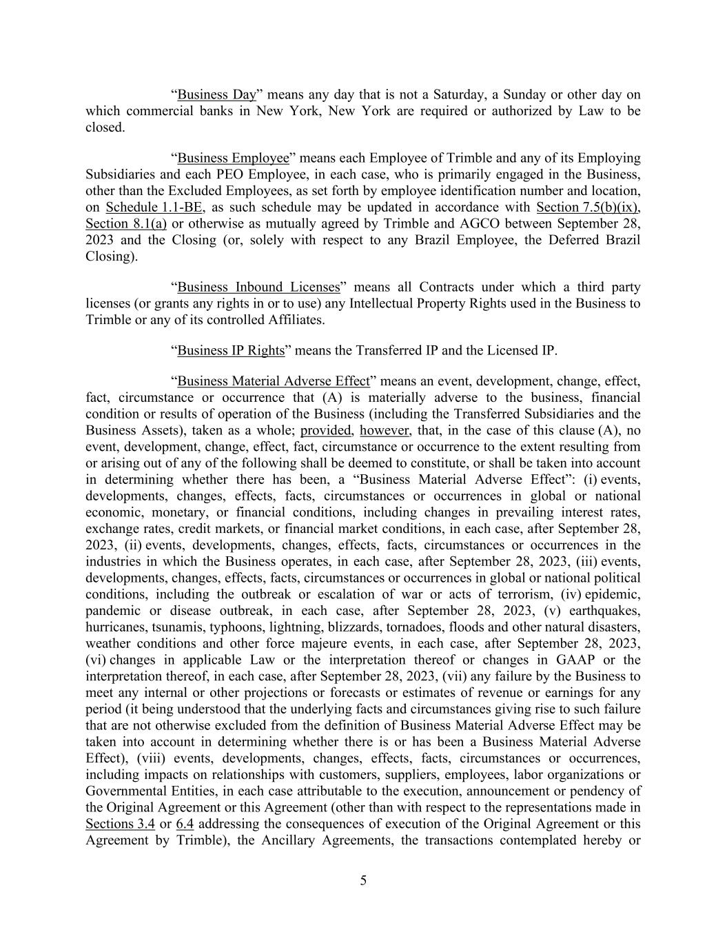 5 “Business Day” means any day that is not a Saturday, a Sunday or other day on which commercial banks in New York, New York are required or authorized by Law to be closed. “Business Employee” means each Employee of Trimble and any of its Employing Subsidiaries and each PEO Employee, in each case, who is primarily engaged in the Business, other than the Excluded Employees, as set forth by employee identification number and location, on Schedule 1.1-BE, as such schedule may be updated in accordance with Section 7.5(b)(ix), Section 8.1(a) or otherwise as mutually agreed by Trimble and AGCO between September 28, 2023 and the Closing (or, solely with respect to any Brazil Employee, the Deferred Brazil Closing). “Business Inbound Licenses” means all Contracts under which a third party licenses (or grants any rights in or to use) any Intellectual Property Rights used in the Business to Trimble or any of its controlled Affiliates. “Business IP Rights” means the Transferred IP and the Licensed IP. “Business Material Adverse Effect” means an event, development, change, effect, fact, circumstance or occurrence that (A) is materially adverse to the business, financial condition or results of operation of the Business (including the Transferred Subsidiaries and the Business Assets), taken as a whole; provided, however, that, in the case of this clause (A), no event, development, change, effect, fact, circumstance or occurrence to the extent resulting from or arising out of any of the following shall be deemed to constitute, or shall be taken into account in determining whether there has been, a “Business Material Adverse Effect”: (i) events, developments, changes, effects, facts, circumstances or occurrences in global or national economic, monetary, or financial conditions, including changes in prevailing interest rates, exchange rates, credit markets, or financial market conditions, in each case, after September 28, 2023, (ii) events, developments, changes, effects, facts, circumstances or occurrences in the industries in which the Business operates, in each case, after September 28, 2023, (iii) events, developments, changes, effects, facts, circumstances or occurrences in global or national political conditions, including the outbreak or escalation of war or acts of terrorism, (iv) epidemic, pandemic or disease outbreak, in each case, after September 28, 2023, (v) earthquakes, hurricanes, tsunamis, typhoons, lightning, blizzards, tornadoes, floods and other natural disasters, weather conditions and other force majeure events, in each case, after September 28, 2023, (vi) changes in applicable Law or the interpretation thereof or changes in GAAP or the interpretation thereof, in each case, after September 28, 2023, (vii) any failure by the Business to meet any internal or other projections or forecasts or estimates of revenue or earnings for any period (it being understood that the underlying facts and circumstances giving rise to such failure that are not otherwise excluded from the definition of Business Material Adverse Effect may be taken into account in determining whether there is or has been a Business Material Adverse Effect), (viii) events, developments, changes, effects, facts, circumstances or occurrences, including impacts on relationships with customers, suppliers, employees, labor organizations or Governmental Entities, in each case attributable to the execution, announcement or pendency of the Original Agreement or this Agreement (other than with respect to the representations made in Sections 3.4 or 6.4 addressing the consequences of execution of the Original Agreement or this Agreement by Trimble), the Ancillary Agreements, the transactions contemplated hereby or