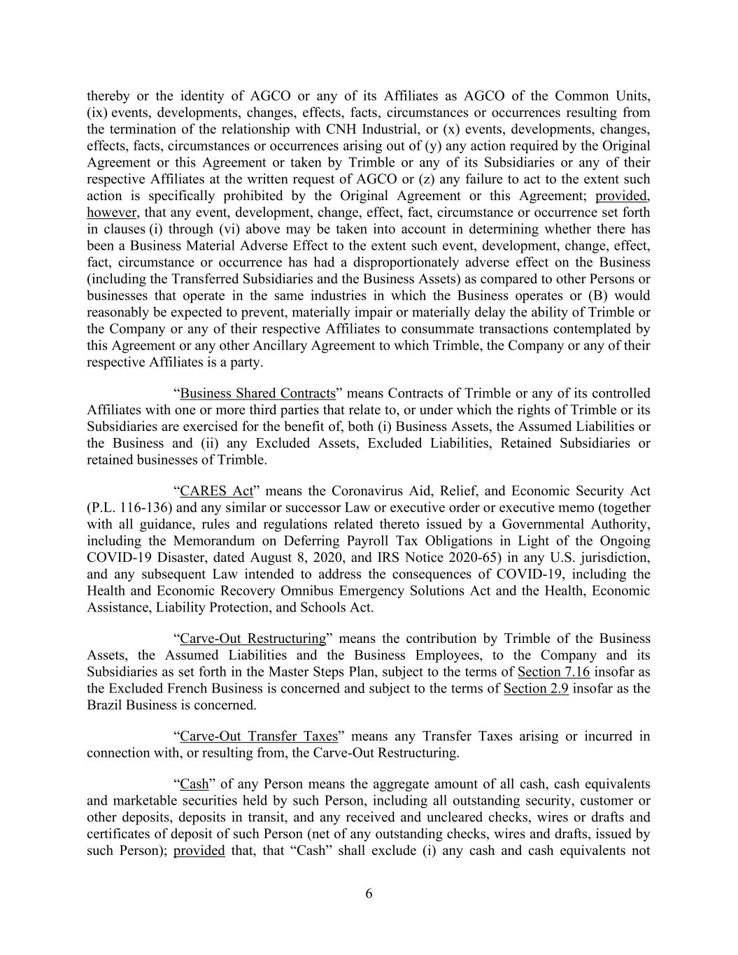 6 thereby or the identity of AGCO or any of its Affiliates as AGCO of the Common Units, (ix) events, developments, changes, effects, facts, circumstances or occurrences resulting from the termination of the relationship with CNH Industrial, or (x) events, developments, changes, effects, facts, circumstances or occurrences arising out of (y) any action required by the Original Agreement or this Agreement or taken by Trimble or any of its Subsidiaries or any of their respective Affiliates at the written request of AGCO or (z) any failure to act to the extent such action is specifically prohibited by the Original Agreement or this Agreement; provided, however, that any event, development, change, effect, fact, circumstance or occurrence set forth in clauses (i) through (vi) above may be taken into account in determining whether there has been a Business Material Adverse Effect to the extent such event, development, change, effect, fact, circumstance or occurrence has had a disproportionately adverse effect on the Business (including the Transferred Subsidiaries and the Business Assets) as compared to other Persons or businesses that operate in the same industries in which the Business operates or (B) would reasonably be expected to prevent, materially impair or materially delay the ability of Trimble or the Company or any of their respective Affiliates to consummate transactions contemplated by this Agreement or any other Ancillary Agreement to which Trimble, the Company or any of their respective Affiliates is a party. “Business Shared Contracts” means Contracts of Trimble or any of its controlled Affiliates with one or more third parties that relate to, or under which the rights of Trimble or its Subsidiaries are exercised for the benefit of, both (i) Business Assets, the Assumed Liabilities or the Business and (ii) any Excluded Assets, Excluded Liabilities, Retained Subsidiaries or retained businesses of Trimble. “CARES Act” means the Coronavirus Aid, Relief, and Economic Security Act (P.L. 116-136) and any similar or successor Law or executive order or executive memo (together with all guidance, rules and regulations related thereto issued by a Governmental Authority, including the Memorandum on Deferring Payroll Tax Obligations in Light of the Ongoing COVID-19 Disaster, dated August 8, 2020, and IRS Notice 2020-65) in any U.S. jurisdiction, and any subsequent Law intended to address the consequences of COVID-19, including the Health and Economic Recovery Omnibus Emergency Solutions Act and the Health, Economic Assistance, Liability Protection, and Schools Act. “Carve-Out Restructuring” means the contribution by Trimble of the Business Assets, the Assumed Liabilities and the Business Employees, to the Company and its Subsidiaries as set forth in the Master Steps Plan, subject to the terms of Section 7.16 insofar as the Excluded French Business is concerned and subject to the terms of Section 2.9 insofar as the Brazil Business is concerned. “Carve-Out Transfer Taxes” means any Transfer Taxes arising or incurred in connection with, or resulting from, the Carve-Out Restructuring. “Cash” of any Person means the aggregate amount of all cash, cash equivalents and marketable securities held by such Person, including all outstanding security, customer or other deposits, deposits in transit, and any received and uncleared checks, wires or drafts and certificates of deposit of such Person (net of any outstanding checks, wires and drafts, issued by such Person); provided that, that “Cash” shall exclude (i) any cash and cash equivalents not
