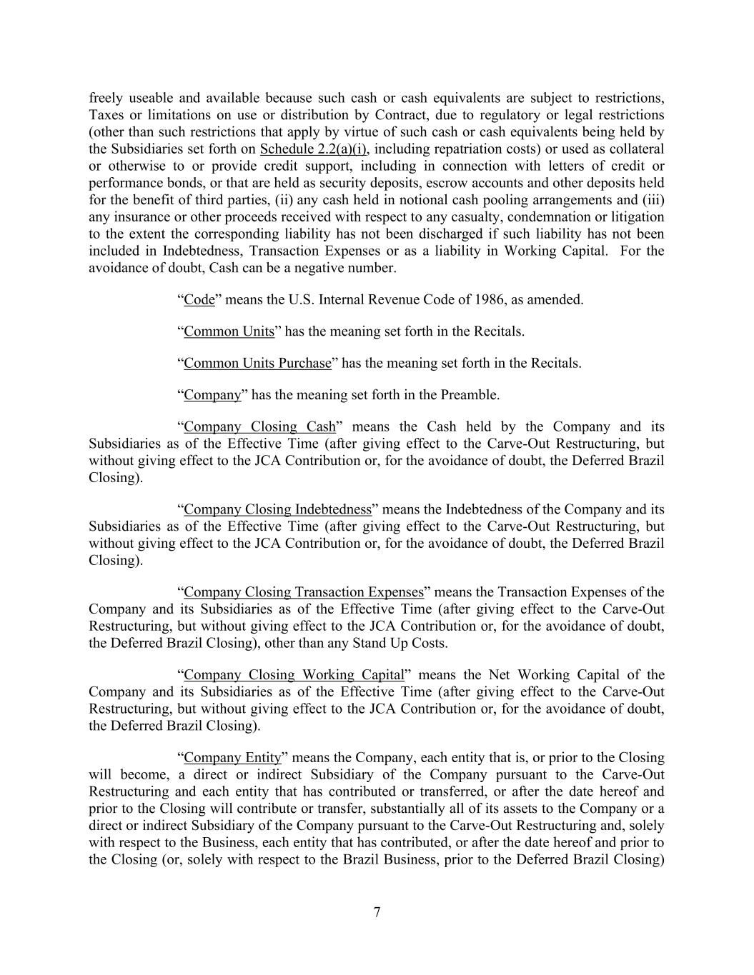 7 freely useable and available because such cash or cash equivalents are subject to restrictions, Taxes or limitations on use or distribution by Contract, due to regulatory or legal restrictions (other than such restrictions that apply by virtue of such cash or cash equivalents being held by the Subsidiaries set forth on Schedule 2.2(a)(i), including repatriation costs) or used as collateral or otherwise to or provide credit support, including in connection with letters of credit or performance bonds, or that are held as security deposits, escrow accounts and other deposits held for the benefit of third parties, (ii) any cash held in notional cash pooling arrangements and (iii) any insurance or other proceeds received with respect to any casualty, condemnation or litigation to the extent the corresponding liability has not been discharged if such liability has not been included in Indebtedness, Transaction Expenses or as a liability in Working Capital. For the avoidance of doubt, Cash can be a negative number. “Code” means the U.S. Internal Revenue Code of 1986, as amended. “Common Units” has the meaning set forth in the Recitals. “Common Units Purchase” has the meaning set forth in the Recitals. “Company” has the meaning set forth in the Preamble. “Company Closing Cash” means the Cash held by the Company and its Subsidiaries as of the Effective Time (after giving effect to the Carve-Out Restructuring, but without giving effect to the JCA Contribution or, for the avoidance of doubt, the Deferred Brazil Closing). “Company Closing Indebtedness” means the Indebtedness of the Company and its Subsidiaries as of the Effective Time (after giving effect to the Carve-Out Restructuring, but without giving effect to the JCA Contribution or, for the avoidance of doubt, the Deferred Brazil Closing). “Company Closing Transaction Expenses” means the Transaction Expenses of the Company and its Subsidiaries as of the Effective Time (after giving effect to the Carve-Out Restructuring, but without giving effect to the JCA Contribution or, for the avoidance of doubt, the Deferred Brazil Closing), other than any Stand Up Costs. “Company Closing Working Capital” means the Net Working Capital of the Company and its Subsidiaries as of the Effective Time (after giving effect to the Carve-Out Restructuring, but without giving effect to the JCA Contribution or, for the avoidance of doubt, the Deferred Brazil Closing). “Company Entity” means the Company, each entity that is, or prior to the Closing will become, a direct or indirect Subsidiary of the Company pursuant to the Carve-Out Restructuring and each entity that has contributed or transferred, or after the date hereof and prior to the Closing will contribute or transfer, substantially all of its assets to the Company or a direct or indirect Subsidiary of the Company pursuant to the Carve-Out Restructuring and, solely with respect to the Business, each entity that has contributed, or after the date hereof and prior to the Closing (or, solely with respect to the Brazil Business, prior to the Deferred Brazil Closing)