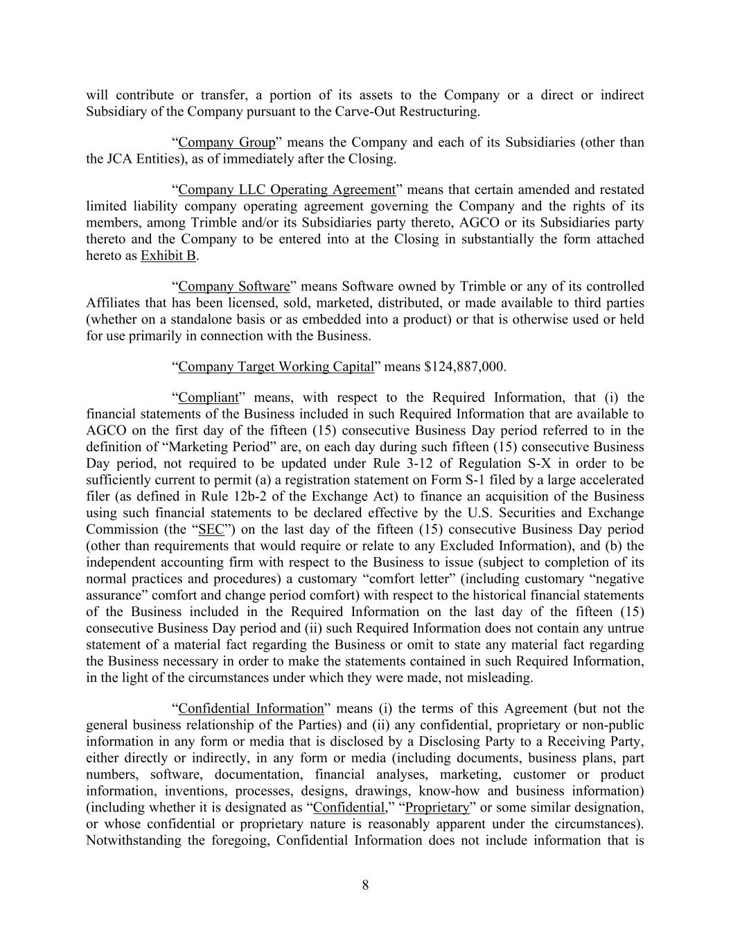 8 will contribute or transfer, a portion of its assets to the Company or a direct or indirect Subsidiary of the Company pursuant to the Carve-Out Restructuring. “Company Group” means the Company and each of its Subsidiaries (other than the JCA Entities), as of immediately after the Closing. “Company LLC Operating Agreement” means that certain amended and restated limited liability company operating agreement governing the Company and the rights of its members, among Trimble and/or its Subsidiaries party thereto, AGCO or its Subsidiaries party thereto and the Company to be entered into at the Closing in substantially the form attached hereto as Exhibit B. “Company Software” means Software owned by Trimble or any of its controlled Affiliates that has been licensed, sold, marketed, distributed, or made available to third parties (whether on a standalone basis or as embedded into a product) or that is otherwise used or held for use primarily in connection with the Business. “Company Target Working Capital” means $124,887,000. “Compliant” means, with respect to the Required Information, that (i) the financial statements of the Business included in such Required Information that are available to AGCO on the first day of the fifteen (15) consecutive Business Day period referred to in the definition of “Marketing Period” are, on each day during such fifteen (15) consecutive Business Day period, not required to be updated under Rule 3-12 of Regulation S-X in order to be sufficiently current to permit (a) a registration statement on Form S-1 filed by a large accelerated filer (as defined in Rule 12b-2 of the Exchange Act) to finance an acquisition of the Business using such financial statements to be declared effective by the U.S. Securities and Exchange Commission (the “SEC”) on the last day of the fifteen (15) consecutive Business Day period (other than requirements that would require or relate to any Excluded Information), and (b) the independent accounting firm with respect to the Business to issue (subject to completion of its normal practices and procedures) a customary “comfort letter” (including customary “negative assurance” comfort and change period comfort) with respect to the historical financial statements of the Business included in the Required Information on the last day of the fifteen (15) consecutive Business Day period and (ii) such Required Information does not contain any untrue statement of a material fact regarding the Business or omit to state any material fact regarding the Business necessary in order to make the statements contained in such Required Information, in the light of the circumstances under which they were made, not misleading. “Confidential Information” means (i) the terms of this Agreement (but not the general business relationship of the Parties) and (ii) any confidential, proprietary or non-public information in any form or media that is disclosed by a Disclosing Party to a Receiving Party, either directly or indirectly, in any form or media (including documents, business plans, part numbers, software, documentation, financial analyses, marketing, customer or product information, inventions, processes, designs, drawings, know-how and business information) (including whether it is designated as “Confidential,” “Proprietary” or some similar designation, or whose confidential or proprietary nature is reasonably apparent under the circumstances). Notwithstanding the foregoing, Confidential Information does not include information that is
