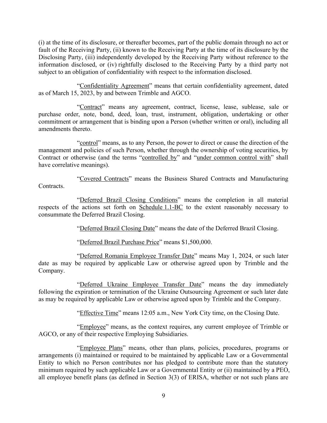 9 (i) at the time of its disclosure, or thereafter becomes, part of the public domain through no act or fault of the Receiving Party, (ii) known to the Receiving Party at the time of its disclosure by the Disclosing Party, (iii) independently developed by the Receiving Party without reference to the information disclosed, or (iv) rightfully disclosed to the Receiving Party by a third party not subject to an obligation of confidentiality with respect to the information disclosed. “Confidentiality Agreement” means that certain confidentiality agreement, dated as of March 15, 2023, by and between Trimble and AGCO. “Contract” means any agreement, contract, license, lease, sublease, sale or purchase order, note, bond, deed, loan, trust, instrument, obligation, undertaking or other commitment or arrangement that is binding upon a Person (whether written or oral), including all amendments thereto. “control” means, as to any Person, the power to direct or cause the direction of the management and policies of such Person, whether through the ownership of voting securities, by Contract or otherwise (and the terms “controlled by” and “under common control with” shall have correlative meanings). “Covered Contracts” means the Business Shared Contracts and Manufacturing Contracts. “Deferred Brazil Closing Conditions” means the completion in all material respects of the actions set forth on Schedule 1.1-BC to the extent reasonably necessary to consummate the Deferred Brazil Closing. “Deferred Brazil Closing Date” means the date of the Deferred Brazil Closing. “Deferred Brazil Purchase Price” means $1,500,000. “Deferred Romania Employee Transfer Date” means May 1, 2024, or such later date as may be required by applicable Law or otherwise agreed upon by Trimble and the Company. “Deferred Ukraine Employee Transfer Date” means the day immediately following the expiration or termination of the Ukraine Outsourcing Agreement or such later date as may be required by applicable Law or otherwise agreed upon by Trimble and the Company. “Effective Time” means 12:05 a.m., New York City time, on the Closing Date. “Employee” means, as the context requires, any current employee of Trimble or AGCO, or any of their respective Employing Subsidiaries. “Employee Plans” means, other than plans, policies, procedures, programs or arrangements (i) maintained or required to be maintained by applicable Law or a Governmental Entity to which no Person contributes nor has pledged to contribute more than the statutory minimum required by such applicable Law or a Governmental Entity or (ii) maintained by a PEO, all employee benefit plans (as defined in Section 3(3) of ERISA, whether or not such plans are