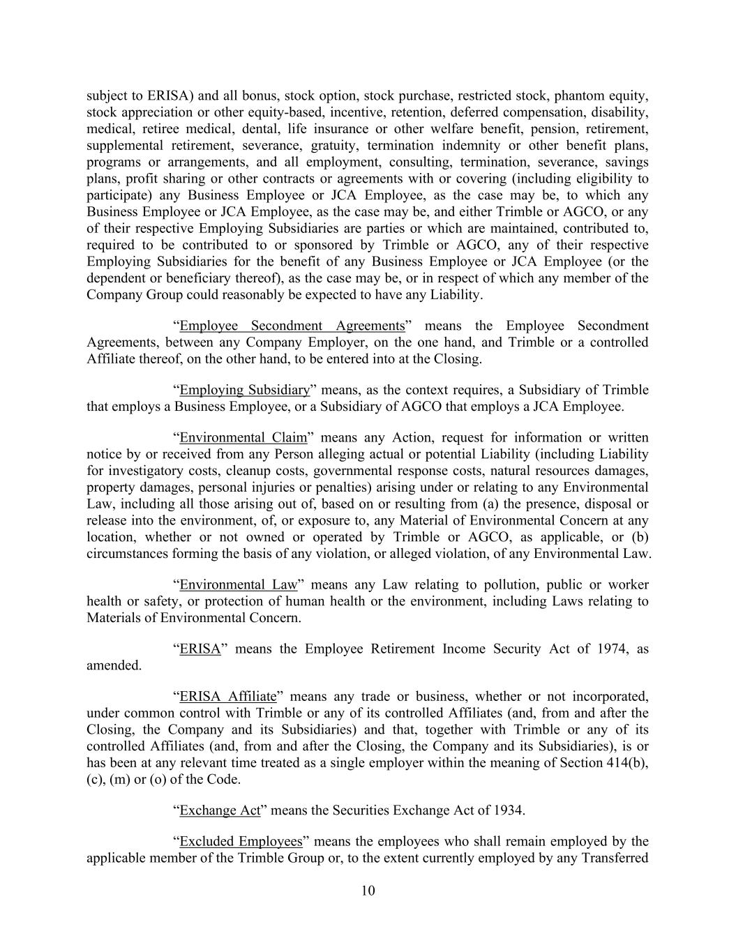 10 subject to ERISA) and all bonus, stock option, stock purchase, restricted stock, phantom equity, stock appreciation or other equity-based, incentive, retention, deferred compensation, disability, medical, retiree medical, dental, life insurance or other welfare benefit, pension, retirement, supplemental retirement, severance, gratuity, termination indemnity or other benefit plans, programs or arrangements, and all employment, consulting, termination, severance, savings plans, profit sharing or other contracts or agreements with or covering (including eligibility to participate) any Business Employee or JCA Employee, as the case may be, to which any Business Employee or JCA Employee, as the case may be, and either Trimble or AGCO, or any of their respective Employing Subsidiaries are parties or which are maintained, contributed to, required to be contributed to or sponsored by Trimble or AGCO, any of their respective Employing Subsidiaries for the benefit of any Business Employee or JCA Employee (or the dependent or beneficiary thereof), as the case may be, or in respect of which any member of the Company Group could reasonably be expected to have any Liability. “Employee Secondment Agreements” means the Employee Secondment Agreements, between any Company Employer, on the one hand, and Trimble or a controlled Affiliate thereof, on the other hand, to be entered into at the Closing. “Employing Subsidiary” means, as the context requires, a Subsidiary of Trimble that employs a Business Employee, or a Subsidiary of AGCO that employs a JCA Employee. “Environmental Claim” means any Action, request for information or written notice by or received from any Person alleging actual or potential Liability (including Liability for investigatory costs, cleanup costs, governmental response costs, natural resources damages, property damages, personal injuries or penalties) arising under or relating to any Environmental Law, including all those arising out of, based on or resulting from (a) the presence, disposal or release into the environment, of, or exposure to, any Material of Environmental Concern at any location, whether or not owned or operated by Trimble or AGCO, as applicable, or (b) circumstances forming the basis of any violation, or alleged violation, of any Environmental Law. “Environmental Law” means any Law relating to pollution, public or worker health or safety, or protection of human health or the environment, including Laws relating to Materials of Environmental Concern. “ERISA” means the Employee Retirement Income Security Act of 1974, as amended. “ERISA Affiliate” means any trade or business, whether or not incorporated, under common control with Trimble or any of its controlled Affiliates (and, from and after the Closing, the Company and its Subsidiaries) and that, together with Trimble or any of its controlled Affiliates (and, from and after the Closing, the Company and its Subsidiaries), is or has been at any relevant time treated as a single employer within the meaning of Section 414(b), (c), (m) or (o) of the Code. “Exchange Act” means the Securities Exchange Act of 1934. “Excluded Employees” means the employees who shall remain employed by the applicable member of the Trimble Group or, to the extent currently employed by any Transferred