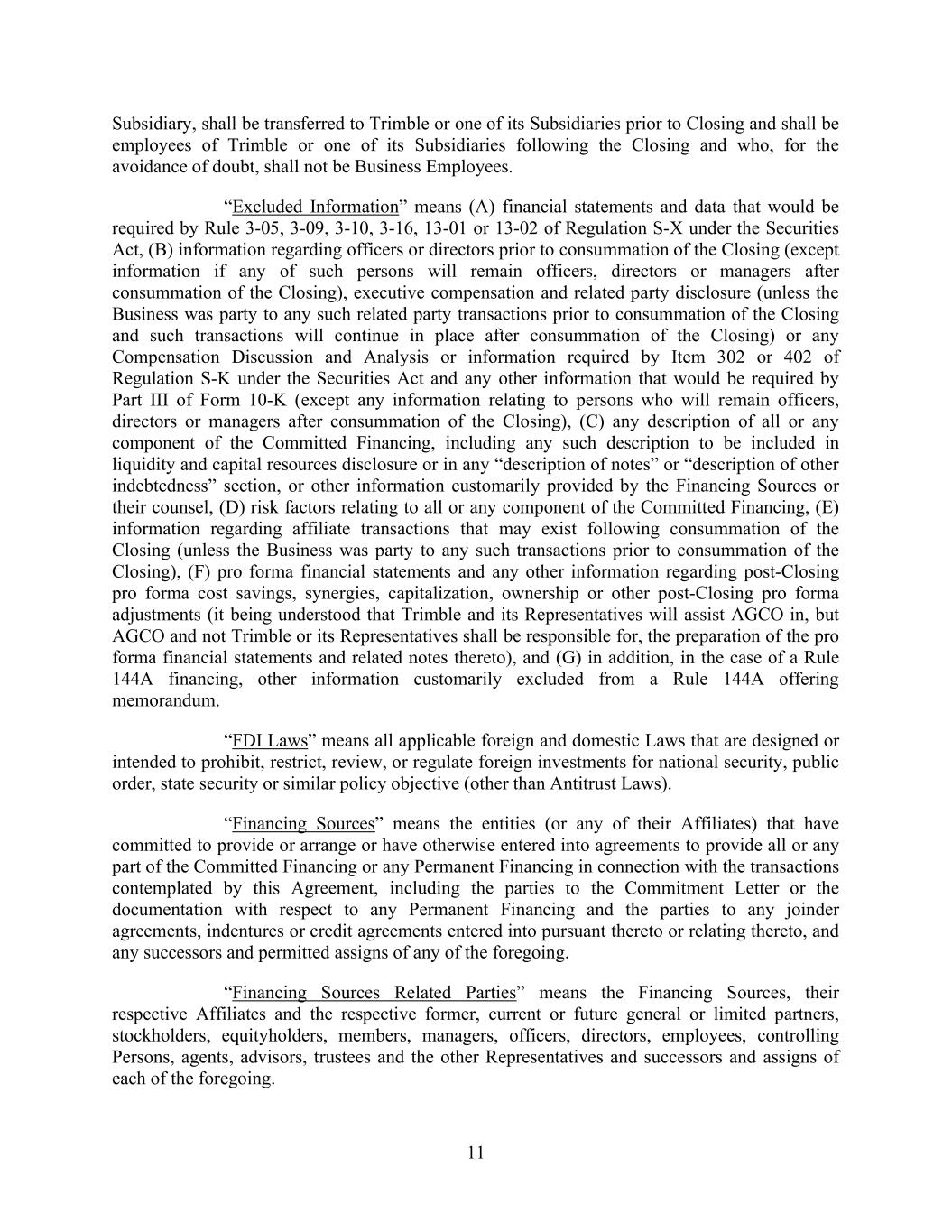 11 Subsidiary, shall be transferred to Trimble or one of its Subsidiaries prior to Closing and shall be employees of Trimble or one of its Subsidiaries following the Closing and who, for the avoidance of doubt, shall not be Business Employees. “Excluded Information” means (A) financial statements and data that would be required by Rule 3-05, 3-09, 3-10, 3-16, 13-01 or 13-02 of Regulation S-X under the Securities Act, (B) information regarding officers or directors prior to consummation of the Closing (except information if any of such persons will remain officers, directors or managers after consummation of the Closing), executive compensation and related party disclosure (unless the Business was party to any such related party transactions prior to consummation of the Closing and such transactions will continue in place after consummation of the Closing) or any Compensation Discussion and Analysis or information required by Item 302 or 402 of Regulation S-K under the Securities Act and any other information that would be required by Part III of Form 10-K (except any information relating to persons who will remain officers, directors or managers after consummation of the Closing), (C) any description of all or any component of the Committed Financing, including any such description to be included in liquidity and capital resources disclosure or in any “description of notes” or “description of other indebtedness” section, or other information customarily provided by the Financing Sources or their counsel, (D) risk factors relating to all or any component of the Committed Financing, (E) information regarding affiliate transactions that may exist following consummation of the Closing (unless the Business was party to any such transactions prior to consummation of the Closing), (F) pro forma financial statements and any other information regarding post-Closing pro forma cost savings, synergies, capitalization, ownership or other post-Closing pro forma adjustments (it being understood that Trimble and its Representatives will assist AGCO in, but AGCO and not Trimble or its Representatives shall be responsible for, the preparation of the pro forma financial statements and related notes thereto), and (G) in addition, in the case of a Rule 144A financing, other information customarily excluded from a Rule 144A offering memorandum. “FDI Laws” means all applicable foreign and domestic Laws that are designed or intended to prohibit, restrict, review, or regulate foreign investments for national security, public order, state security or similar policy objective (other than Antitrust Laws). “Financing Sources” means the entities (or any of their Affiliates) that have committed to provide or arrange or have otherwise entered into agreements to provide all or any part of the Committed Financing or any Permanent Financing in connection with the transactions contemplated by this Agreement, including the parties to the Commitment Letter or the documentation with respect to any Permanent Financing and the parties to any joinder agreements, indentures or credit agreements entered into pursuant thereto or relating thereto, and any successors and permitted assigns of any of the foregoing. “Financing Sources Related Parties” means the Financing Sources, their respective Affiliates and the respective former, current or future general or limited partners, stockholders, equityholders, members, managers, officers, directors, employees, controlling Persons, agents, advisors, trustees and the other Representatives and successors and assigns of each of the foregoing.