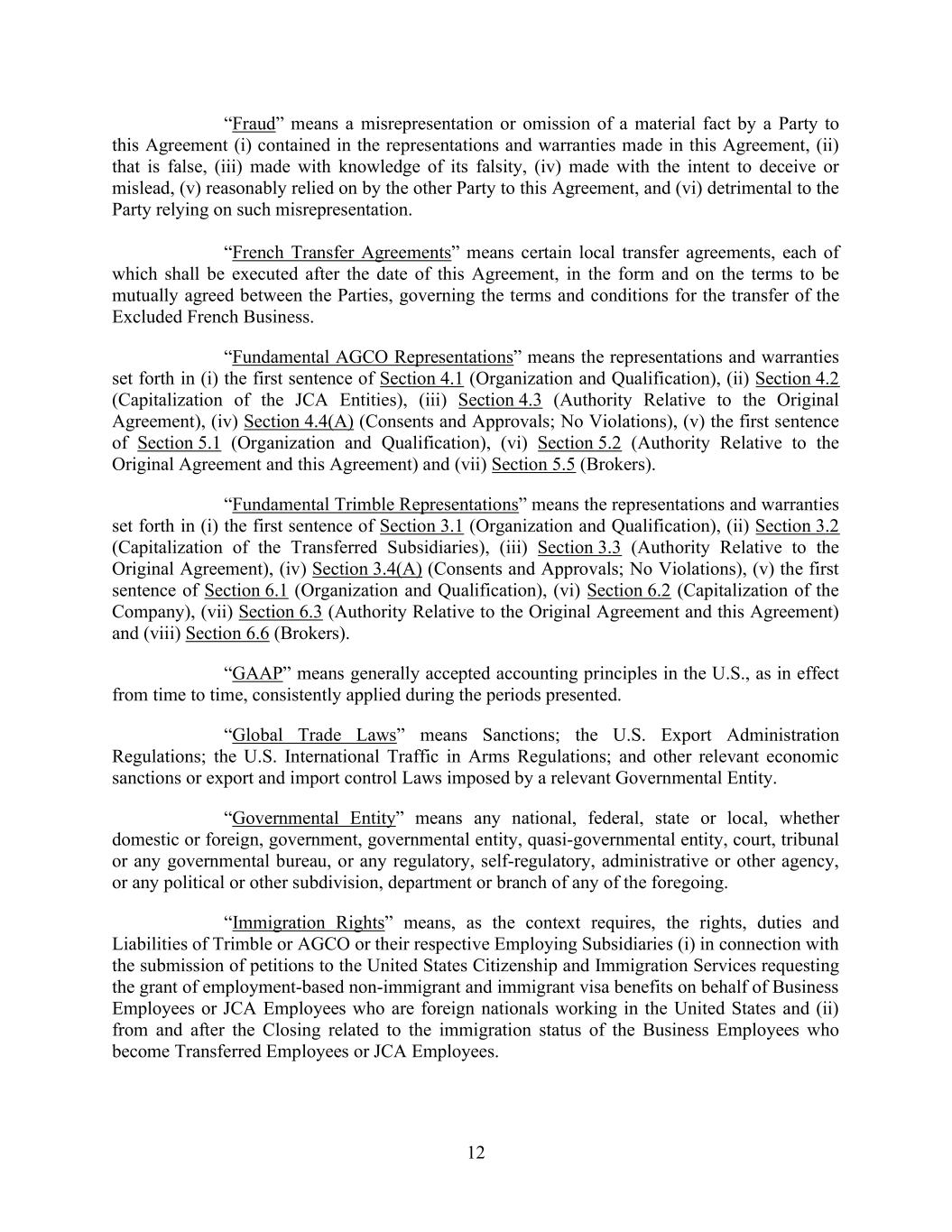 12 “Fraud” means a misrepresentation or omission of a material fact by a Party to this Agreement (i) contained in the representations and warranties made in this Agreement, (ii) that is false, (iii) made with knowledge of its falsity, (iv) made with the intent to deceive or mislead, (v) reasonably relied on by the other Party to this Agreement, and (vi) detrimental to the Party relying on such misrepresentation. “French Transfer Agreements” means certain local transfer agreements, each of which shall be executed after the date of this Agreement, in the form and on the terms to be mutually agreed between the Parties, governing the terms and conditions for the transfer of the Excluded French Business. “Fundamental AGCO Representations” means the representations and warranties set forth in (i) the first sentence of Section 4.1 (Organization and Qualification), (ii) Section 4.2 (Capitalization of the JCA Entities), (iii) Section 4.3 (Authority Relative to the Original Agreement), (iv) Section 4.4(A) (Consents and Approvals; No Violations), (v) the first sentence of Section 5.1 (Organization and Qualification), (vi) Section 5.2 (Authority Relative to the Original Agreement and this Agreement) and (vii) Section 5.5 (Brokers). “Fundamental Trimble Representations” means the representations and warranties set forth in (i) the first sentence of Section 3.1 (Organization and Qualification), (ii) Section 3.2 (Capitalization of the Transferred Subsidiaries), (iii) Section 3.3 (Authority Relative to the Original Agreement), (iv) Section 3.4(A) (Consents and Approvals; No Violations), (v) the first sentence of Section 6.1 (Organization and Qualification), (vi) Section 6.2 (Capitalization of the Company), (vii) Section 6.3 (Authority Relative to the Original Agreement and this Agreement) and (viii) Section 6.6 (Brokers). “GAAP” means generally accepted accounting principles in the U.S., as in effect from time to time, consistently applied during the periods presented. “Global Trade Laws” means Sanctions; the U.S. Export Administration Regulations; the U.S. International Traffic in Arms Regulations; and other relevant economic sanctions or export and import control Laws imposed by a relevant Governmental Entity. “Governmental Entity” means any national, federal, state or local, whether domestic or foreign, government, governmental entity, quasi-governmental entity, court, tribunal or any governmental bureau, or any regulatory, self-regulatory, administrative or other agency, or any political or other subdivision, department or branch of any of the foregoing. “Immigration Rights” means, as the context requires, the rights, duties and Liabilities of Trimble or AGCO or their respective Employing Subsidiaries (i) in connection with the submission of petitions to the United States Citizenship and Immigration Services requesting the grant of employment-based non-immigrant and immigrant visa benefits on behalf of Business Employees or JCA Employees who are foreign nationals working in the United States and (ii) from and after the Closing related to the immigration status of the Business Employees who become Transferred Employees or JCA Employees.