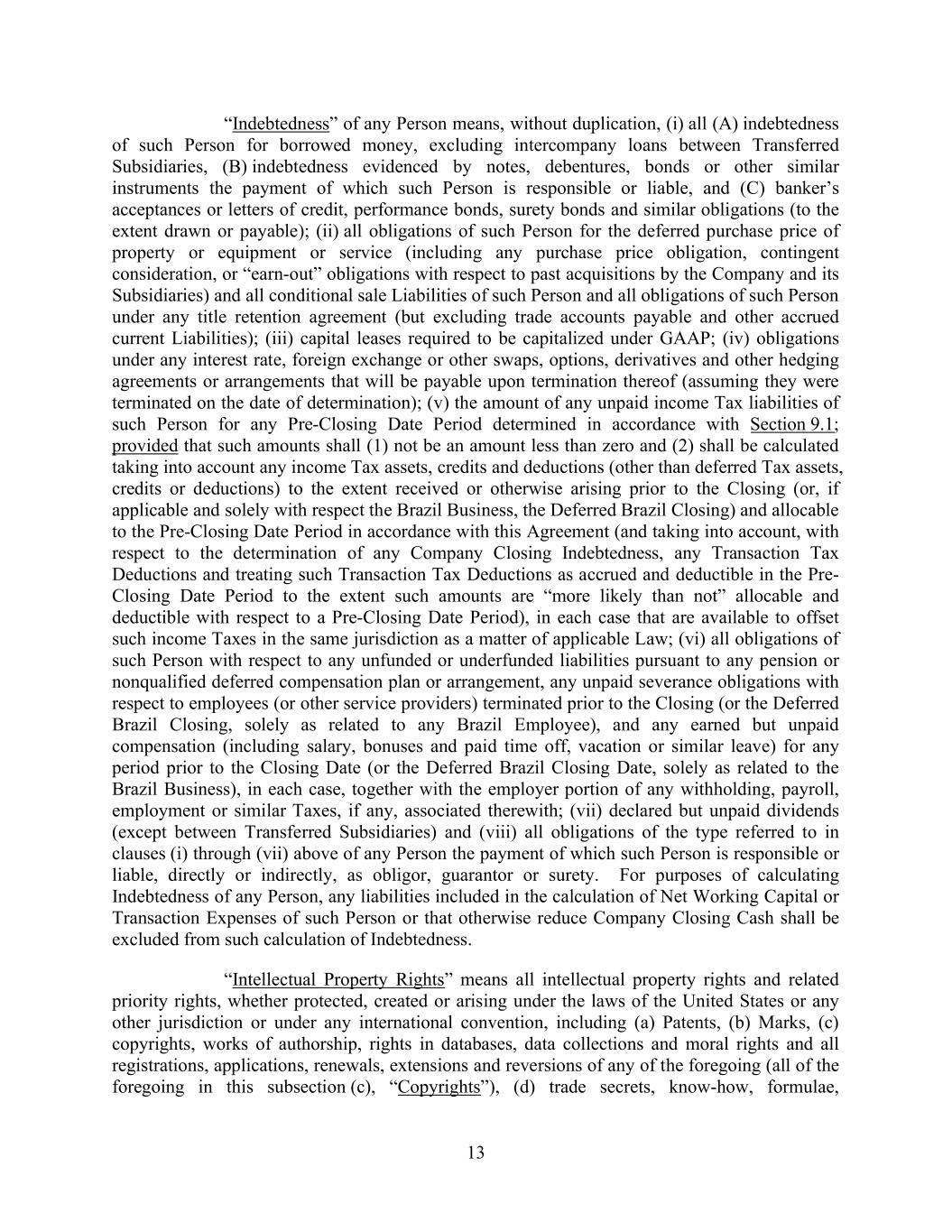 13 “Indebtedness” of any Person means, without duplication, (i) all (A) indebtedness of such Person for borrowed money, excluding intercompany loans between Transferred Subsidiaries, (B) indebtedness evidenced by notes, debentures, bonds or other similar instruments the payment of which such Person is responsible or liable, and (C) banker’s acceptances or letters of credit, performance bonds, surety bonds and similar obligations (to the extent drawn or payable); (ii) all obligations of such Person for the deferred purchase price of property or equipment or service (including any purchase price obligation, contingent consideration, or “earn-out” obligations with respect to past acquisitions by the Company and its Subsidiaries) and all conditional sale Liabilities of such Person and all obligations of such Person under any title retention agreement (but excluding trade accounts payable and other accrued current Liabilities); (iii) capital leases required to be capitalized under GAAP; (iv) obligations under any interest rate, foreign exchange or other swaps, options, derivatives and other hedging agreements or arrangements that will be payable upon termination thereof (assuming they were terminated on the date of determination); (v) the amount of any unpaid income Tax liabilities of such Person for any Pre-Closing Date Period determined in accordance with Section 9.1; provided that such amounts shall (1) not be an amount less than zero and (2) shall be calculated taking into account any income Tax assets, credits and deductions (other than deferred Tax assets, credits or deductions) to the extent received or otherwise arising prior to the Closing (or, if applicable and solely with respect the Brazil Business, the Deferred Brazil Closing) and allocable to the Pre-Closing Date Period in accordance with this Agreement (and taking into account, with respect to the determination of any Company Closing Indebtedness, any Transaction Tax Deductions and treating such Transaction Tax Deductions as accrued and deductible in the Pre- Closing Date Period to the extent such amounts are “more likely than not” allocable and deductible with respect to a Pre-Closing Date Period), in each case that are available to offset such income Taxes in the same jurisdiction as a matter of applicable Law; (vi) all obligations of such Person with respect to any unfunded or underfunded liabilities pursuant to any pension or nonqualified deferred compensation plan or arrangement, any unpaid severance obligations with respect to employees (or other service providers) terminated prior to the Closing (or the Deferred Brazil Closing, solely as related to any Brazil Employee), and any earned but unpaid compensation (including salary, bonuses and paid time off, vacation or similar leave) for any period prior to the Closing Date (or the Deferred Brazil Closing Date, solely as related to the Brazil Business), in each case, together with the employer portion of any withholding, payroll, employment or similar Taxes, if any, associated therewith; (vii) declared but unpaid dividends (except between Transferred Subsidiaries) and (viii) all obligations of the type referred to in clauses (i) through (vii) above of any Person the payment of which such Person is responsible or liable, directly or indirectly, as obligor, guarantor or surety. For purposes of calculating Indebtedness of any Person, any liabilities included in the calculation of Net Working Capital or Transaction Expenses of such Person or that otherwise reduce Company Closing Cash shall be excluded from such calculation of Indebtedness. “Intellectual Property Rights” means all intellectual property rights and related priority rights, whether protected, created or arising under the laws of the United States or any other jurisdiction or under any international convention, including (a) Patents, (b) Marks, (c) copyrights, works of authorship, rights in databases, data collections and moral rights and all registrations, applications, renewals, extensions and reversions of any of the foregoing (all of the foregoing in this subsection (c), “Copyrights”), (d) trade secrets, know-how, formulae,