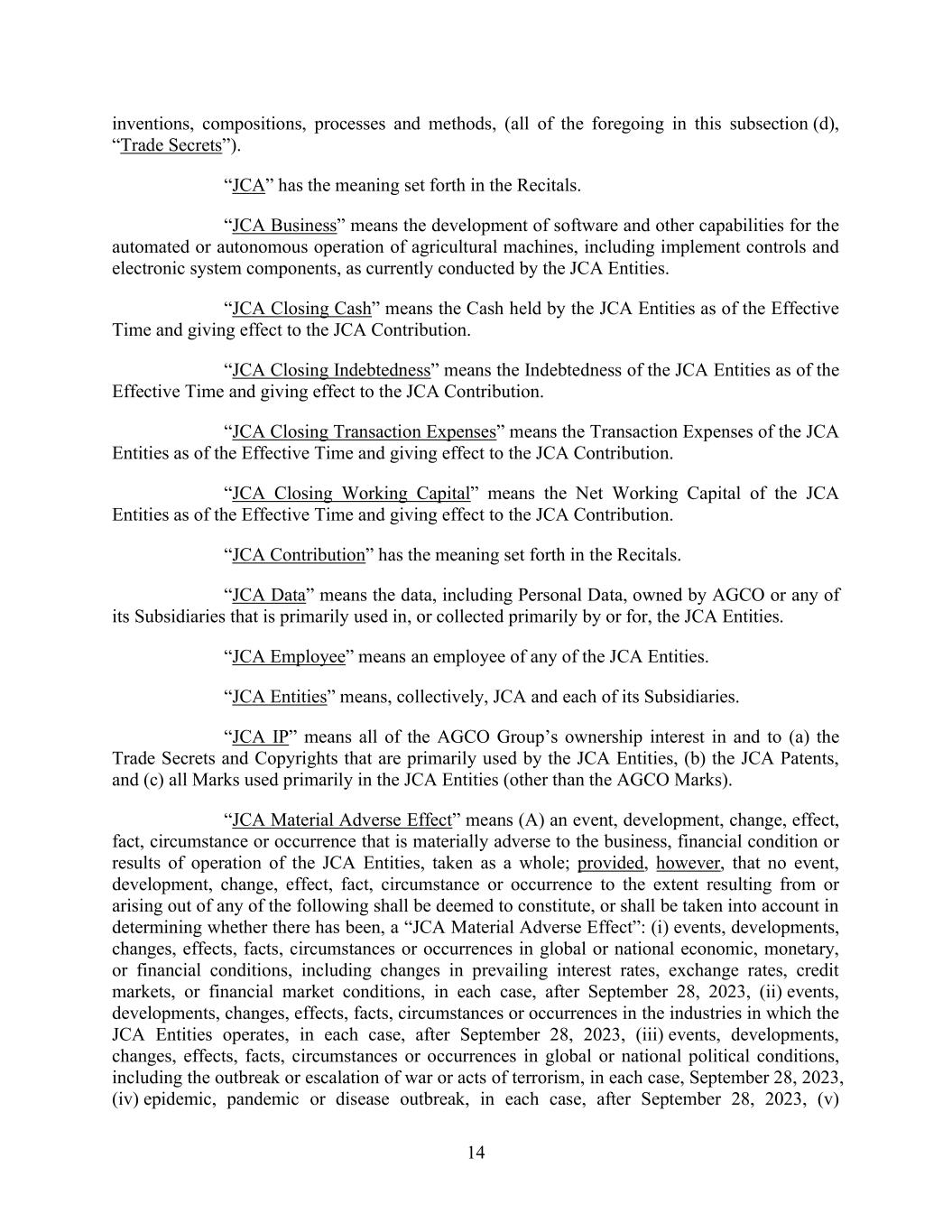 14 inventions, compositions, processes and methods, (all of the foregoing in this subsection (d), “Trade Secrets”). “JCA” has the meaning set forth in the Recitals. “JCA Business” means the development of software and other capabilities for the automated or autonomous operation of agricultural machines, including implement controls and electronic system components, as currently conducted by the JCA Entities. “JCA Closing Cash” means the Cash held by the JCA Entities as of the Effective Time and giving effect to the JCA Contribution. “JCA Closing Indebtedness” means the Indebtedness of the JCA Entities as of the Effective Time and giving effect to the JCA Contribution. “JCA Closing Transaction Expenses” means the Transaction Expenses of the JCA Entities as of the Effective Time and giving effect to the JCA Contribution. “JCA Closing Working Capital” means the Net Working Capital of the JCA Entities as of the Effective Time and giving effect to the JCA Contribution. “JCA Contribution” has the meaning set forth in the Recitals. “JCA Data” means the data, including Personal Data, owned by AGCO or any of its Subsidiaries that is primarily used in, or collected primarily by or for, the JCA Entities. “JCA Employee” means an employee of any of the JCA Entities. “JCA Entities” means, collectively, JCA and each of its Subsidiaries. “JCA IP” means all of the AGCO Group’s ownership interest in and to (a) the Trade Secrets and Copyrights that are primarily used by the JCA Entities, (b) the JCA Patents, and (c) all Marks used primarily in the JCA Entities (other than the AGCO Marks). “JCA Material Adverse Effect” means (A) an event, development, change, effect, fact, circumstance or occurrence that is materially adverse to the business, financial condition or results of operation of the JCA Entities, taken as a whole; provided, however, that no event, development, change, effect, fact, circumstance or occurrence to the extent resulting from or arising out of any of the following shall be deemed to constitute, or shall be taken into account in determining whether there has been, a “JCA Material Adverse Effect”: (i) events, developments, changes, effects, facts, circumstances or occurrences in global or national economic, monetary, or financial conditions, including changes in prevailing interest rates, exchange rates, credit markets, or financial market conditions, in each case, after September 28, 2023, (ii) events, developments, changes, effects, facts, circumstances or occurrences in the industries in which the JCA Entities operates, in each case, after September 28, 2023, (iii) events, developments, changes, effects, facts, circumstances or occurrences in global or national political conditions, including the outbreak or escalation of war or acts of terrorism, in each case, September 28, 2023, (iv) epidemic, pandemic or disease outbreak, in each case, after September 28, 2023, (v)