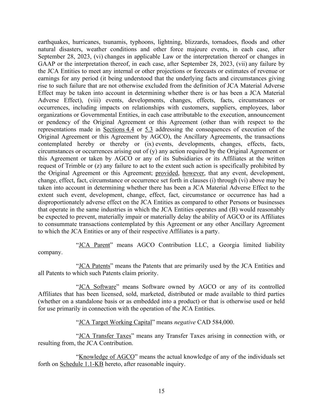 15 earthquakes, hurricanes, tsunamis, typhoons, lightning, blizzards, tornadoes, floods and other natural disasters, weather conditions and other force majeure events, in each case, after September 28, 2023, (vi) changes in applicable Law or the interpretation thereof or changes in GAAP or the interpretation thereof, in each case, after September 28, 2023, (vii) any failure by the JCA Entities to meet any internal or other projections or forecasts or estimates of revenue or earnings for any period (it being understood that the underlying facts and circumstances giving rise to such failure that are not otherwise excluded from the definition of JCA Material Adverse Effect may be taken into account in determining whether there is or has been a JCA Material Adverse Effect), (viii) events, developments, changes, effects, facts, circumstances or occurrences, including impacts on relationships with customers, suppliers, employees, labor organizations or Governmental Entities, in each case attributable to the execution, announcement or pendency of the Original Agreement or this Agreement (other than with respect to the representations made in Sections 4.4 or 5.3 addressing the consequences of execution of the Original Agreement or this Agreement by AGCO), the Ancillary Agreements, the transactions contemplated hereby or thereby or (ix) events, developments, changes, effects, facts, circumstances or occurrences arising out of (y) any action required by the Original Agreement or this Agreement or taken by AGCO or any of its Subsidiaries or its Affiliates at the written request of Trimble or (z) any failure to act to the extent such action is specifically prohibited by the Original Agreement or this Agreement; provided, however, that any event, development, change, effect, fact, circumstance or occurrence set forth in clauses (i) through (vi) above may be taken into account in determining whether there has been a JCA Material Adverse Effect to the extent such event, development, change, effect, fact, circumstance or occurrence has had a disproportionately adverse effect on the JCA Entities as compared to other Persons or businesses that operate in the same industries in which the JCA Entities operates and (B) would reasonably be expected to prevent, materially impair or materially delay the ability of AGCO or its Affiliates to consummate transactions contemplated by this Agreement or any other Ancillary Agreement to which the JCA Entities or any of their respective Affiliates is a party. “JCA Parent” means AGCO Contribution LLC, a Georgia limited liability company. “JCA Patents” means the Patents that are primarily used by the JCA Entities and all Patents to which such Patents claim priority. “JCA Software” means Software owned by AGCO or any of its controlled Affiliates that has been licensed, sold, marketed, distributed or made available to third parties (whether on a standalone basis or as embedded into a product) or that is otherwise used or held for use primarily in connection with the operation of the JCA Entities. “JCA Target Working Capital” means negative CAD 584,000. “JCA Transfer Taxes” means any Transfer Taxes arising in connection with, or resulting from, the JCA Contribution. “Knowledge of AGCO” means the actual knowledge of any of the individuals set forth on Schedule 1.1-KB hereto, after reasonable inquiry.