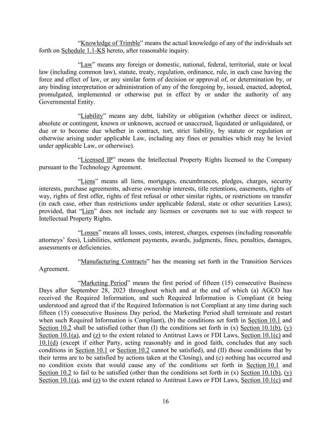 16 “Knowledge of Trimble” means the actual knowledge of any of the individuals set forth on Schedule 1.1-KS hereto, after reasonable inquiry. “Law” means any foreign or domestic, national, federal, territorial, state or local law (including common law), statute, treaty, regulation, ordinance, rule, in each case having the force and effect of law, or any similar form of decision or approval of, or determination by, or any binding interpretation or administration of any of the foregoing by, issued, enacted, adopted, promulgated, implemented or otherwise put in effect by or under the authority of any Governmental Entity. “Liability” means any debt, liability or obligation (whether direct or indirect, absolute or contingent, known or unknown, accrued or unaccrued, liquidated or unliquidated, or due or to become due whether in contract, tort, strict liability, by statute or regulation or otherwise arising under applicable Law, including any fines or penalties which may be levied under applicable Law, or otherwise). “Licensed IP” means the Intellectual Property Rights licensed to the Company pursuant to the Technology Agreement. “Liens” means all liens, mortgages, encumbrances, pledges, charges, security interests, purchase agreements, adverse ownership interests, title retentions, easements, rights of way, rights of first offer, rights of first refusal or other similar rights, or restrictions on transfer (in each case, other than restrictions under applicable federal, state or other securities Laws); provided, that “Lien” does not include any licenses or covenants not to sue with respect to Intellectual Property Rights. “Losses” means all losses, costs, interest, charges, expenses (including reasonable attorneys’ fees), Liabilities, settlement payments, awards, judgments, fines, penalties, damages, assessments or deficiencies. “Manufacturing Contracts” has the meaning set forth in the Transition Services Agreement. “Marketing Period” means the first period of fifteen (15) consecutive Business Days after September 28, 2023 throughout which and at the end of which (a) AGCO has received the Required Information, and such Required Information is Compliant (it being understood and agreed that if the Required Information is not Compliant at any time during such fifteen (15) consecutive Business Day period, the Marketing Period shall terminate and restart when such Required Information is Compliant), (b) the conditions set forth in Section 10.1 and Section 10.2 shall be satisfied (other than (I) the conditions set forth in (x) Section 10.1(b), (y) Section 10.1(a), and (z) to the extent related to Antitrust Laws or FDI Laws, Section 10.1(c) and 10.1(d) (except if either Party, acting reasonably and in good faith, concludes that any such conditions in Section 10.1 or Section 10.2 cannot be satisfied), and (II) those conditions that by their terms are to be satisfied by actions taken at the Closing), and (c) nothing has occurred and no condition exists that would cause any of the conditions set forth in Section 10.1 and Section 10.2 to fail to be satisfied (other than the conditions set forth in (x) Section 10.1(b), (y) Section 10.1(a), and (z) to the extent related to Antitrust Laws or FDI Laws, Section 10.1(c) and