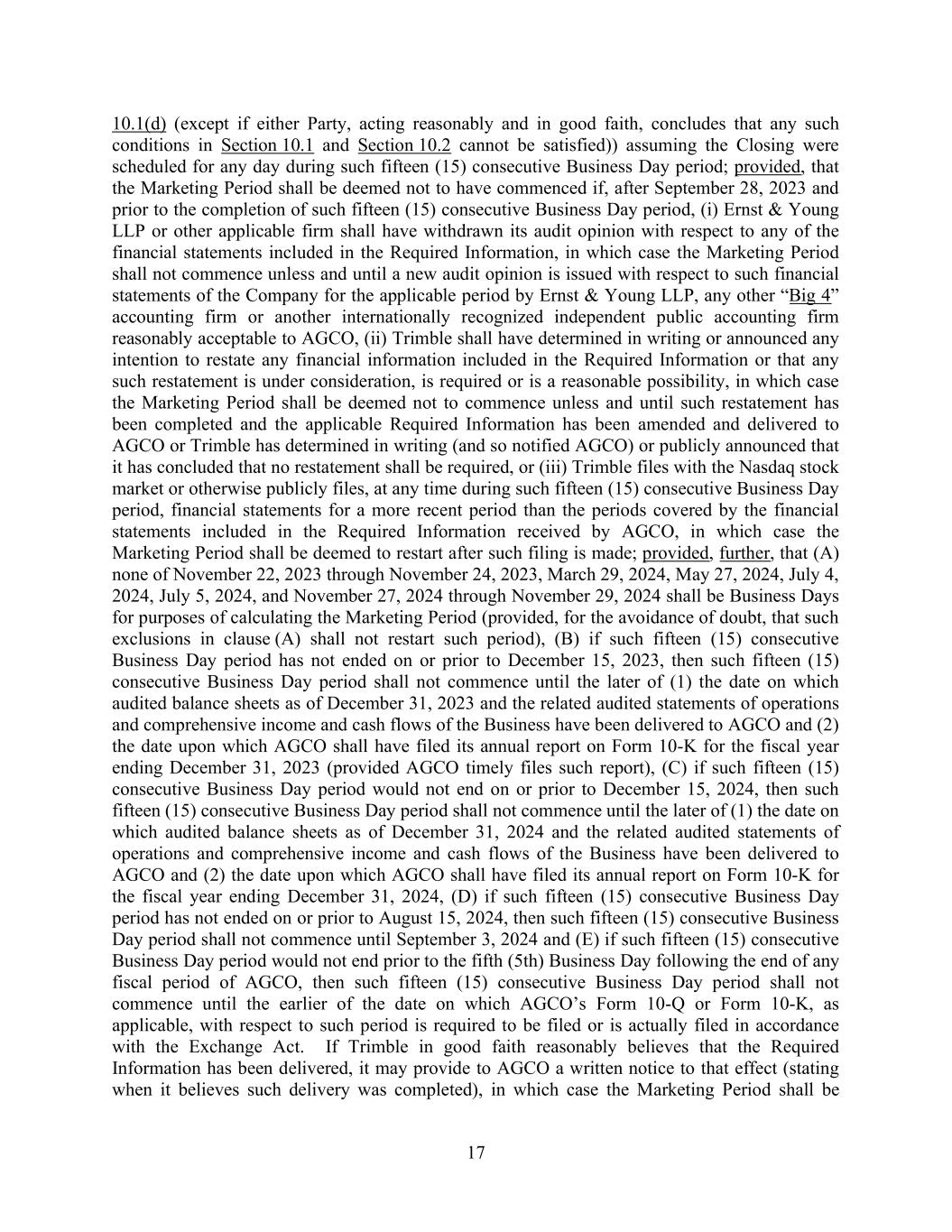 17 10.1(d) (except if either Party, acting reasonably and in good faith, concludes that any such conditions in Section 10.1 and Section 10.2 cannot be satisfied)) assuming the Closing were scheduled for any day during such fifteen (15) consecutive Business Day period; provided, that the Marketing Period shall be deemed not to have commenced if, after September 28, 2023 and prior to the completion of such fifteen (15) consecutive Business Day period, (i) Ernst & Young LLP or other applicable firm shall have withdrawn its audit opinion with respect to any of the financial statements included in the Required Information, in which case the Marketing Period shall not commence unless and until a new audit opinion is issued with respect to such financial statements of the Company for the applicable period by Ernst & Young LLP, any other “Big 4” accounting firm or another internationally recognized independent public accounting firm reasonably acceptable to AGCO, (ii) Trimble shall have determined in writing or announced any intention to restate any financial information included in the Required Information or that any such restatement is under consideration, is required or is a reasonable possibility, in which case the Marketing Period shall be deemed not to commence unless and until such restatement has been completed and the applicable Required Information has been amended and delivered to AGCO or Trimble has determined in writing (and so notified AGCO) or publicly announced that it has concluded that no restatement shall be required, or (iii) Trimble files with the Nasdaq stock market or otherwise publicly files, at any time during such fifteen (15) consecutive Business Day period, financial statements for a more recent period than the periods covered by the financial statements included in the Required Information received by AGCO, in which case the Marketing Period shall be deemed to restart after such filing is made; provided, further, that (A) none of November 22, 2023 through November 24, 2023, March 29, 2024, May 27, 2024, July 4, 2024, July 5, 2024, and November 27, 2024 through November 29, 2024 shall be Business Days for purposes of calculating the Marketing Period (provided, for the avoidance of doubt, that such exclusions in clause (A) shall not restart such period), (B) if such fifteen (15) consecutive Business Day period has not ended on or prior to December 15, 2023, then such fifteen (15) consecutive Business Day period shall not commence until the later of (1) the date on which audited balance sheets as of December 31, 2023 and the related audited statements of operations and comprehensive income and cash flows of the Business have been delivered to AGCO and (2) the date upon which AGCO shall have filed its annual report on Form 10-K for the fiscal year ending December 31, 2023 (provided AGCO timely files such report), (C) if such fifteen (15) consecutive Business Day period would not end on or prior to December 15, 2024, then such fifteen (15) consecutive Business Day period shall not commence until the later of (1) the date on which audited balance sheets as of December 31, 2024 and the related audited statements of operations and comprehensive income and cash flows of the Business have been delivered to AGCO and (2) the date upon which AGCO shall have filed its annual report on Form 10-K for the fiscal year ending December 31, 2024, (D) if such fifteen (15) consecutive Business Day period has not ended on or prior to August 15, 2024, then such fifteen (15) consecutive Business Day period shall not commence until September 3, 2024 and (E) if such fifteen (15) consecutive Business Day period would not end prior to the fifth (5th) Business Day following the end of any fiscal period of AGCO, then such fifteen (15) consecutive Business Day period shall not commence until the earlier of the date on which AGCO’s Form 10-Q or Form 10-K, as applicable, with respect to such period is required to be filed or is actually filed in accordance with the Exchange Act. If Trimble in good faith reasonably believes that the Required Information has been delivered, it may provide to AGCO a written notice to that effect (stating when it believes such delivery was completed), in which case the Marketing Period shall be