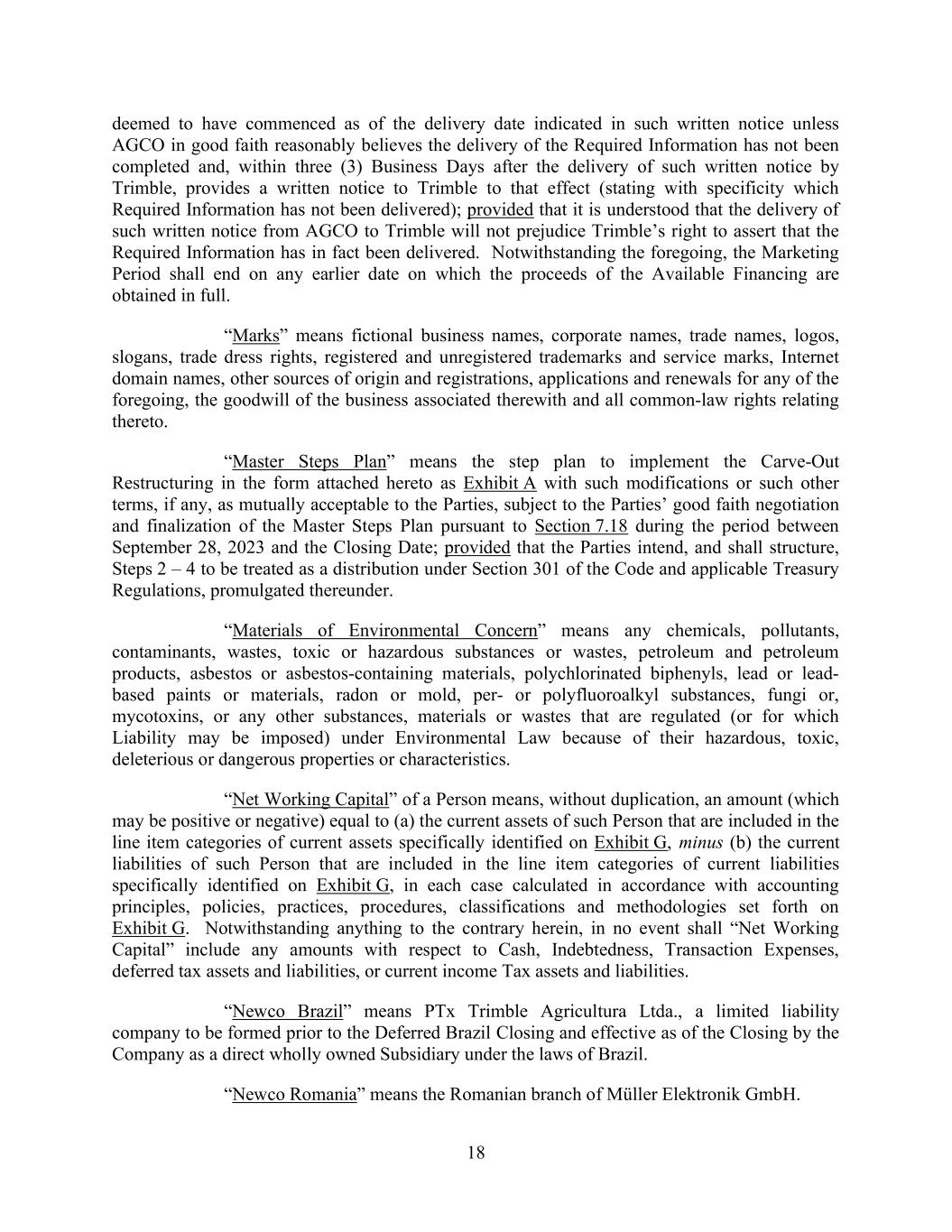 18 deemed to have commenced as of the delivery date indicated in such written notice unless AGCO in good faith reasonably believes the delivery of the Required Information has not been completed and, within three (3) Business Days after the delivery of such written notice by Trimble, provides a written notice to Trimble to that effect (stating with specificity which Required Information has not been delivered); provided that it is understood that the delivery of such written notice from AGCO to Trimble will not prejudice Trimble’s right to assert that the Required Information has in fact been delivered. Notwithstanding the foregoing, the Marketing Period shall end on any earlier date on which the proceeds of the Available Financing are obtained in full. “Marks” means fictional business names, corporate names, trade names, logos, slogans, trade dress rights, registered and unregistered trademarks and service marks, Internet domain names, other sources of origin and registrations, applications and renewals for any of the foregoing, the goodwill of the business associated therewith and all common-law rights relating thereto. “Master Steps Plan” means the step plan to implement the Carve-Out Restructuring in the form attached hereto as Exhibit A with such modifications or such other terms, if any, as mutually acceptable to the Parties, subject to the Parties’ good faith negotiation and finalization of the Master Steps Plan pursuant to Section 7.18 during the period between September 28, 2023 and the Closing Date; provided that the Parties intend, and shall structure, Steps 2 – 4 to be treated as a distribution under Section 301 of the Code and applicable Treasury Regulations, promulgated thereunder. “Materials of Environmental Concern” means any chemicals, pollutants, contaminants, wastes, toxic or hazardous substances or wastes, petroleum and petroleum products, asbestos or asbestos-containing materials, polychlorinated biphenyls, lead or lead- based paints or materials, radon or mold, per- or polyfluoroalkyl substances, fungi or, mycotoxins, or any other substances, materials or wastes that are regulated (or for which Liability may be imposed) under Environmental Law because of their hazardous, toxic, deleterious or dangerous properties or characteristics. “Net Working Capital” of a Person means, without duplication, an amount (which may be positive or negative) equal to (a) the current assets of such Person that are included in the line item categories of current assets specifically identified on Exhibit G, minus (b) the current liabilities of such Person that are included in the line item categories of current liabilities specifically identified on Exhibit G, in each case calculated in accordance with accounting principles, policies, practices, procedures, classifications and methodologies set forth on Exhibit G. Notwithstanding anything to the contrary herein, in no event shall “Net Working Capital” include any amounts with respect to Cash, Indebtedness, Transaction Expenses, deferred tax assets and liabilities, or current income Tax assets and liabilities. “Newco Brazil” means PTx Trimble Agricultura Ltda., a limited liability company to be formed prior to the Deferred Brazil Closing and effective as of the Closing by the Company as a direct wholly owned Subsidiary under the laws of Brazil. “Newco Romania” means the Romanian branch of Müller Elektronik GmbH.