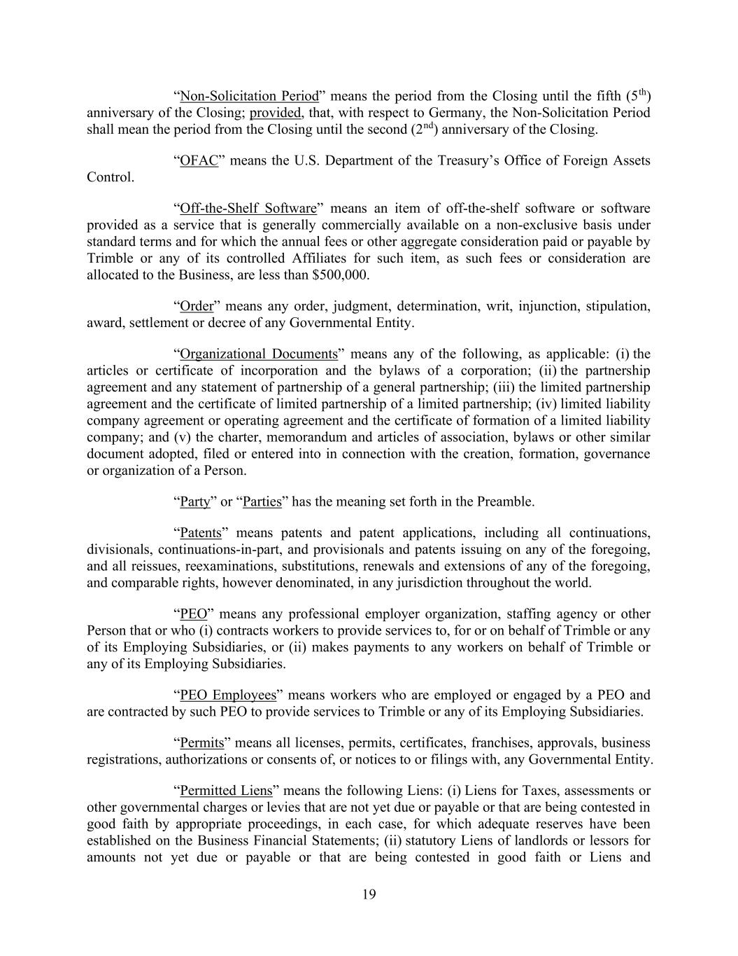 19 “Non-Solicitation Period” means the period from the Closing until the fifth (5th) anniversary of the Closing; provided, that, with respect to Germany, the Non-Solicitation Period shall mean the period from the Closing until the second (2nd) anniversary of the Closing. “OFAC” means the U.S. Department of the Treasury’s Office of Foreign Assets Control. “Off-the-Shelf Software” means an item of off-the-shelf software or software provided as a service that is generally commercially available on a non-exclusive basis under standard terms and for which the annual fees or other aggregate consideration paid or payable by Trimble or any of its controlled Affiliates for such item, as such fees or consideration are allocated to the Business, are less than $500,000. “Order” means any order, judgment, determination, writ, injunction, stipulation, award, settlement or decree of any Governmental Entity. “Organizational Documents” means any of the following, as applicable: (i) the articles or certificate of incorporation and the bylaws of a corporation; (ii) the partnership agreement and any statement of partnership of a general partnership; (iii) the limited partnership agreement and the certificate of limited partnership of a limited partnership; (iv) limited liability company agreement or operating agreement and the certificate of formation of a limited liability company; and (v) the charter, memorandum and articles of association, bylaws or other similar document adopted, filed or entered into in connection with the creation, formation, governance or organization of a Person. “Party” or “Parties” has the meaning set forth in the Preamble. “Patents” means patents and patent applications, including all continuations, divisionals, continuations-in-part, and provisionals and patents issuing on any of the foregoing, and all reissues, reexaminations, substitutions, renewals and extensions of any of the foregoing, and comparable rights, however denominated, in any jurisdiction throughout the world. “PEO” means any professional employer organization, staffing agency or other Person that or who (i) contracts workers to provide services to, for or on behalf of Trimble or any of its Employing Subsidiaries, or (ii) makes payments to any workers on behalf of Trimble or any of its Employing Subsidiaries. “PEO Employees” means workers who are employed or engaged by a PEO and are contracted by such PEO to provide services to Trimble or any of its Employing Subsidiaries. “Permits” means all licenses, permits, certificates, franchises, approvals, business registrations, authorizations or consents of, or notices to or filings with, any Governmental Entity. “Permitted Liens” means the following Liens: (i) Liens for Taxes, assessments or other governmental charges or levies that are not yet due or payable or that are being contested in good faith by appropriate proceedings, in each case, for which adequate reserves have been established on the Business Financial Statements; (ii) statutory Liens of landlords or lessors for amounts not yet due or payable or that are being contested in good faith or Liens and
