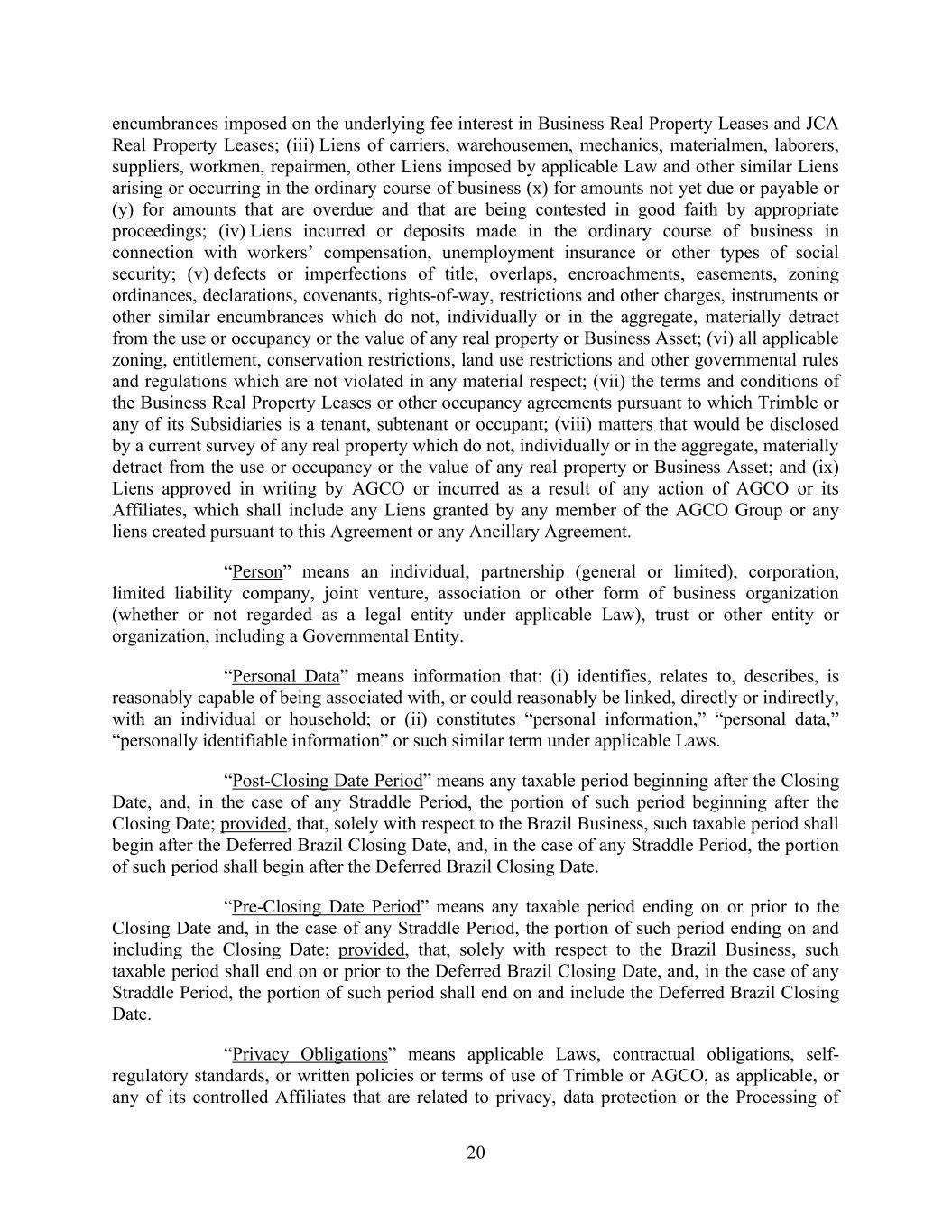 20 encumbrances imposed on the underlying fee interest in Business Real Property Leases and JCA Real Property Leases; (iii) Liens of carriers, warehousemen, mechanics, materialmen, laborers, suppliers, workmen, repairmen, other Liens imposed by applicable Law and other similar Liens arising or occurring in the ordinary course of business (x) for amounts not yet due or payable or (y) for amounts that are overdue and that are being contested in good faith by appropriate proceedings; (iv) Liens incurred or deposits made in the ordinary course of business in connection with workers’ compensation, unemployment insurance or other types of social security; (v) defects or imperfections of title, overlaps, encroachments, easements, zoning ordinances, declarations, covenants, rights-of-way, restrictions and other charges, instruments or other similar encumbrances which do not, individually or in the aggregate, materially detract from the use or occupancy or the value of any real property or Business Asset; (vi) all applicable zoning, entitlement, conservation restrictions, land use restrictions and other governmental rules and regulations which are not violated in any material respect; (vii) the terms and conditions of the Business Real Property Leases or other occupancy agreements pursuant to which Trimble or any of its Subsidiaries is a tenant, subtenant or occupant; (viii) matters that would be disclosed by a current survey of any real property which do not, individually or in the aggregate, materially detract from the use or occupancy or the value of any real property or Business Asset; and (ix) Liens approved in writing by AGCO or incurred as a result of any action of AGCO or its Affiliates, which shall include any Liens granted by any member of the AGCO Group or any liens created pursuant to this Agreement or any Ancillary Agreement. “Person” means an individual, partnership (general or limited), corporation, limited liability company, joint venture, association or other form of business organization (whether or not regarded as a legal entity under applicable Law), trust or other entity or organization, including a Governmental Entity. “Personal Data” means information that: (i) identifies, relates to, describes, is reasonably capable of being associated with, or could reasonably be linked, directly or indirectly, with an individual or household; or (ii) constitutes “personal information,” “personal data,” “personally identifiable information” or such similar term under applicable Laws. “Post-Closing Date Period” means any taxable period beginning after the Closing Date, and, in the case of any Straddle Period, the portion of such period beginning after the Closing Date; provided, that, solely with respect to the Brazil Business, such taxable period shall begin after the Deferred Brazil Closing Date, and, in the case of any Straddle Period, the portion of such period shall begin after the Deferred Brazil Closing Date. “Pre-Closing Date Period” means any taxable period ending on or prior to the Closing Date and, in the case of any Straddle Period, the portion of such period ending on and including the Closing Date; provided, that, solely with respect to the Brazil Business, such taxable period shall end on or prior to the Deferred Brazil Closing Date, and, in the case of any Straddle Period, the portion of such period shall end on and include the Deferred Brazil Closing Date. “Privacy Obligations” means applicable Laws, contractual obligations, self- regulatory standards, or written policies or terms of use of Trimble or AGCO, as applicable, or any of its controlled Affiliates that are related to privacy, data protection or the Processing of