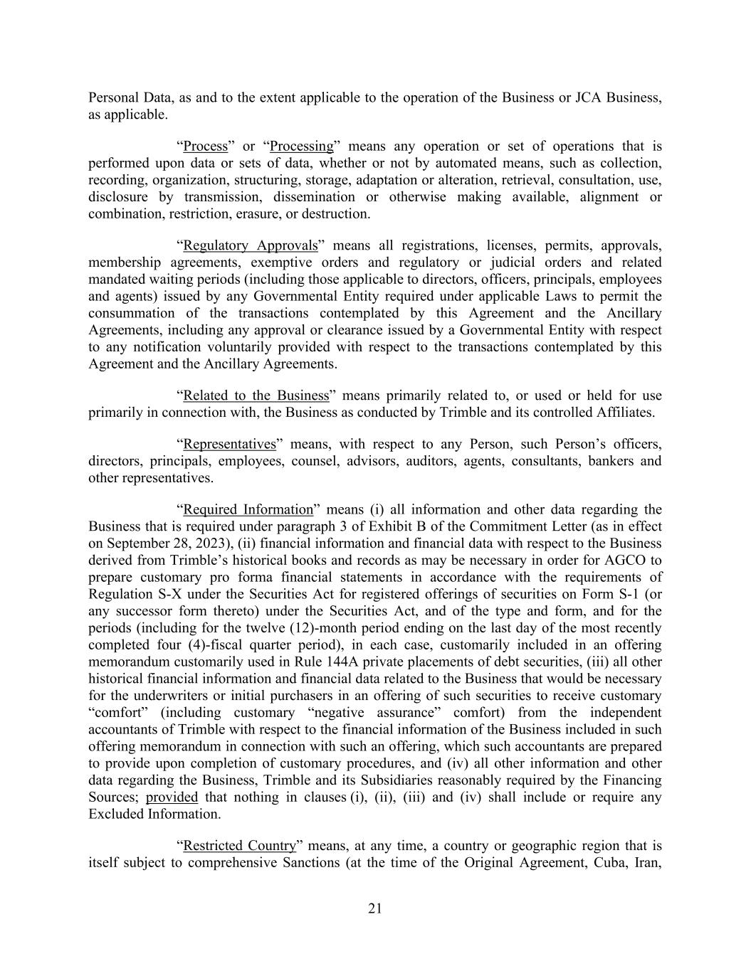 21 Personal Data, as and to the extent applicable to the operation of the Business or JCA Business, as applicable. “Process” or “Processing” means any operation or set of operations that is performed upon data or sets of data, whether or not by automated means, such as collection, recording, organization, structuring, storage, adaptation or alteration, retrieval, consultation, use, disclosure by transmission, dissemination or otherwise making available, alignment or combination, restriction, erasure, or destruction. “Regulatory Approvals” means all registrations, licenses, permits, approvals, membership agreements, exemptive orders and regulatory or judicial orders and related mandated waiting periods (including those applicable to directors, officers, principals, employees and agents) issued by any Governmental Entity required under applicable Laws to permit the consummation of the transactions contemplated by this Agreement and the Ancillary Agreements, including any approval or clearance issued by a Governmental Entity with respect to any notification voluntarily provided with respect to the transactions contemplated by this Agreement and the Ancillary Agreements. “Related to the Business” means primarily related to, or used or held for use primarily in connection with, the Business as conducted by Trimble and its controlled Affiliates. “Representatives” means, with respect to any Person, such Person’s officers, directors, principals, employees, counsel, advisors, auditors, agents, consultants, bankers and other representatives. “Required Information” means (i) all information and other data regarding the Business that is required under paragraph 3 of Exhibit B of the Commitment Letter (as in effect on September 28, 2023), (ii) financial information and financial data with respect to the Business derived from Trimble’s historical books and records as may be necessary in order for AGCO to prepare customary pro forma financial statements in accordance with the requirements of Regulation S-X under the Securities Act for registered offerings of securities on Form S-1 (or any successor form thereto) under the Securities Act, and of the type and form, and for the periods (including for the twelve (12)-month period ending on the last day of the most recently completed four (4)-fiscal quarter period), in each case, customarily included in an offering memorandum customarily used in Rule 144A private placements of debt securities, (iii) all other historical financial information and financial data related to the Business that would be necessary for the underwriters or initial purchasers in an offering of such securities to receive customary “comfort” (including customary “negative assurance” comfort) from the independent accountants of Trimble with respect to the financial information of the Business included in such offering memorandum in connection with such an offering, which such accountants are prepared to provide upon completion of customary procedures, and (iv) all other information and other data regarding the Business, Trimble and its Subsidiaries reasonably required by the Financing Sources; provided that nothing in clauses (i), (ii), (iii) and (iv) shall include or require any Excluded Information. “Restricted Country” means, at any time, a country or geographic region that is itself subject to comprehensive Sanctions (at the time of the Original Agreement, Cuba, Iran,