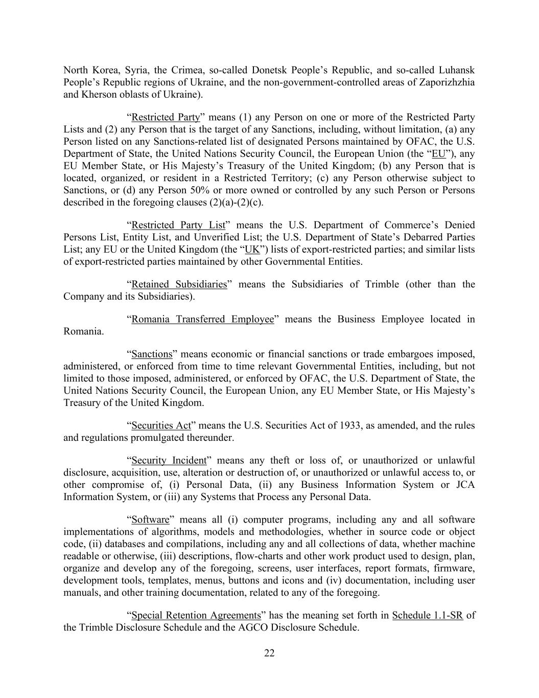 22 North Korea, Syria, the Crimea, so-called Donetsk People’s Republic, and so-called Luhansk People’s Republic regions of Ukraine, and the non-government-controlled areas of Zaporizhzhia and Kherson oblasts of Ukraine). “Restricted Party” means (1) any Person on one or more of the Restricted Party Lists and (2) any Person that is the target of any Sanctions, including, without limitation, (a) any Person listed on any Sanctions-related list of designated Persons maintained by OFAC, the U.S. Department of State, the United Nations Security Council, the European Union (the “EU”), any EU Member State, or His Majesty’s Treasury of the United Kingdom; (b) any Person that is located, organized, or resident in a Restricted Territory; (c) any Person otherwise subject to Sanctions, or (d) any Person 50% or more owned or controlled by any such Person or Persons described in the foregoing clauses (2)(a)-(2)(c). “Restricted Party List” means the U.S. Department of Commerce’s Denied Persons List, Entity List, and Unverified List; the U.S. Department of State’s Debarred Parties List; any EU or the United Kingdom (the “UK”) lists of export-restricted parties; and similar lists of export-restricted parties maintained by other Governmental Entities. “Retained Subsidiaries” means the Subsidiaries of Trimble (other than the Company and its Subsidiaries). “Romania Transferred Employee” means the Business Employee located in Romania. “Sanctions” means economic or financial sanctions or trade embargoes imposed, administered, or enforced from time to time relevant Governmental Entities, including, but not limited to those imposed, administered, or enforced by OFAC, the U.S. Department of State, the United Nations Security Council, the European Union, any EU Member State, or His Majesty’s Treasury of the United Kingdom. “Securities Act” means the U.S. Securities Act of 1933, as amended, and the rules and regulations promulgated thereunder. “Security Incident” means any theft or loss of, or unauthorized or unlawful disclosure, acquisition, use, alteration or destruction of, or unauthorized or unlawful access to, or other compromise of, (i) Personal Data, (ii) any Business Information System or JCA Information System, or (iii) any Systems that Process any Personal Data. “Software” means all (i) computer programs, including any and all software implementations of algorithms, models and methodologies, whether in source code or object code, (ii) databases and compilations, including any and all collections of data, whether machine readable or otherwise, (iii) descriptions, flow-charts and other work product used to design, plan, organize and develop any of the foregoing, screens, user interfaces, report formats, firmware, development tools, templates, menus, buttons and icons and (iv) documentation, including user manuals, and other training documentation, related to any of the foregoing. “Special Retention Agreements” has the meaning set forth in Schedule 1.1-SR of the Trimble Disclosure Schedule and the AGCO Disclosure Schedule.